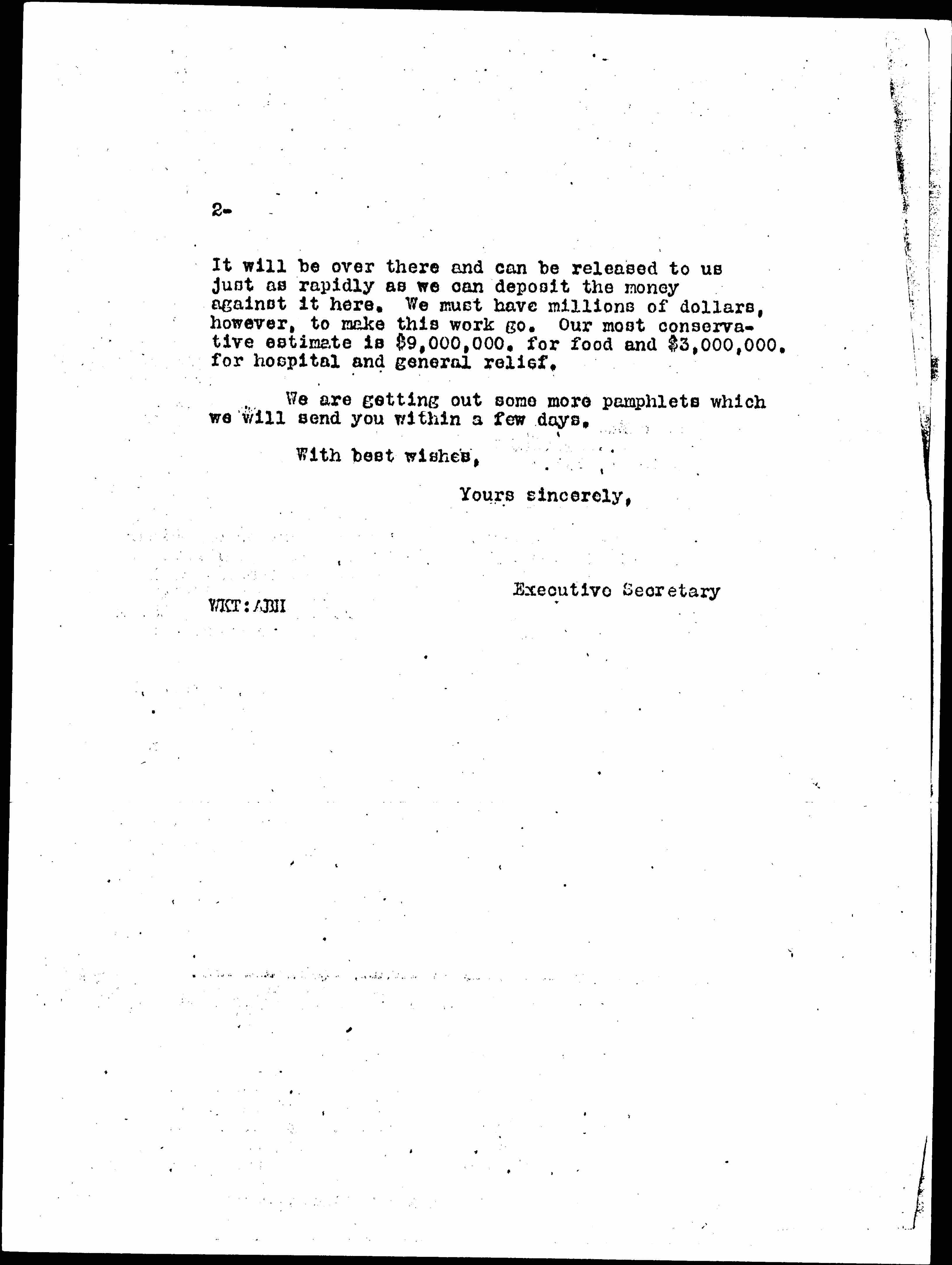 I am [enclosing] a copy of our orders to date which will show you how we have spent the first $500,000 which we have secured for the relief work, and also how the next $500,000. is to be spent. The orders for this food are placed. The first $500,000. worth has been shipped, and the next $500,000. worth is ordered and is now being gotten ready for shipment. Mr. Hoover will ship this second $500,000. worth of food in his own name. [page 2] It will be over there and can be released to us just as rapidly as we can deposit the money against it here. We must have millions of dollars, however, to make this work go. Our most conservative estimate is $9,000,000. for food and $3,000,000. for hospital and general relief.