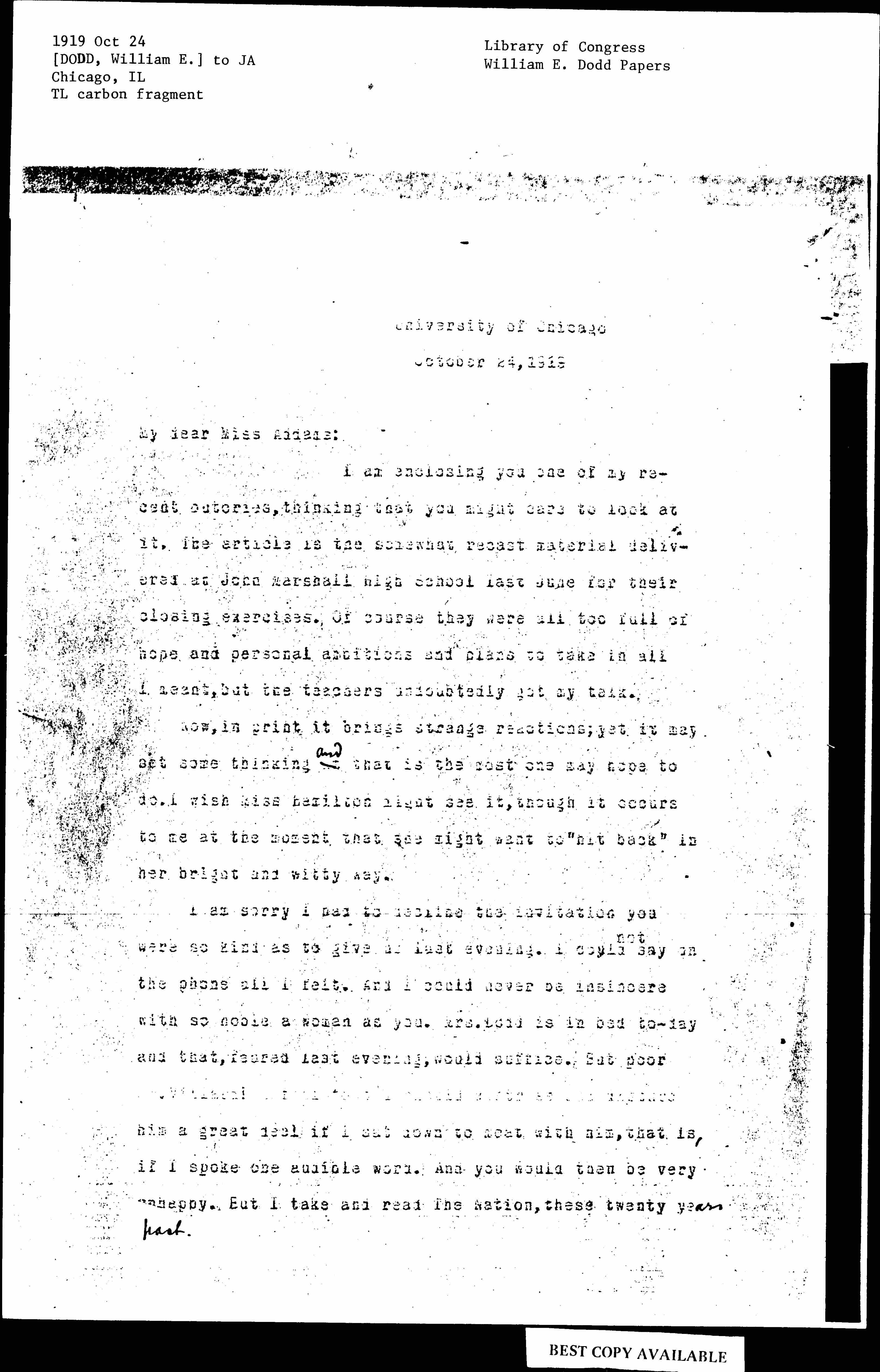 I am enclosing you one of my recent outcries, thinking that you might care to look at it. The article is the somewhat recast material delivered at John Marshall high school last June for their closing exercises. Of course they were all too full of hope and personal ambitions and plans to take in all I meant, but the teachers undoubtedly got my talk.