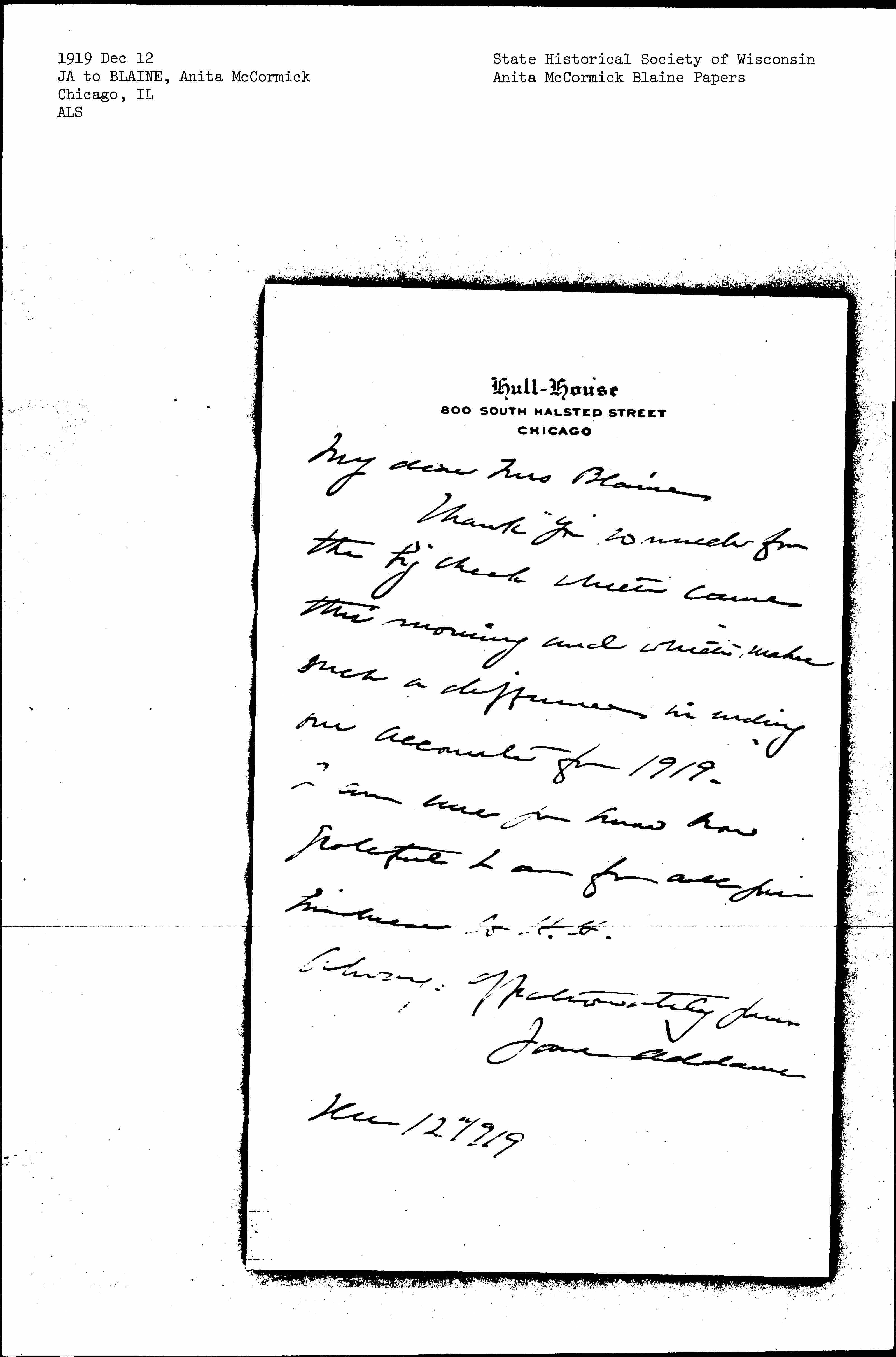 Thank you so much for the big check which came this morning and which makes such a difference in ending our accounts for 1919. I am sure you know how grateful I am for all your kindness to H.H.