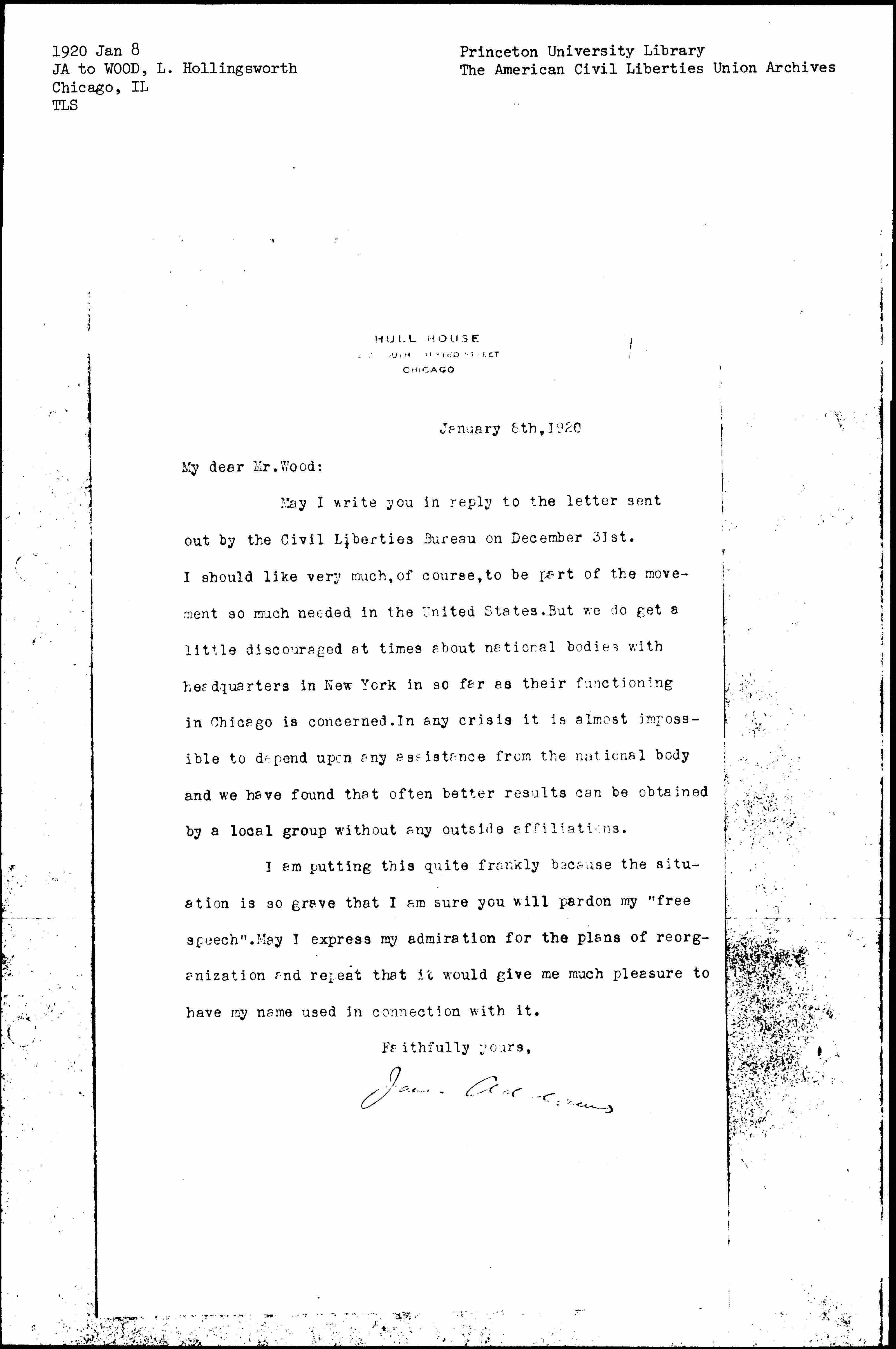 May I write you in reply to the letter sent out by the Civil Liberties Bureau on December 31st. I should like very much, of course, to be part of the movement so much needed in the United States. But we do get a little discouraged at times about national bodies with headquarters in New York in so far as their functioning in Chicago is concerned. In any crisis it is most almost impossible to depend upon any assistance from the national body and we have found that often better results can be obtained by a local group without any outside affiliations.