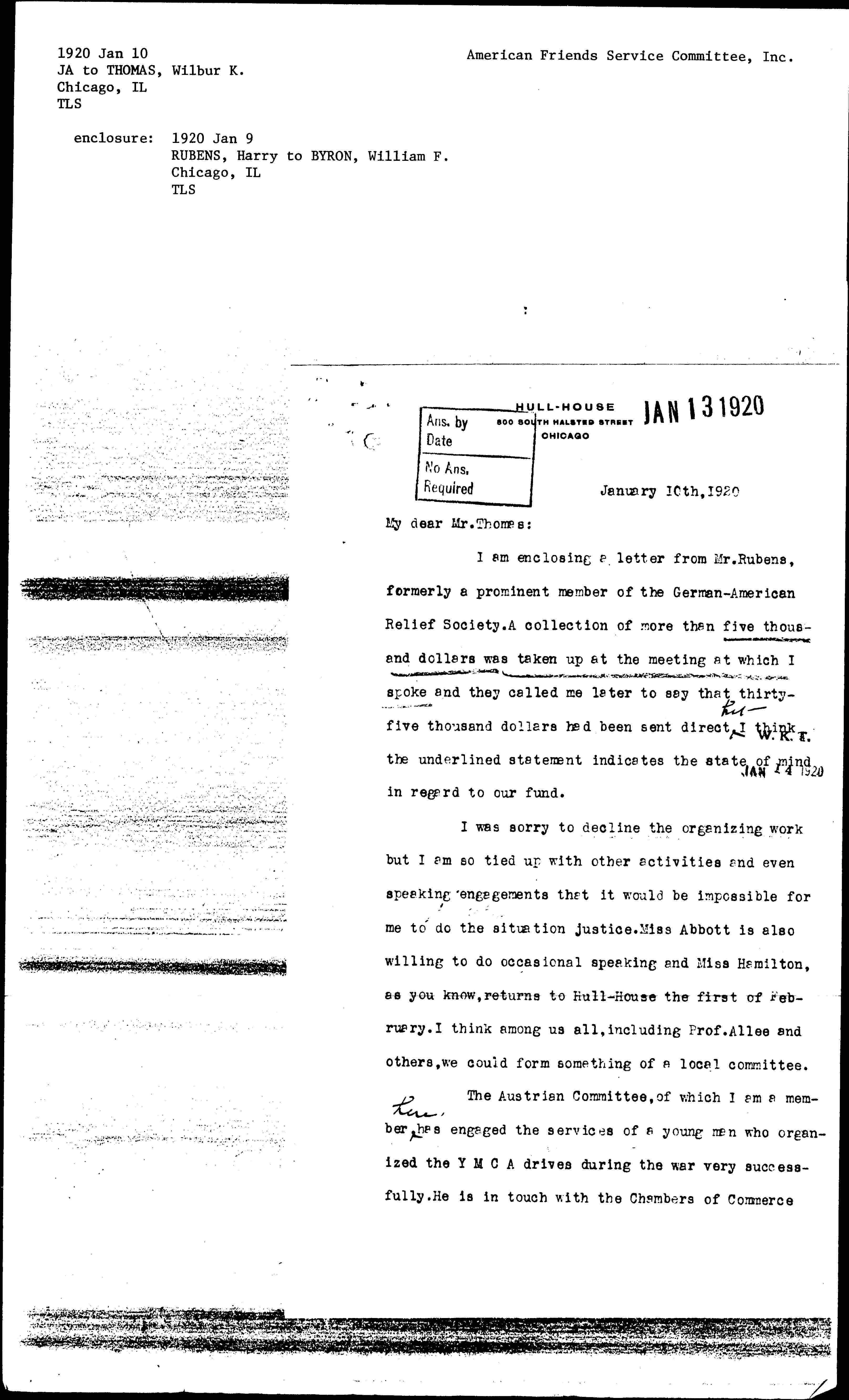 I am enclosing a letter from Mr. Rubens, formerly a prominent member of the German-American Relief Society. A collection of more than five thousand dollars was taken up at the meeting at which I spoke and they called me later to say that thirty-five thousand dollars had been sent direct ↑but↓ I think the underlined statement indicates the state of mind in regard to our fund.