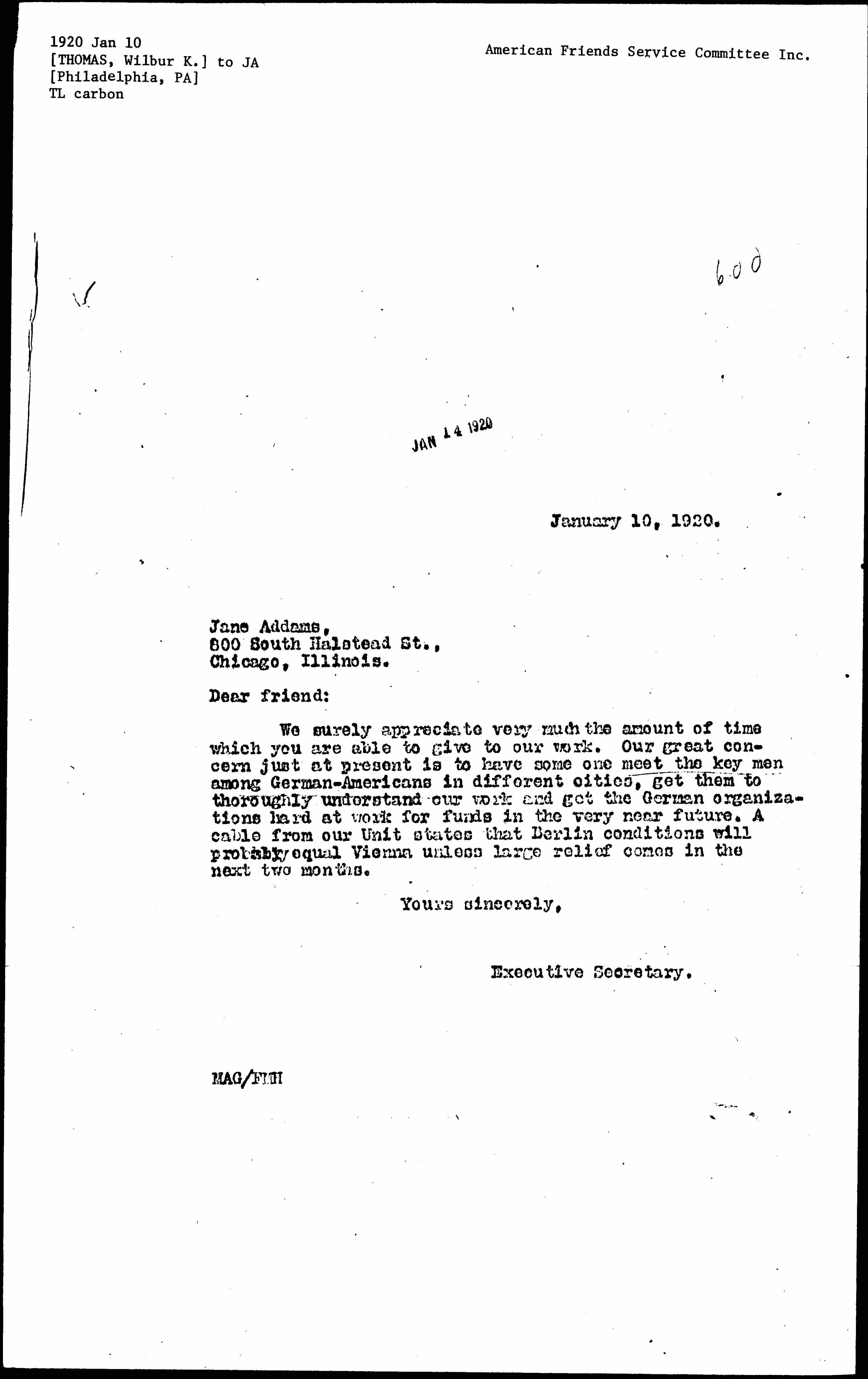 We surely appreciate very much the amount of time which you are able to give to our work. Our great concern just at present is to have some one meet the key men among German-Americans in different cities, get them to thoroughly understand our work and get the German organizations hard at work for funds in the very near future. A cable from our Unit states that Berlin conditions will probably equal Vienna unless large relief comes in the next two months.