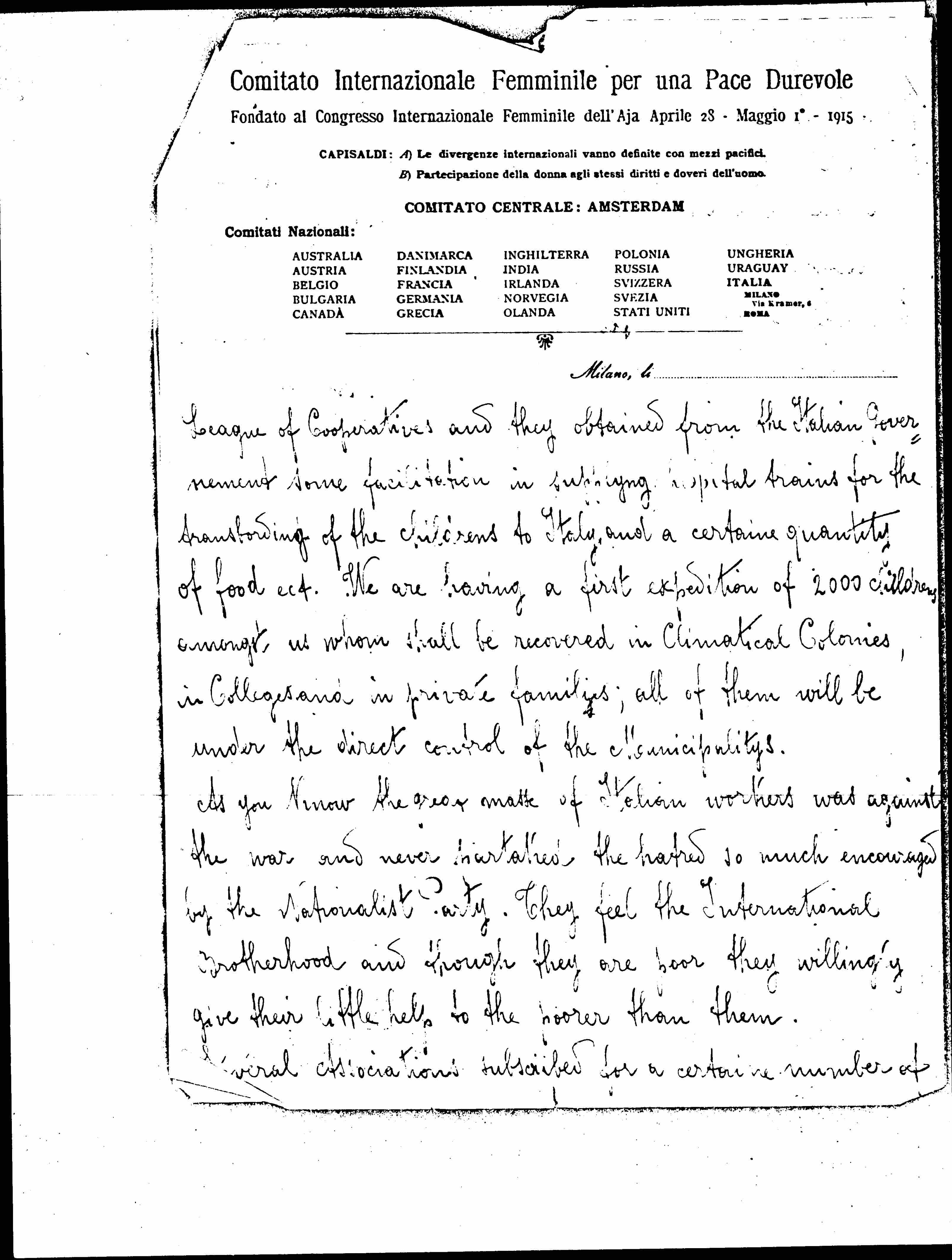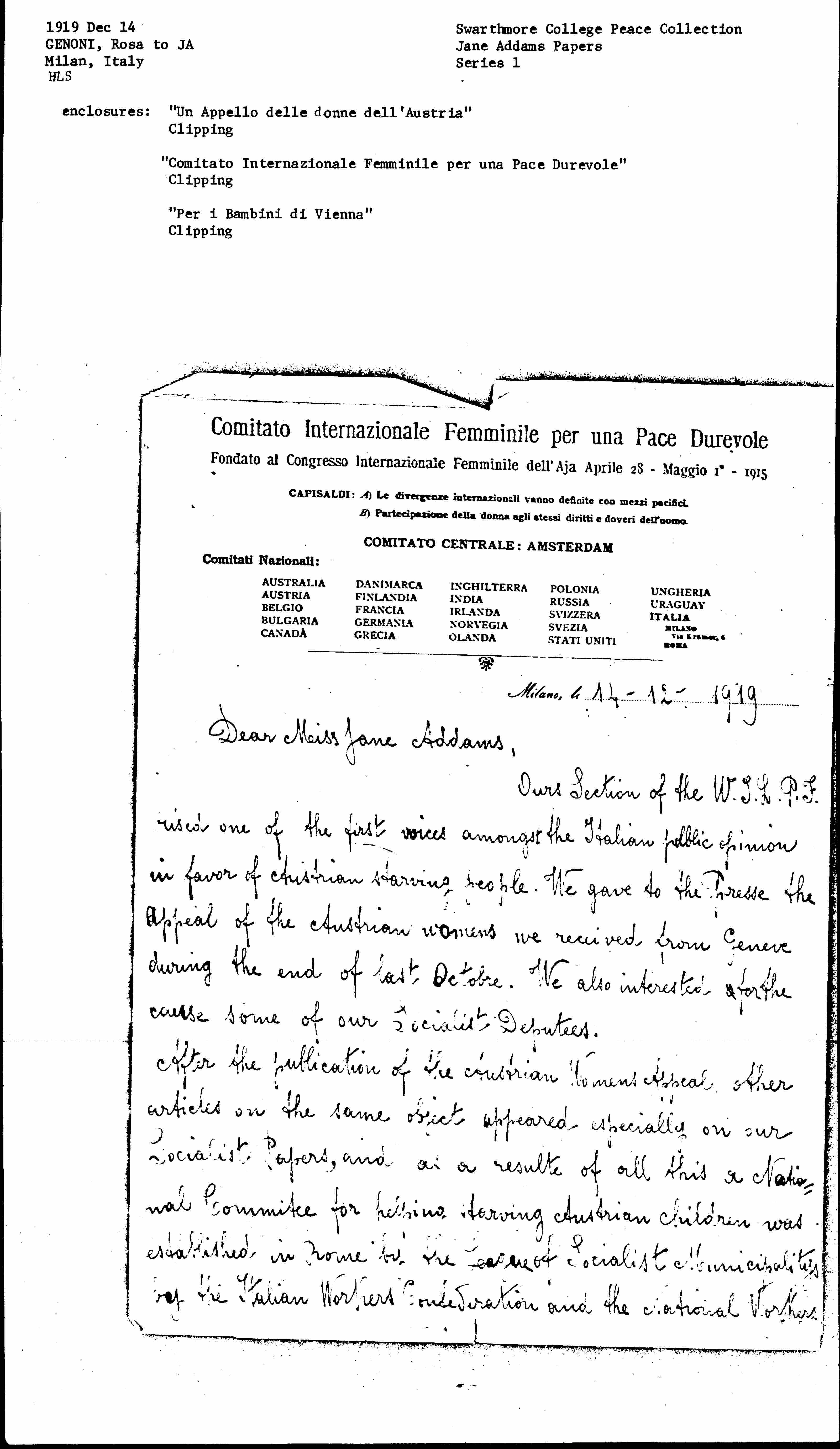 [Our] section of the W.I.L.P.F. used one of the first voices amongst the Italian public opinion in favor of Austrian starving people. We gave to the [press] the appeal of the Austrian womens we received from Geneve during the end of last [October]. We also interested for the cause some of our Socialist [Deputies].