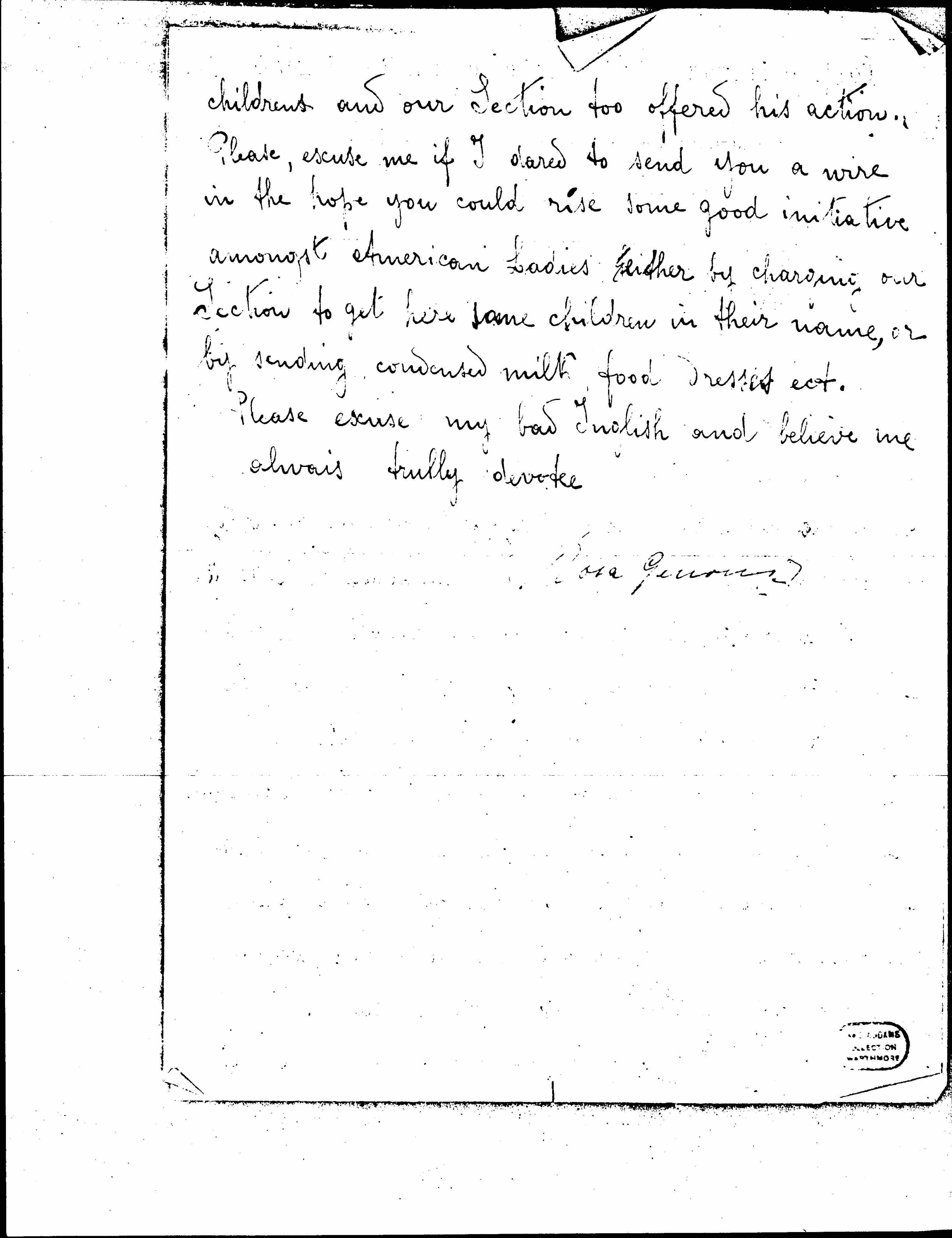 Several associations subscribed for a certain number of [page 3] [children] and our Section too offered his action. Please, [excuse] me if I dared to send you a wire in the hope you could rise some good initiative amongst American Ladies either by charging our Section to get here some children in their name, or by sending condensed milk food dresses [etc.]