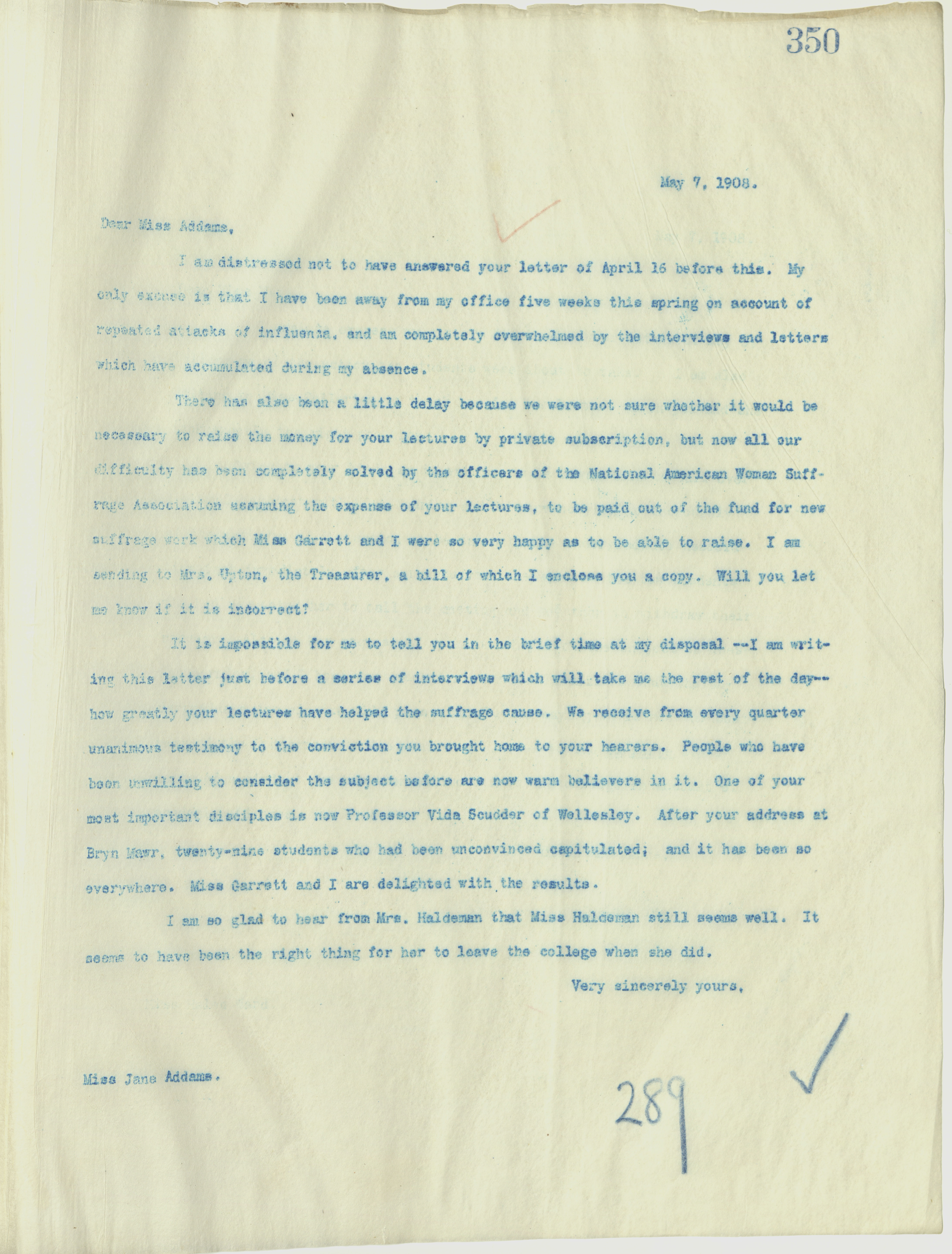 It is impossible for me to tell you in the brief time at my disposal -- I am writing this letter just before a series of interviews which will take me the rest of the day -- how greatly your lectures have helped the suffrage cause. We receive from every quarter unanimous testimony to the conviction you brought home to your hearers. People who have been unwilling to consider the subject before are now warm believers in it. One of your most important disciples is now Professor Vida Scudder of Wellesley. After your address at Bryn Mawr, twenty-nine students who had been unconvinced capitulated; and it has been so everywhere. Miss Garrett and I are delighted with the results.