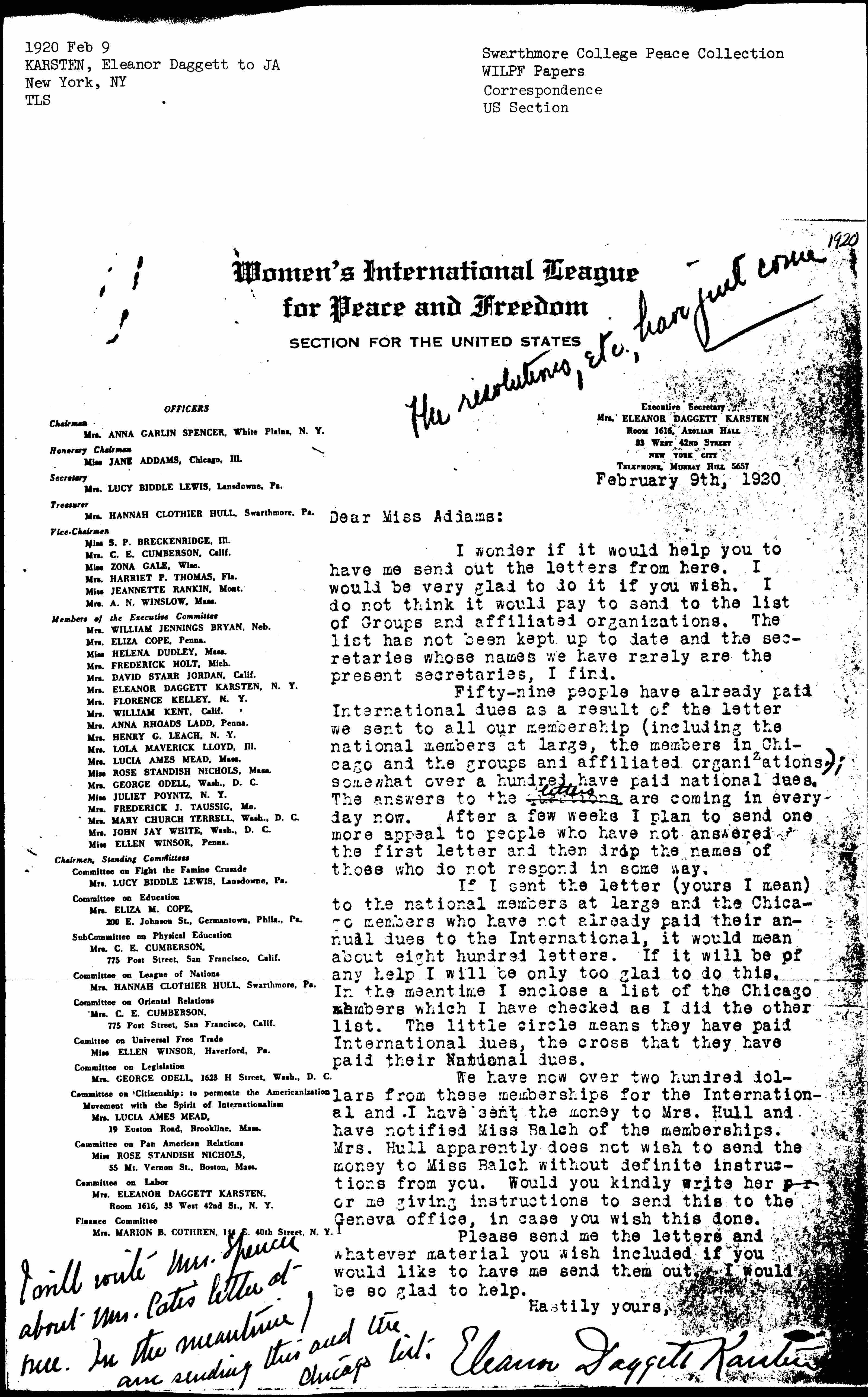 We have now over two hundred dollars from these memberships for the International and I have sent the money to Mrs. Hull and have notified Miss Balch of the memberships. Mrs. Hull apparently does not wish to send the money to Miss Balch without definite instructions from you. Would you kindly write her or me giving instructions to send this to the Geneva office, in case you wish this done.