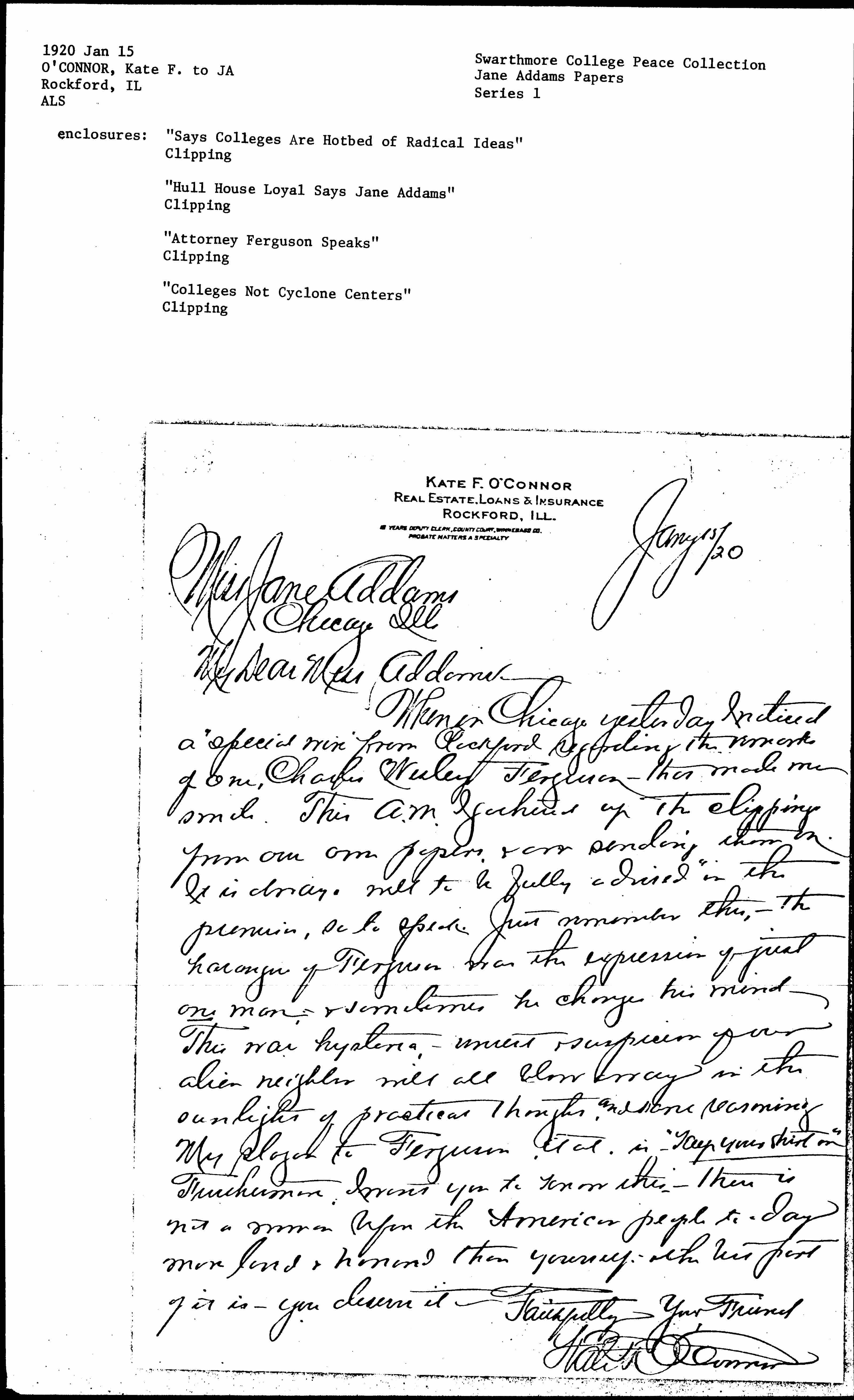 When in Chicago yesterday I noticed a "special wire" from Rockford regarding the remark of one, Charles Wesley Ferguson -- that made me smile. This A.M. I gathered up the clippings from our own papers, & am sending them on. It is always well to be fully advised "in the premises," so to speak. Just remember this, -- the harangue of Ferguson was the expression of just one man & sometimes he changes his mind. This war hysteria, -- unrest & suspicion of our alien neighbor will all blow away in the sunlight of practical [thought], and sane reasoning. My slogan to Ferguson et al. is "Keep your shirt on." Furthermore, I want you to know this, -- there is not a woman upon the American people [today] more loved & honored than yourself -- the best part of it is -- you deserve it --