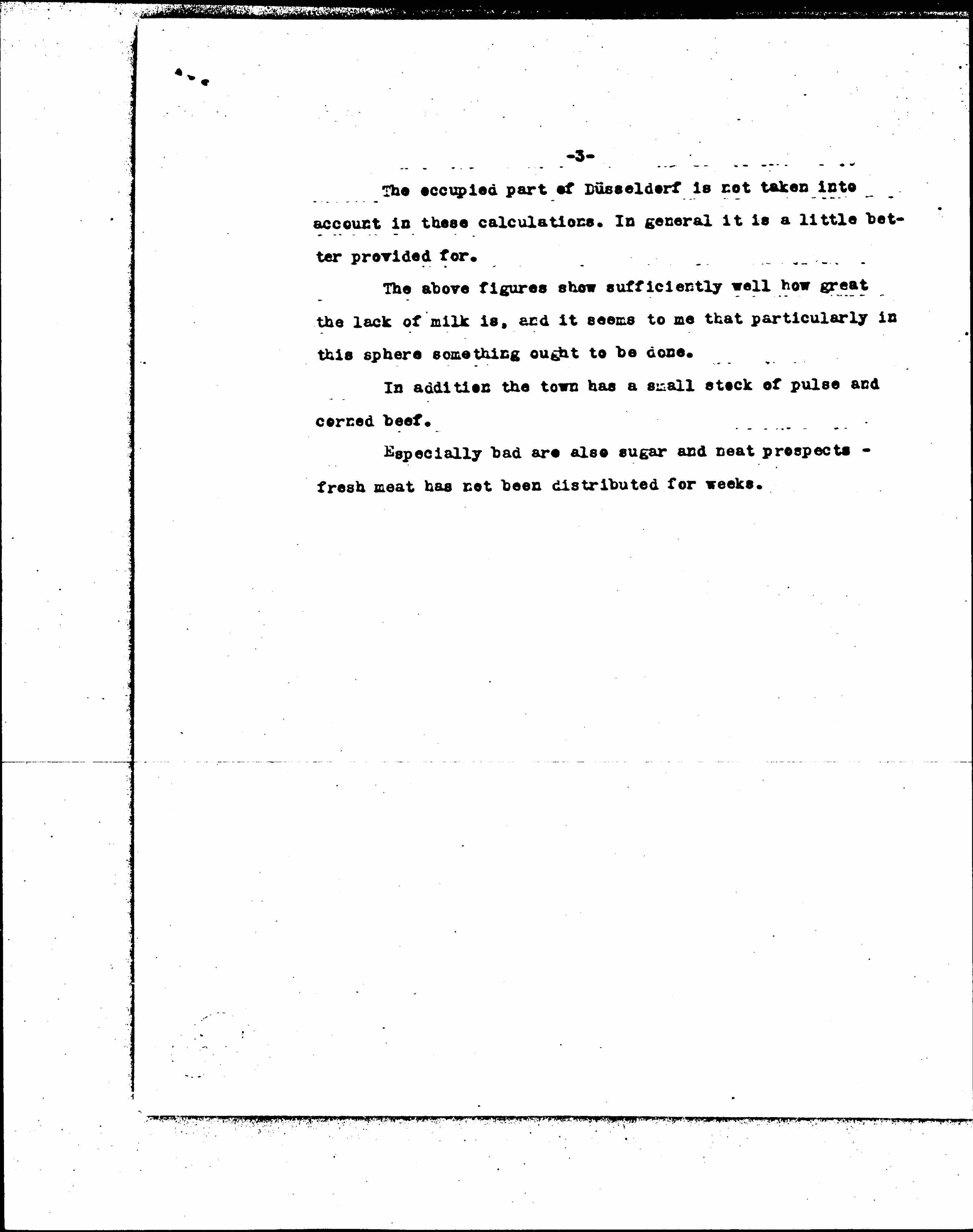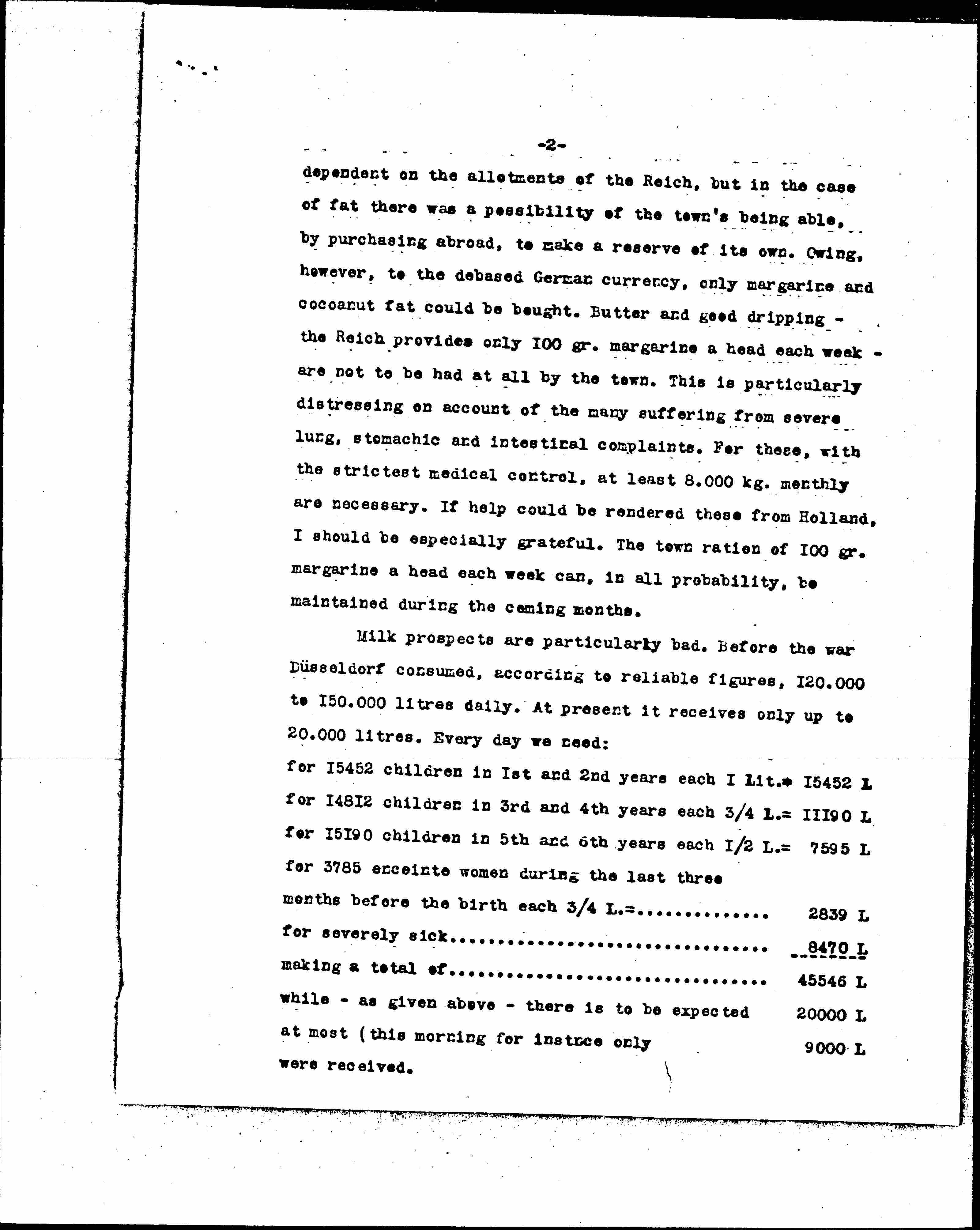 Milk prospects are particularly bad. Before the war Düsseldorf consumed, according to reliable figures, 120,000 to 150,000 [liters] daily. At present it receives only up to 20,000 [liters]. Every day we need: