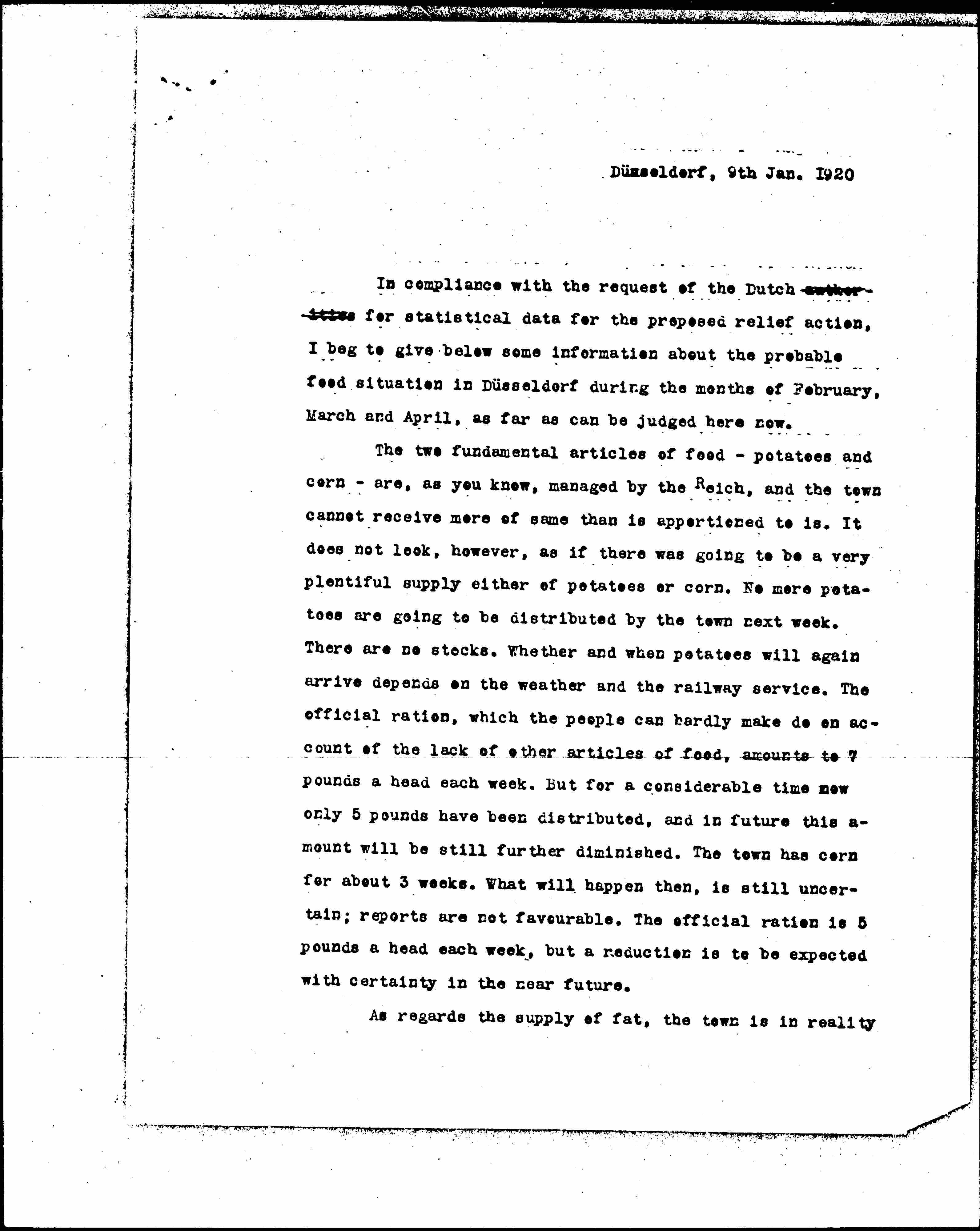 The two fundamental articles of food -- potatoes and corn -- are, as you know, managed by the Reich, and the town cannot receive more of same than is apportioned to [it]. It does not look, however, as if there was going to be a very plentiful supply either of potatoes or corn. No more potatoes are going to be distributed by the town next week. There are no stocks. Whether and when potatoes will again arrive depends on the weather and the railway service. The official ration, which the people can hardly make do on account of the lack of other articles of food, amounts to 7 pounds a head each week. But for a considerable time now only 5 pounds have been distributed, and in future this amount will be still further diminished. The town has corn for about 3 weeks. What will happen then, is still uncertain; reports are not [favorable]. The official ration is 5 pounds a head each week, but a reduction is to be expected with certainty in the near future.