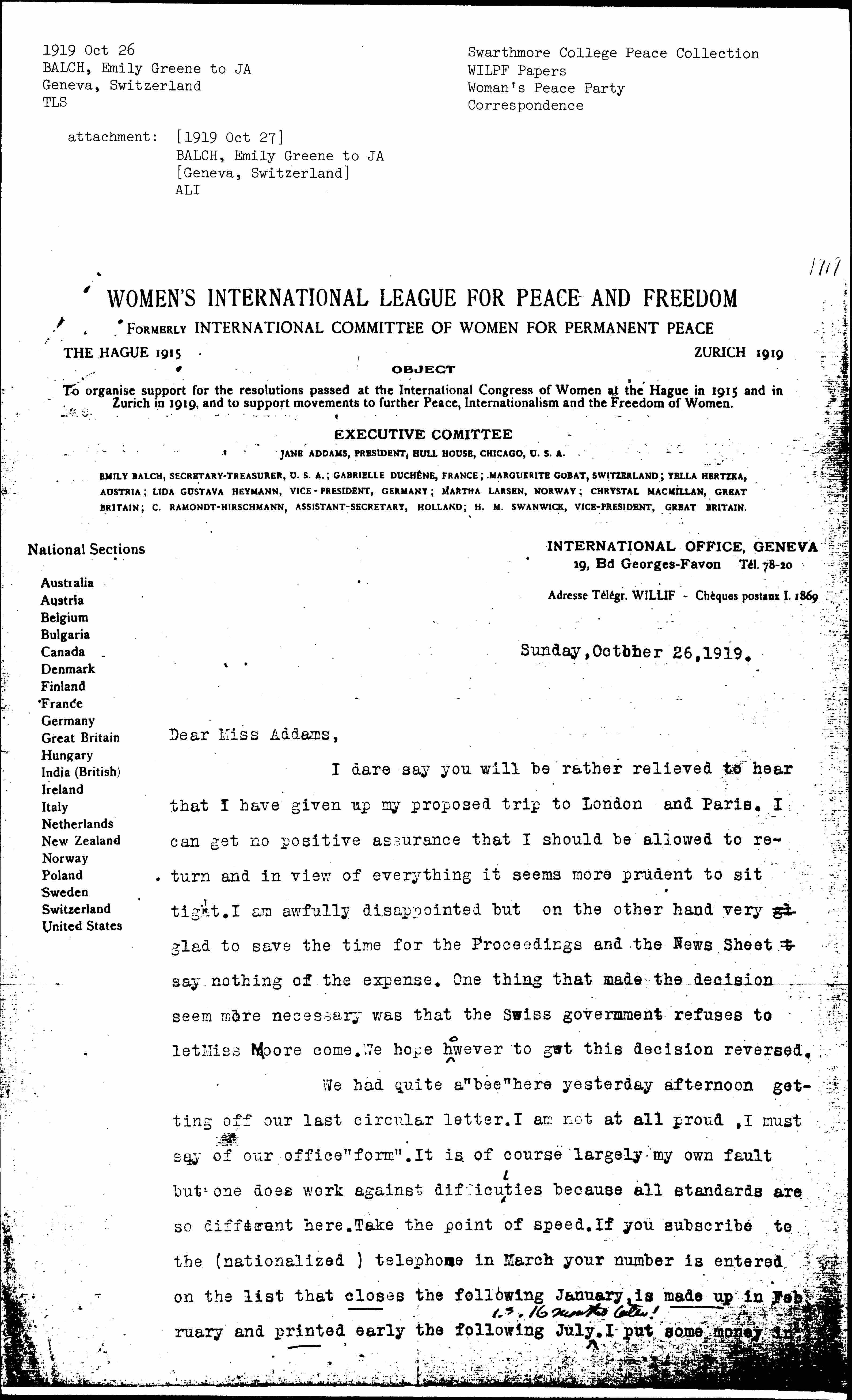 I dare say you will be rather relieved to hear that I have given up my proposed trip to London and Paris. I can get no positive assurance that I should be allowed to return and in view of everything it seems more prudent to sit tight. I am awfully disappointed but on the other hand very glad to save the time for the Proceedings and the News Sheet say nothing of the expense. One thing that made the decision seem more necessary was that the Swiss government refuses to let Miss Moore come. We hope however to get this decision reversed.