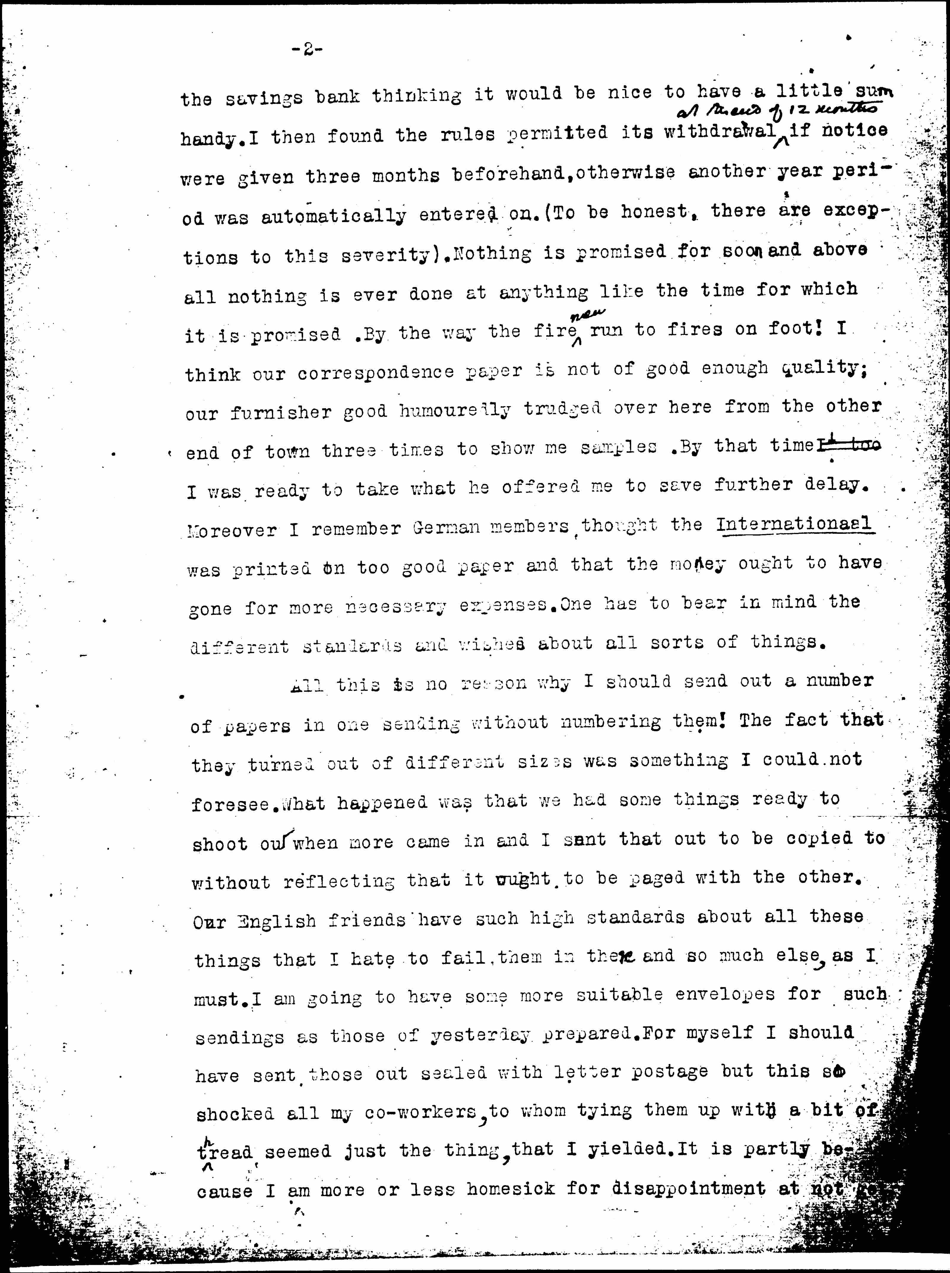 We had quite a "bee" here yesterday afternoon getting off our last circular letter. I am not at all proud, I must say of our office "form". It is of course largely my own fault but one does work against difficulties because all standards are so different here. Take the point of speed. If you subscribe to the (nationalized) telephone in March your number is entered on the list that closes the following January, is made up in February and printed early the following July ↑[i.e.?] 16 months later!↓ I put some money in [page 2] the savings bank thinking it would be nice to have a little sum handy. I then found the rules permitted its withdrawal ↑at the end of 12 months↓ if notice were given three months beforehand, otherwise another year period was automatically entered on. (To be honest, there are exceptions to this severity). Nothing is promised for soon and above all nothing is ever done at anything like the time for which it is promised. By the way the fire ↑men↓ run to fires on foot! I think our correspondence paper is not of good enough quality; our furnisher good [humoredly] trudged over here from the other end of town three times to show me samples. By that time I too I was ready to take what he offered me to save further delay. Moreover I remember German members thought the Internationaal was printed on too good paper and that the money ought to have gone for more necessary expenses. One has to bear in mind the different standards and wishes about all sorts of things.