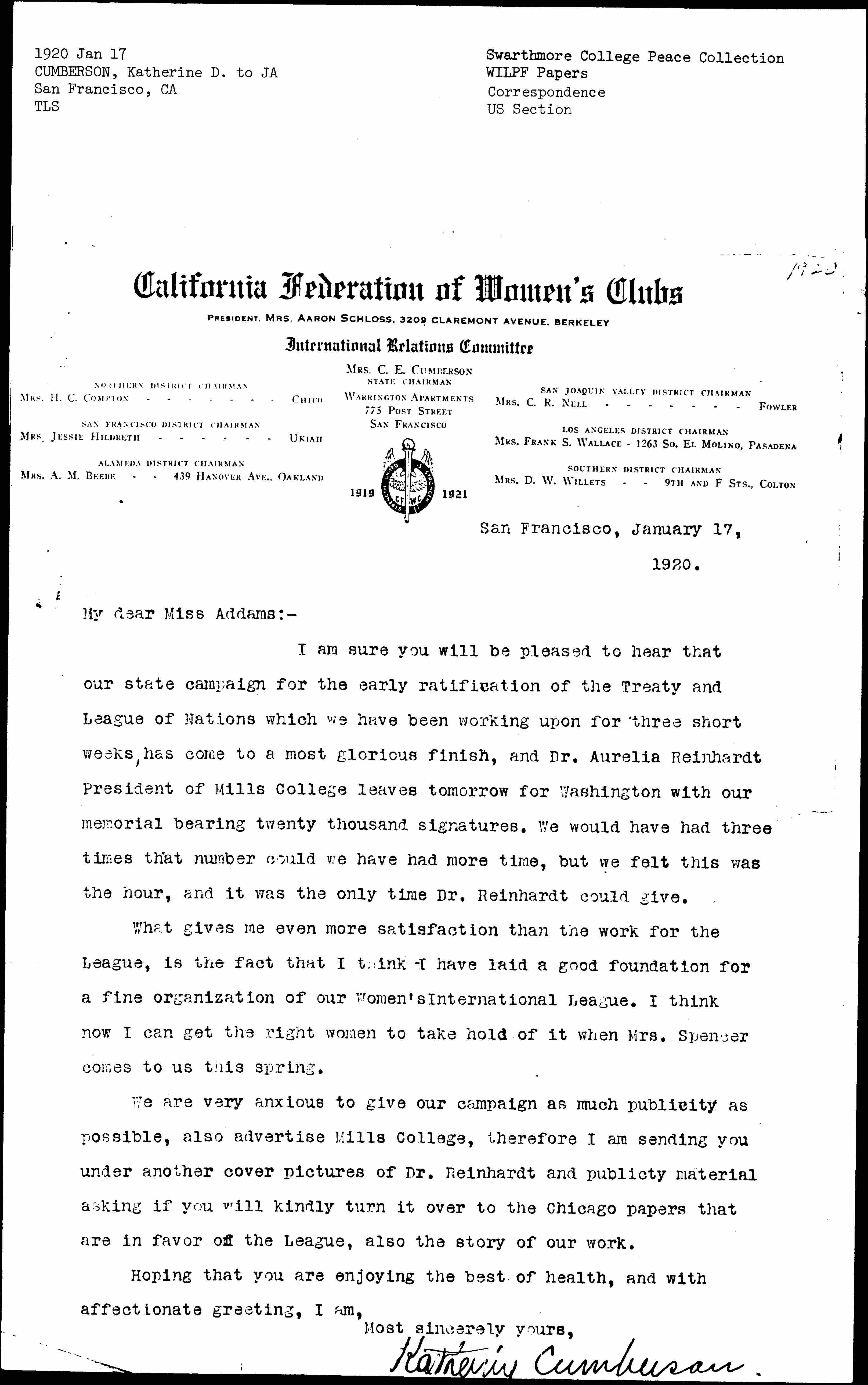I am sure you will be pleased to hear that our state campaign for the early ratification of the Treaty and League of Nations which we have been working upon for three short weeks, has come to a most glorious finish, and Dr. Aurelia Reinhardt President of Mills College leaves tomorrow for Washington with our memorial bearing twenty thousand signatures. We would have had three times that number could we have had more time, but we felt this was the hour, and it was the only time Dr. Reinhardt could give.