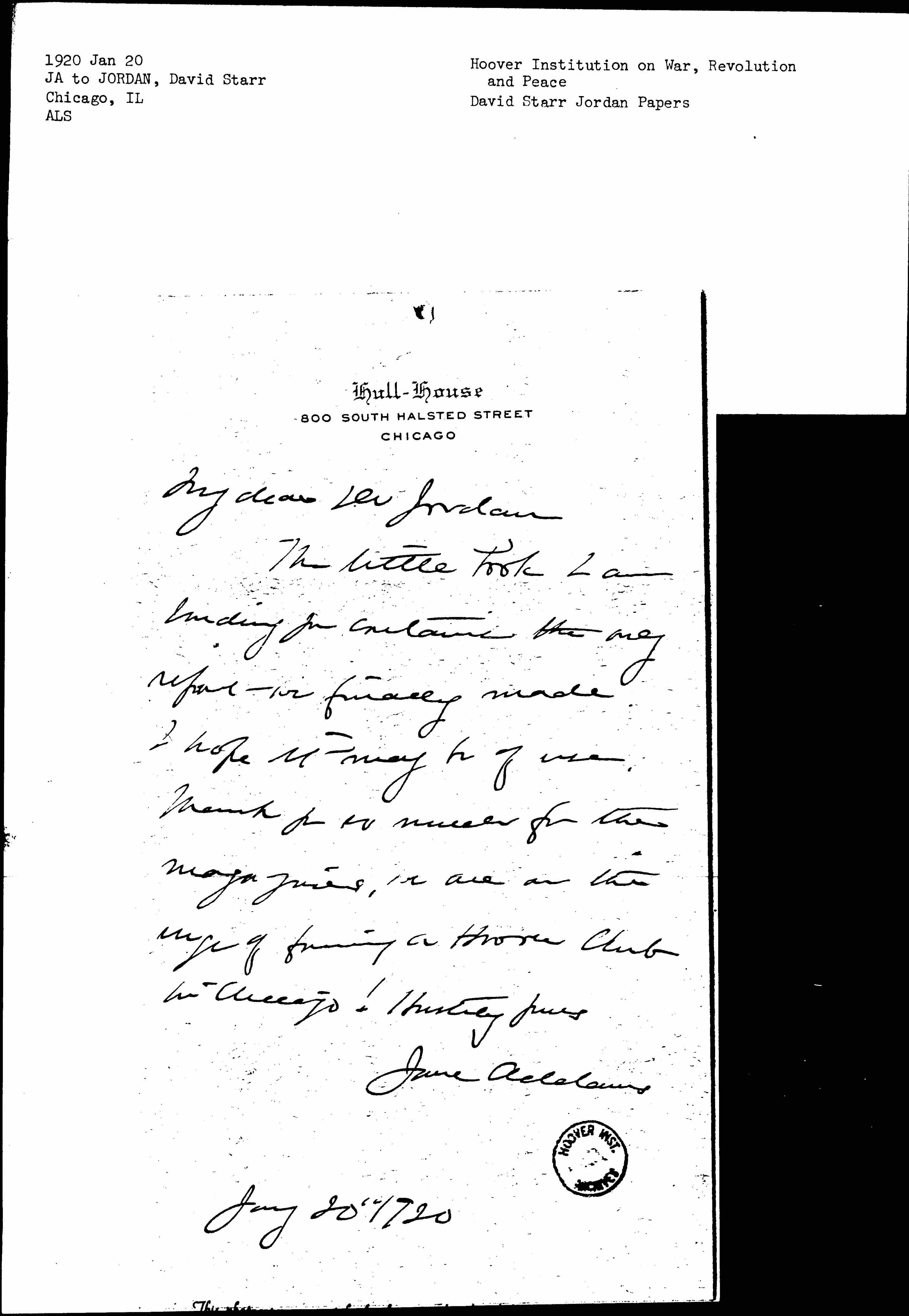 The little book I am sending you contains the only report we finally made. I hope it may be of use. Thank you so much for the magazines, we are on the verge of forming a Hoover Club in Chicago! Hastily yours