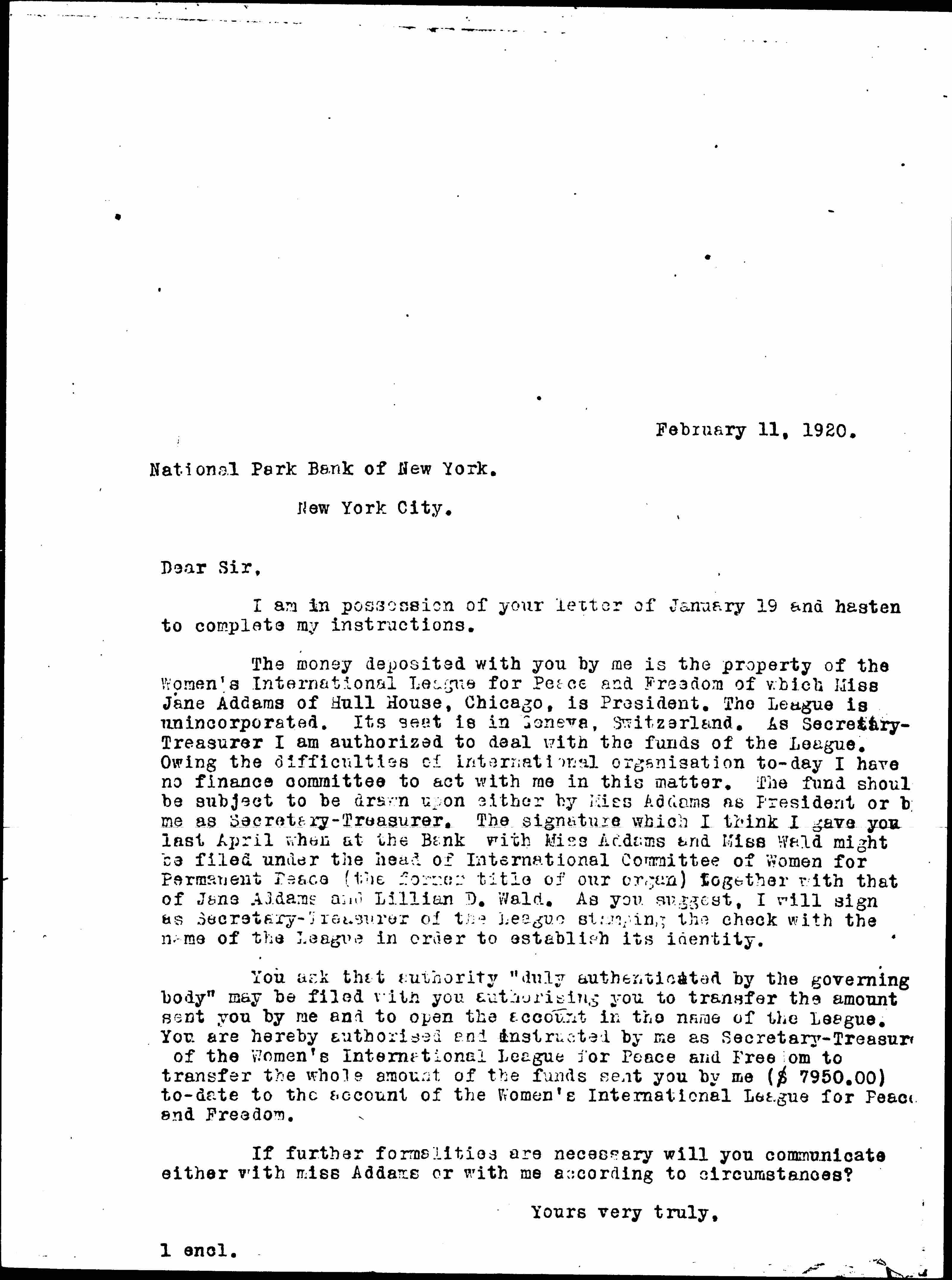 The money deposited with you by me is the property of the Women's International League for Peace and Freedom of which Miss Jane Addams of Hull House, Chicago, is President. The League is unincorporated. Its seat is in Geneva, Switzerland. As Secretary-Treasurer I am authorized to deal with the funds of the League. Owing the difficulties of international [organization today] I have no finance committee to act with me in this matter. The fund [should] be subject to be drawn upon either by Miss Addams as President or [by] me as Secretary-Treasurer. The signature which I think I gave you last April when at the Bank with Miss Addams and Miss Wald might be filed under the head of International Committee of Women for Permanent Peace (the former title of our organ) together with that of Jane Addams and Lillian D. Wald. As you suggest, I will sign as Secretary-Treasurer of the League stamping the check with the name of the League in order to establish its identity.