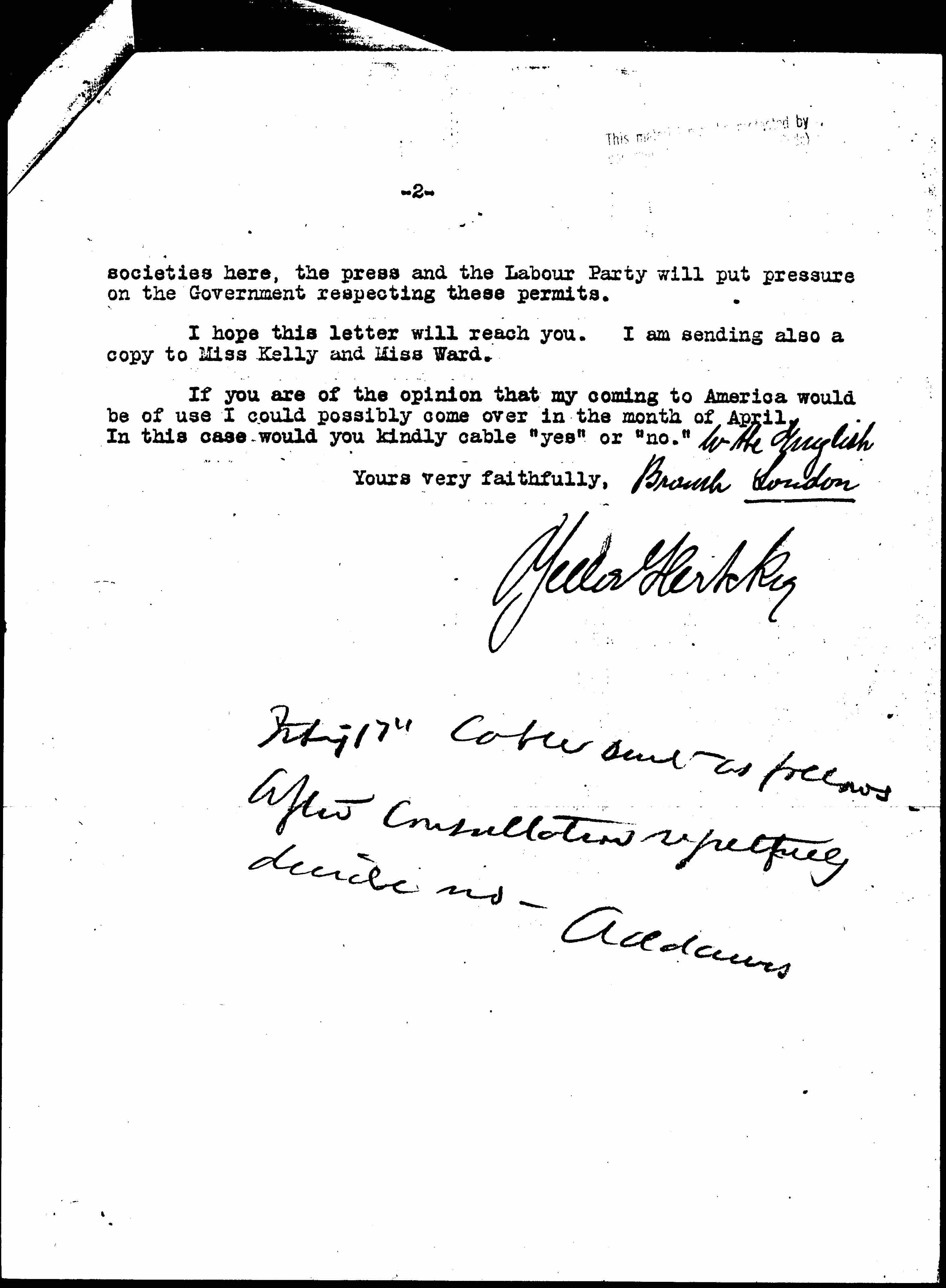 If you are of the opinion that my coming to America would be of use I could possibly come over in the month of April. In this case would you kindly cable "yes" or "no." ↑to the English Branch London↓