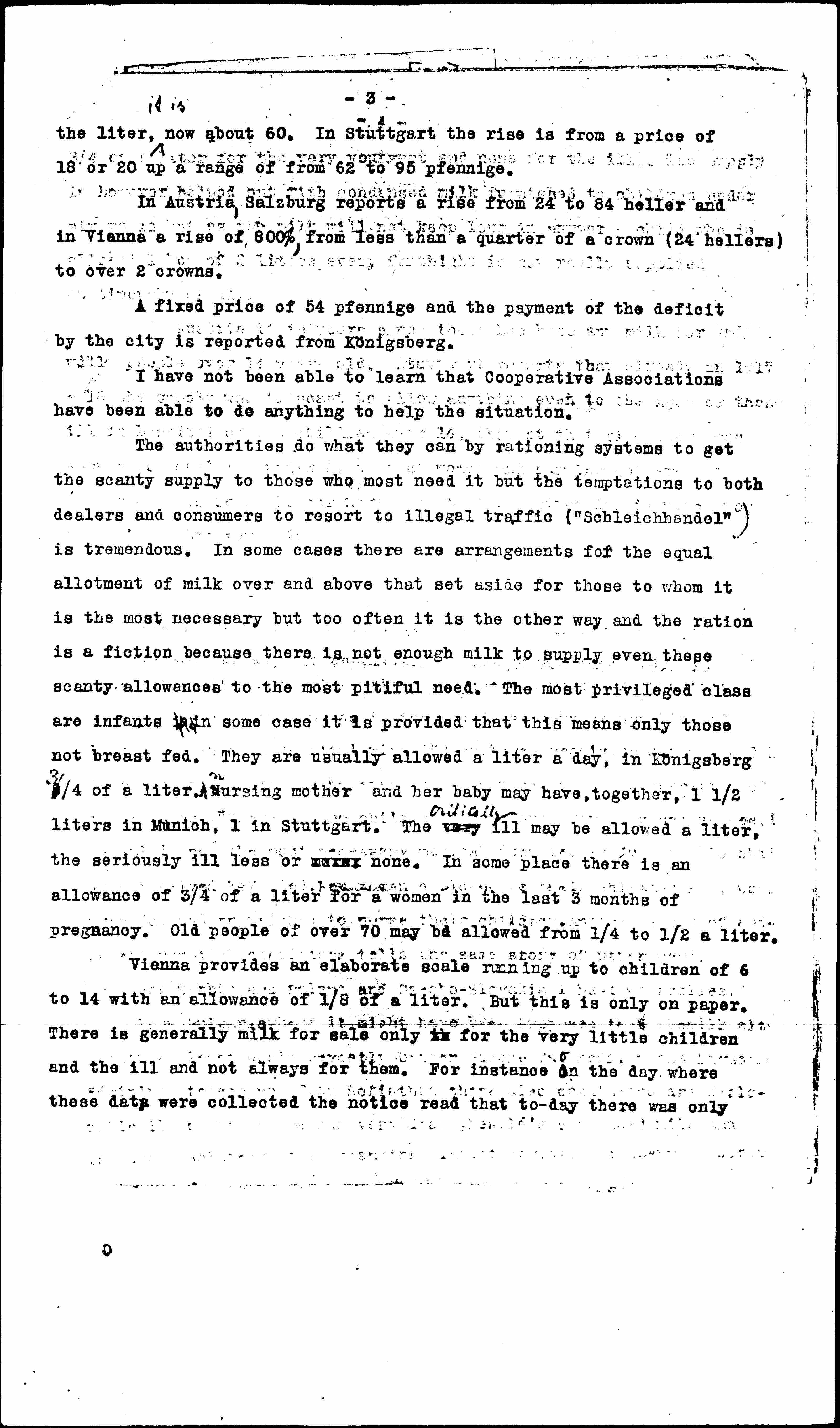 Complains are made also of quality. The Stuttgart report says that the fat content has fallen and ↑that↓ the milk keeps less well, as that coming from a distance is a long time en route owing to lack of coal. In the critical days of summer ↑[illegible]↓ some 4 quarts out of ten were ↑in↓ a really good condition, making it necessary to depend for infant's milk on dairies within the city. Such dairies have to buy feed and charge proportionately more for their milk.