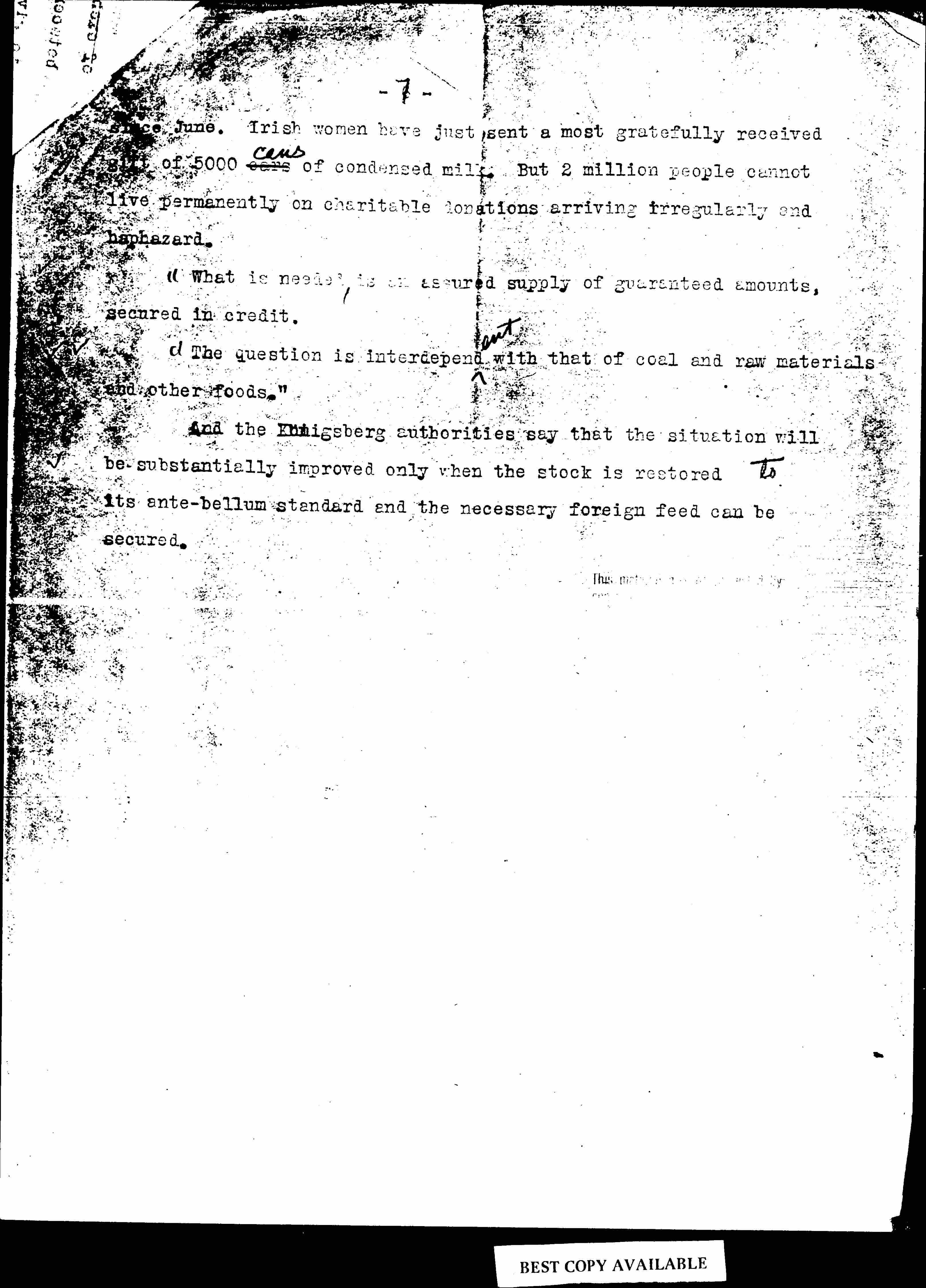 "Switzerland has made several free distributions of condensed milk. The American 'Hilfsaktion' has been giving help to children [page 7] since June. Irish women have just sent a most gratefully received gift of 5000 cars cans of condensed milk. But 2 million people cannot live permanently on charitable donations arriving irregularly and haphazard.