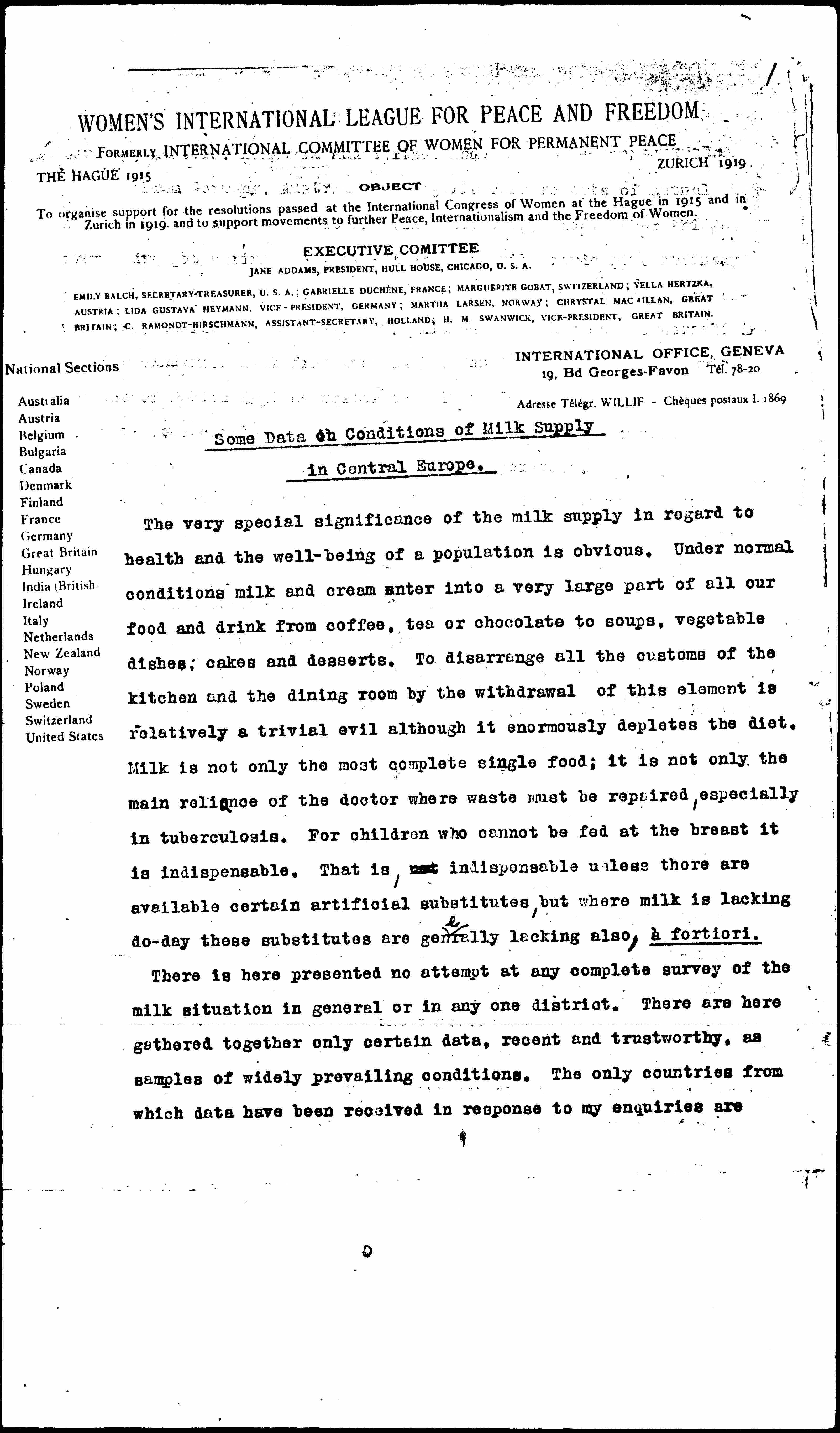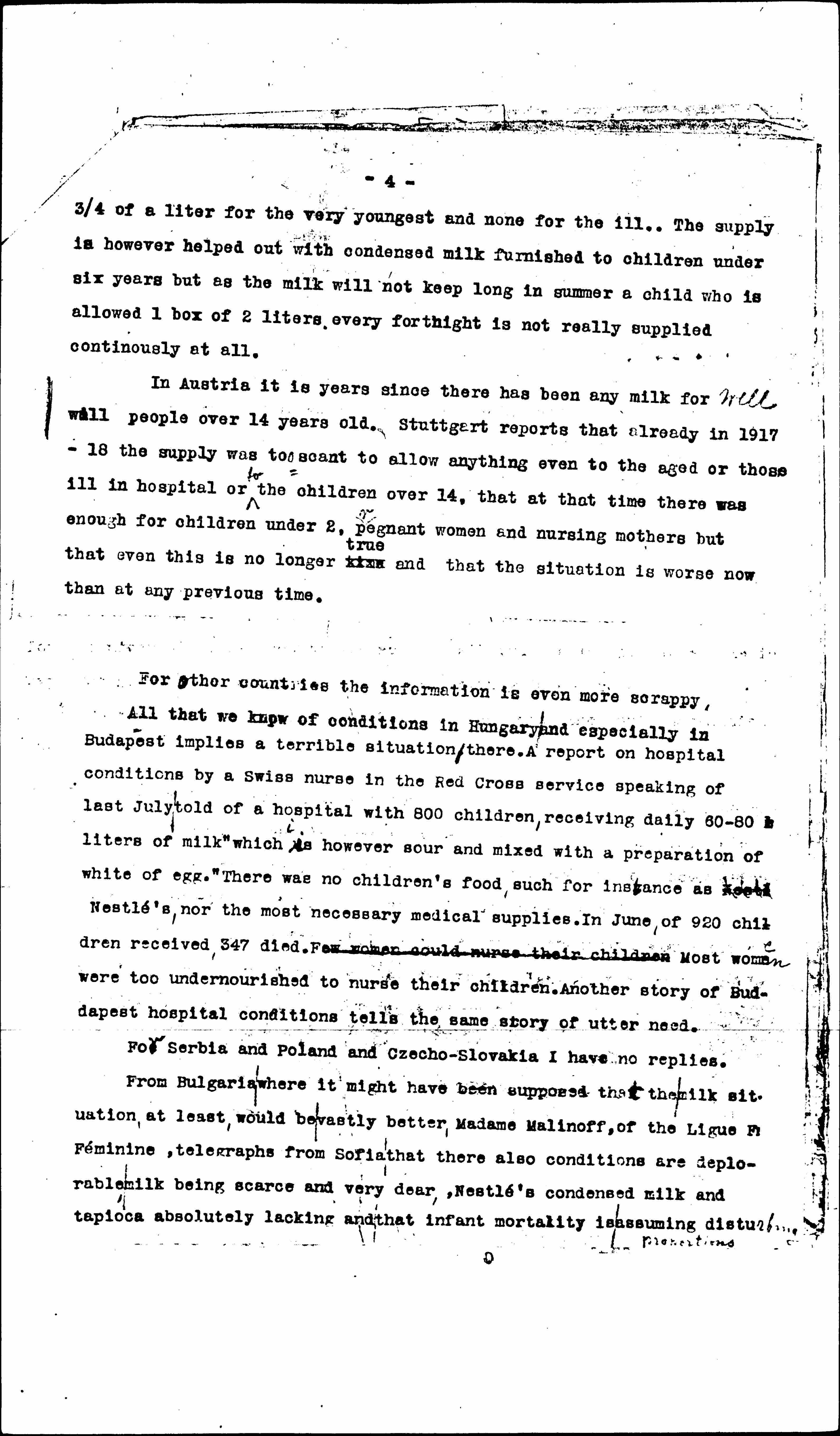 From Bulgaria where it might have been supposed that the milk situation, at least, would be vastly better, Madame Malinoff, of the Ligue Féminine, telegraphs from Sofia that there also conditions are deplorable, milk being scarce and very dear, Nestlé's condensed milk and tapioca absolutely lacking and that infant mortality is assuming [disturbing] ↑proportions↓. [page 5]