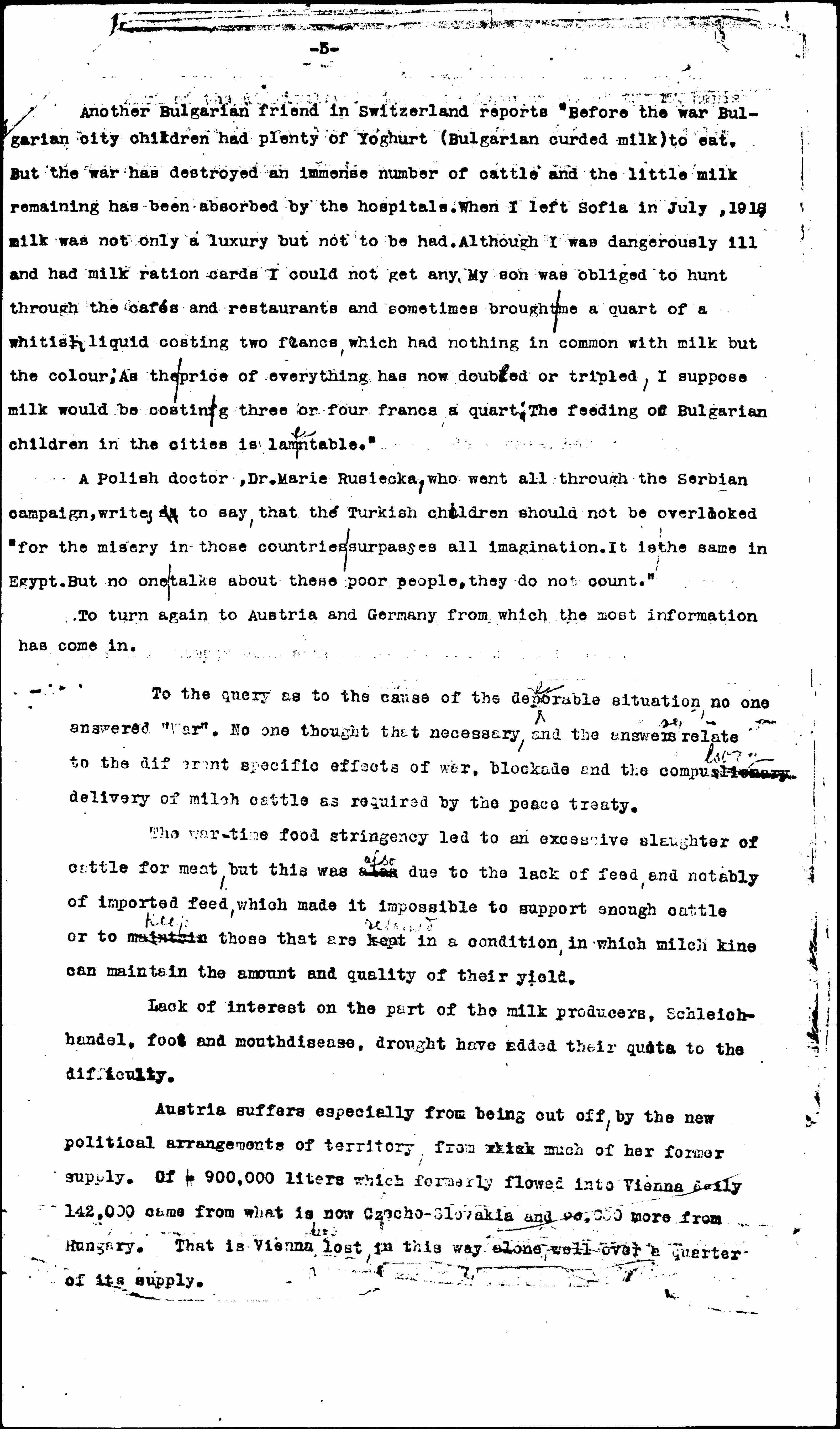 Another Bulgarian friend in Switzerland reports "Before the war Bulgarian city children had plenty of Yoghurt (Bulgarian curded milk) to eat. But the war has destroyed immense number of cattle and the little milk remaining has been absorbed by the hospitals. When I left Sofia in July, 1918, milk was not only a luxury but not to be had. Although I was dangerously ill and had milk ration cards I could not get any. My son was obliged to hunt through the cafés and restaurants and sometimes brought me a quart of a whitish liquid costing two francs, which had nothing in common with milk but the [color]! As the price of everything has now doubled or tripled, I suppose milk would be costing three or four francs a quart! The feeding of Bulgarian children in the cities is lamentable."
