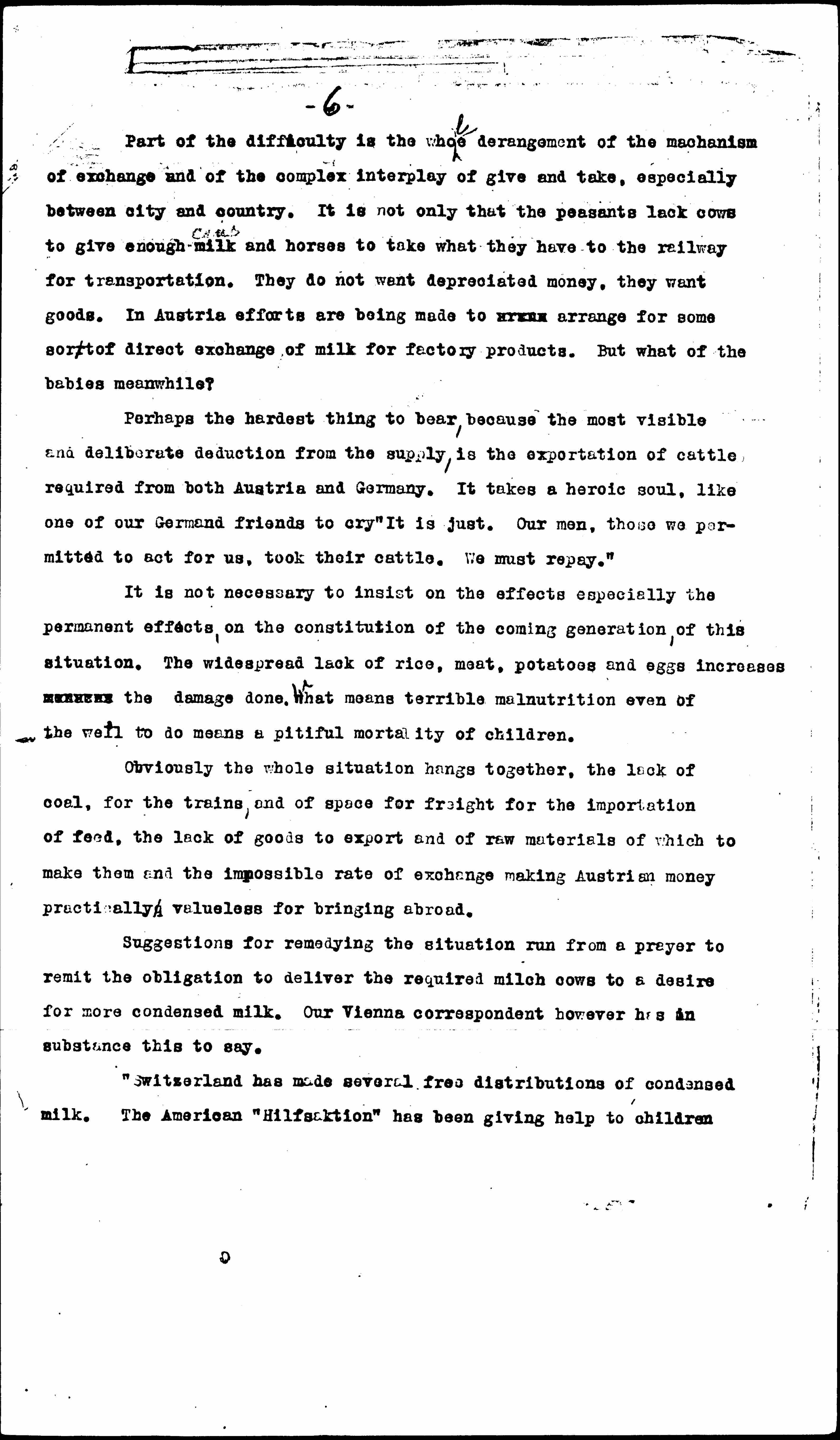 Part of the difficulty is the whole derangement of the [mechanism] of exchange and of the complex interplay of give and take, especially between city and country. It is not only that the peasants lack cows to give enough ↑cows↓ milk and horses to take what they have to the railway for transportation. They do not want depreciated money, they want goods. In Austria efforts are being made to arrange for some sort of direct exchange of milk for factory products. But what of the babies meanwhile?