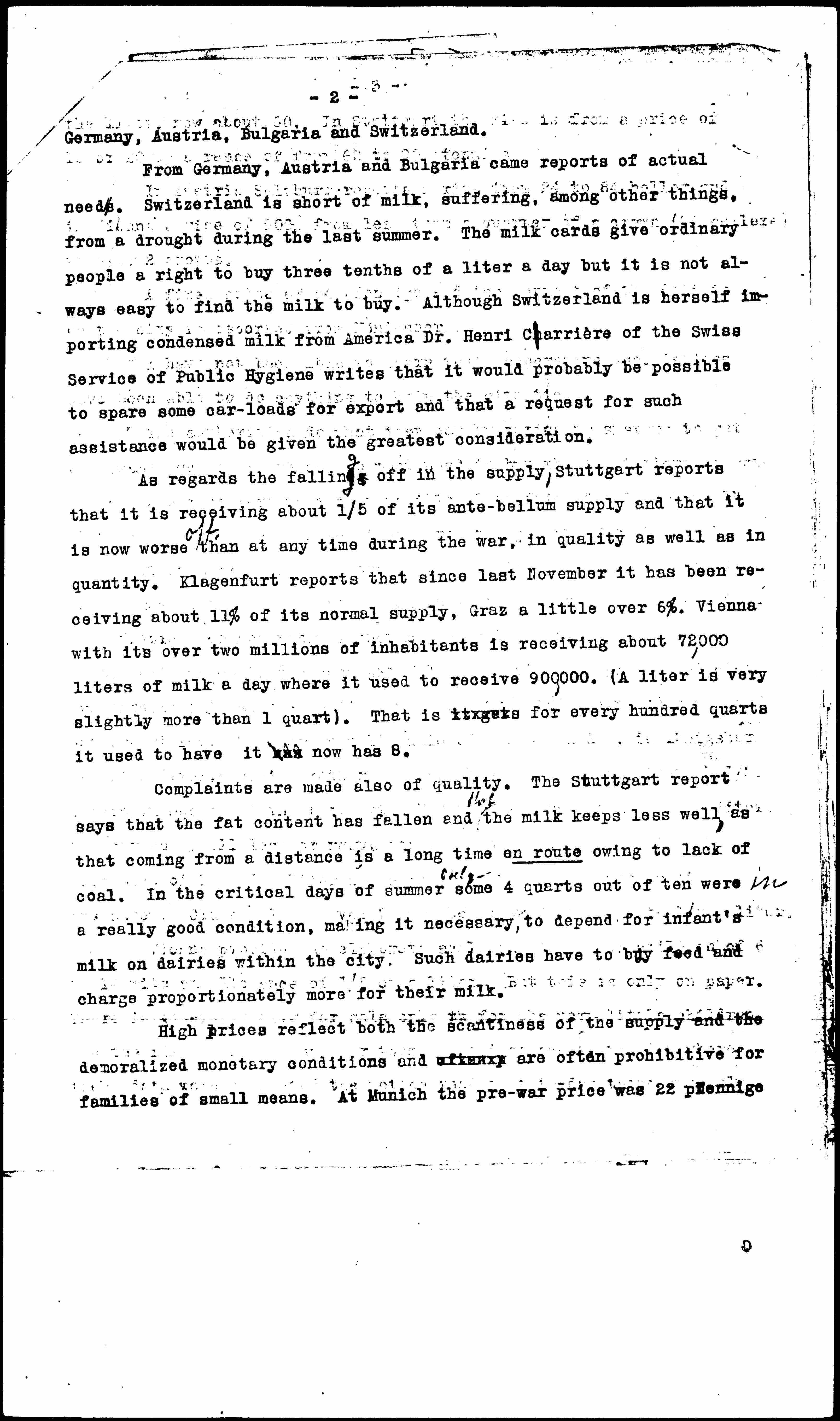 As regards the falling off in the supply, Stuttgart reports that it is receiving about 1/5 of its [antebellum] supply and that it is now worse ↑off↓ than at any time during the war, in quality as well as in quantity. Klagenfurt reports that since last November it has been receiving about 11% of its normal supply, Graz a little over 6%. Vienna with its over two millions of inhabitants is receiving about 72,000 liters of milk a day where it used to receive 900,000. (A liter is very slightly more than 1 quart). That is it gets for every hundred quarts it used to have it has now has 8.
