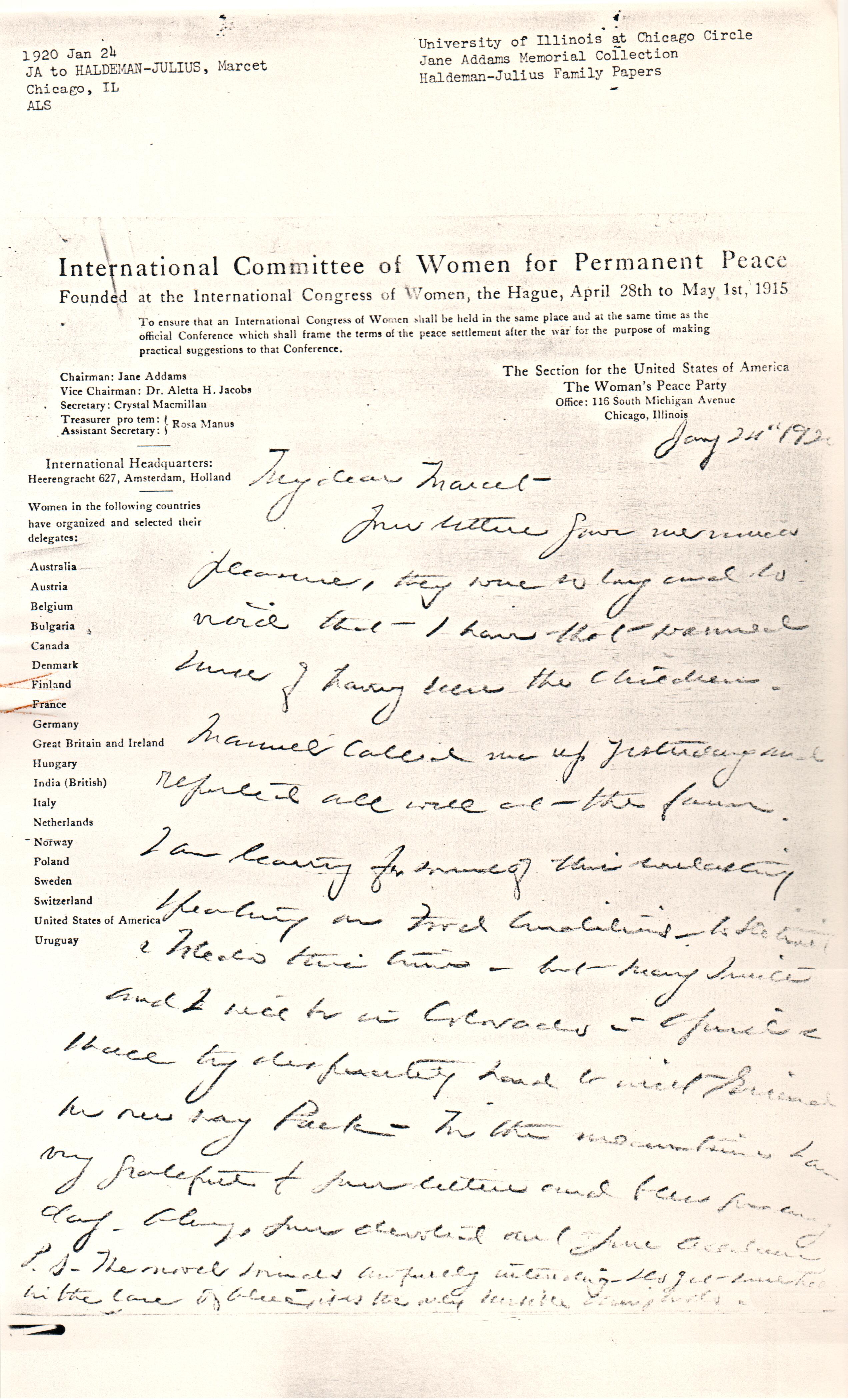 Manuel called me up yesterday and reported all well at the farm. I am leaving for some of this everlasting speaking on Food Conditions -- to Detroit & Toledo this time -- but Mary Smith and I will be in Colorado in April & I will try desperately hard to visit Girard on our way back. In the meantime I am very grateful for your letters and bless you every day. Always your devoted Aunt Jane Addams