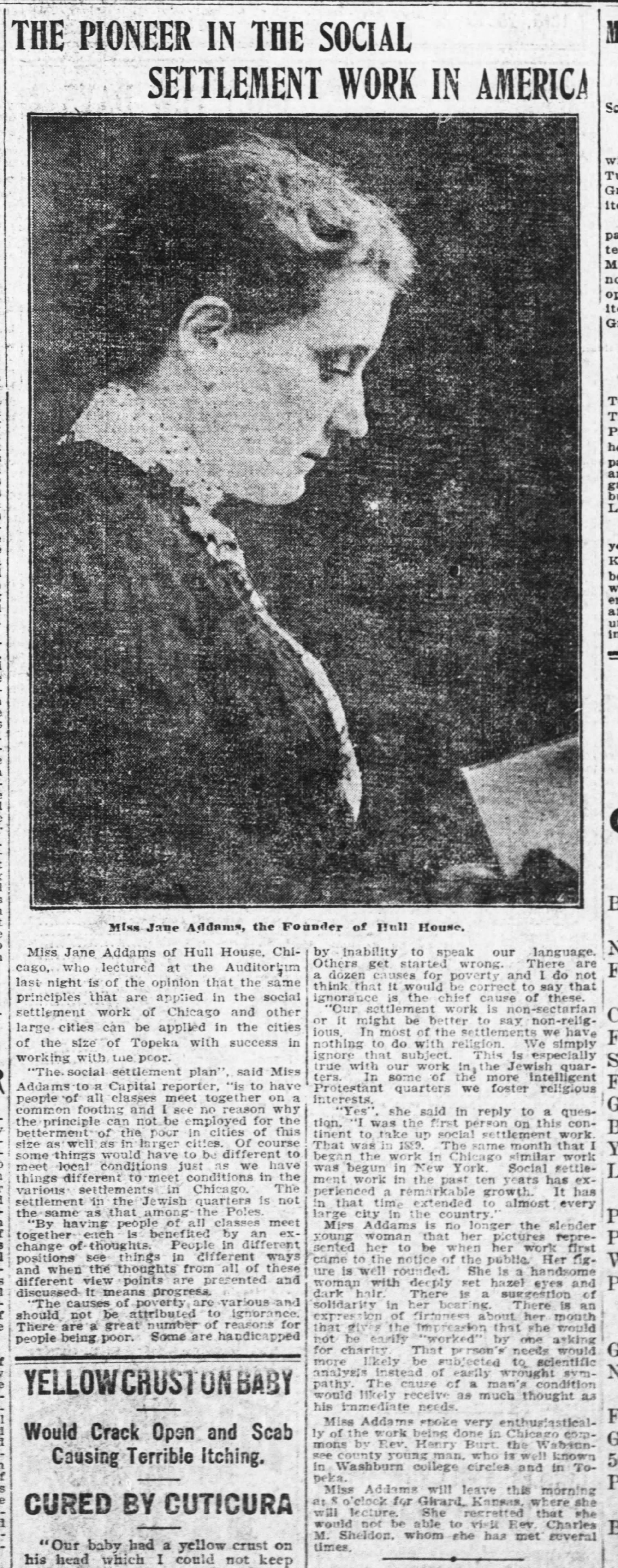 Miss Addams spoke very enthusiastically of the work being done in Chicago Commons by Rev. Henry Burt, the Wabaunsee County young man, who is well known in Washburn College circles and in Topeka.