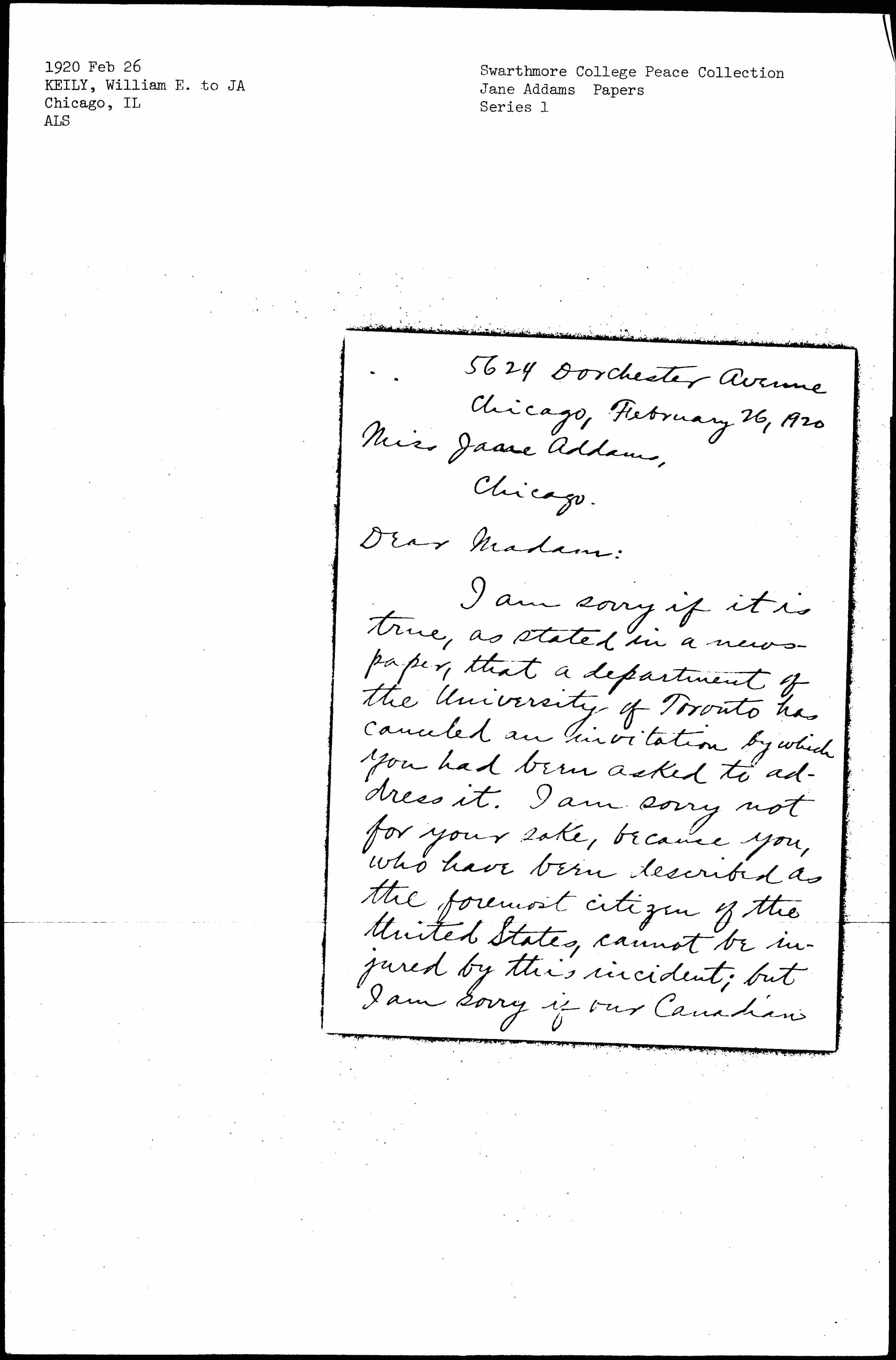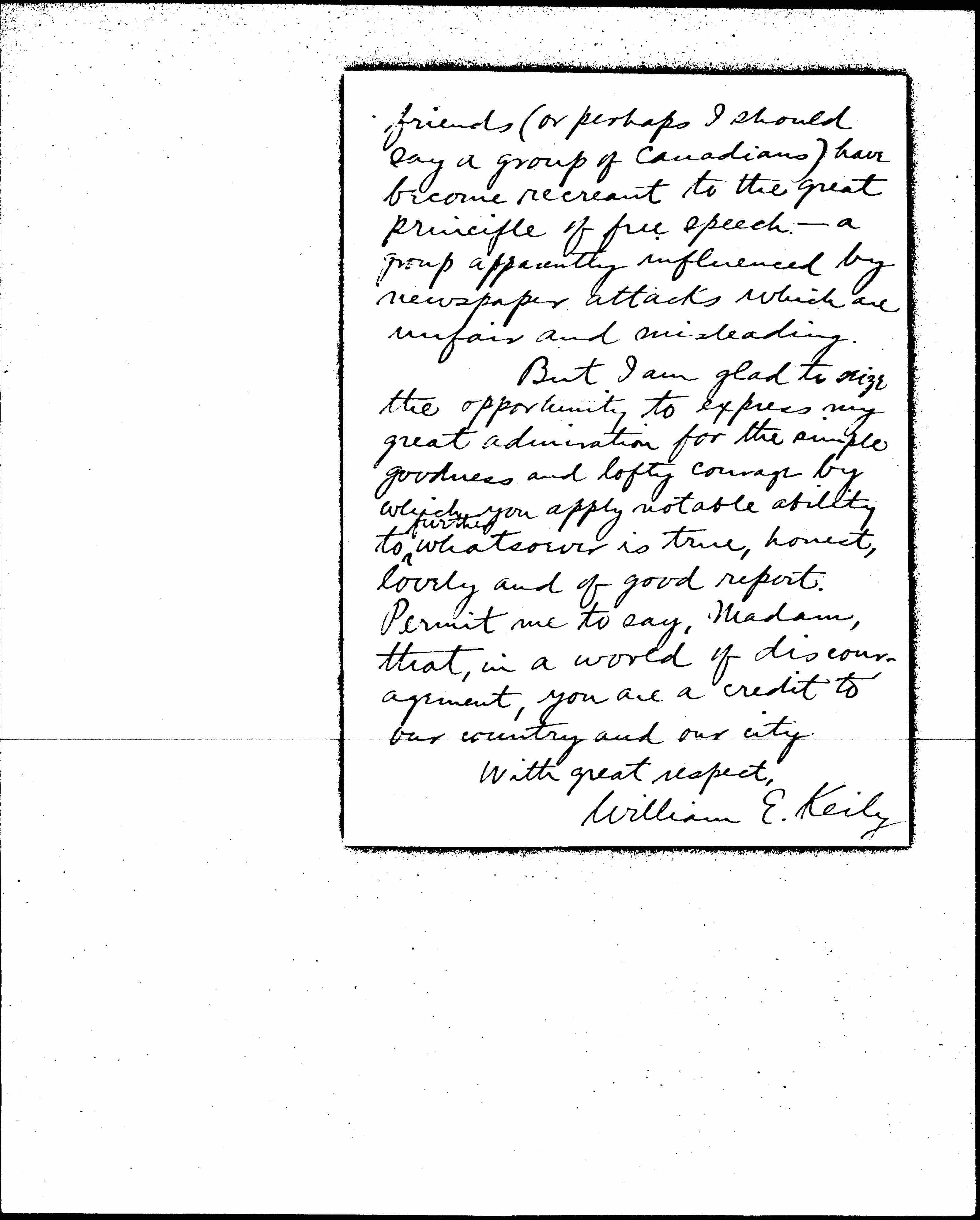 I am sorry if it is true, as stated in a newspaper, that a department of the University of Toronto has canceled an invitation by which you had been asked to address it. I am sorry not for your sake, because you, who have been described as the foremost citizen of the United States, cannot be injured by this incident; but I am sorry if our Canadian [page 2] friends (or perhaps I should say a group of Canadians) have become recreant to the great principle of free speech -- a group apparently influenced by newspaper attacks which are unfair and misleading.