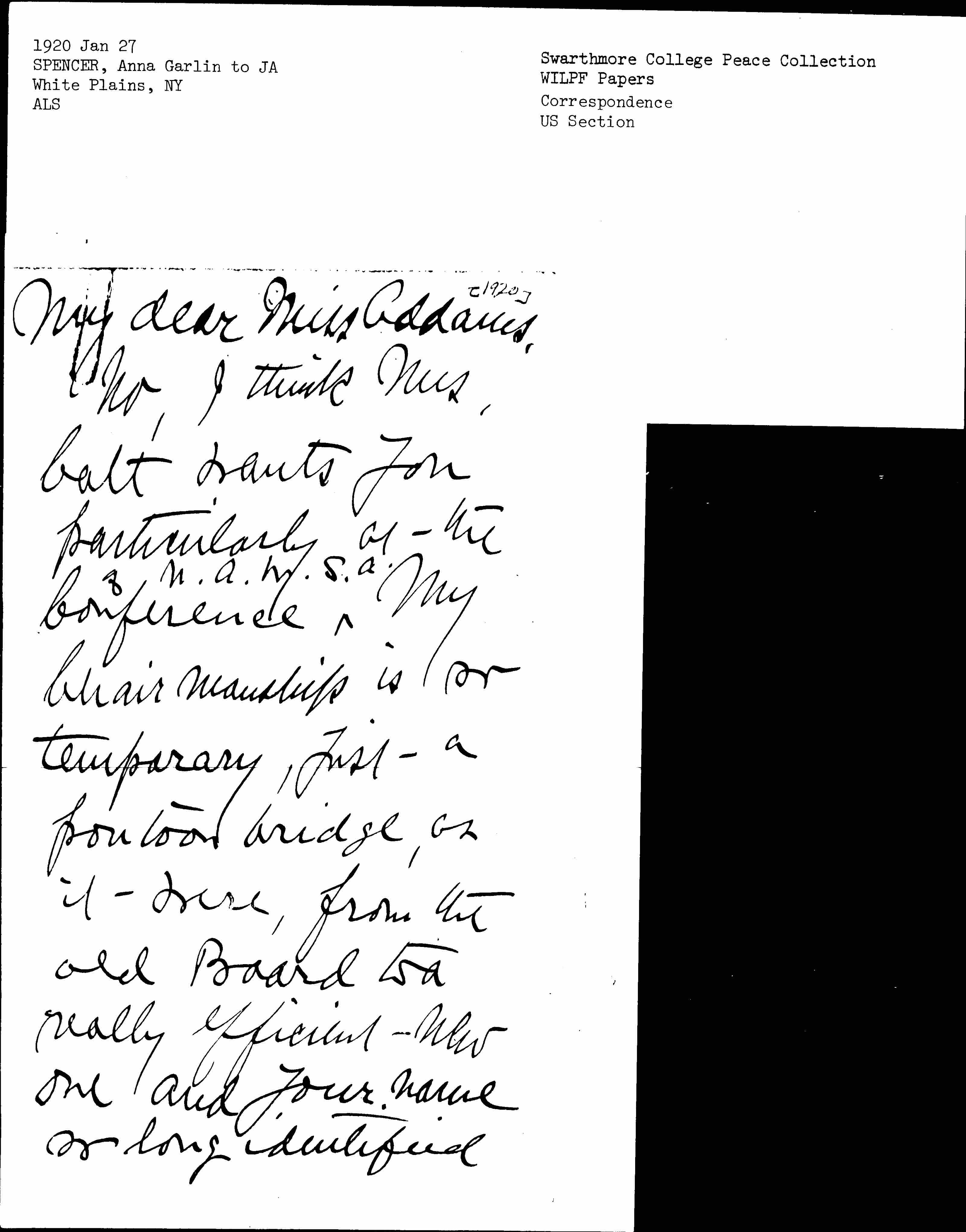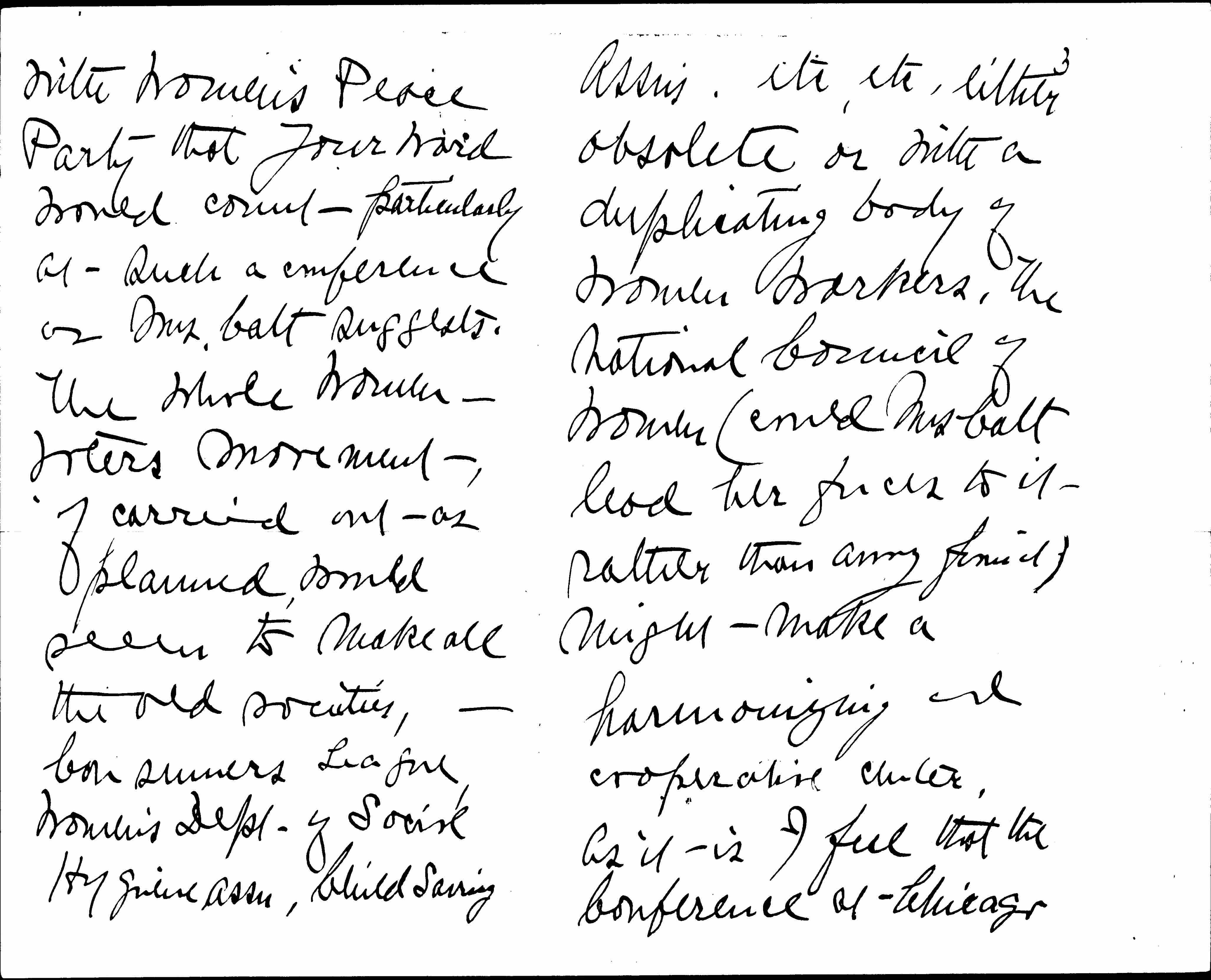 No, I think Mrs. Catt wants you particularly at the Conference ↑of N.A.W.S.A.↓ My Chairmanship is so temporary, just a pontoon bridge, as it were, from the old Board to a really efficient new one and your name so long identified [page 2] with [Woman's] Peace Party that your word would count particularly at such a conference as Mrs. Catt suggests. The whole women-voters movement, if carried out as planned, would seem to make all the old societies, -- Consumers League, Women's Dept. of Social Hygiene Assn., Child Saving [page 3] Assns, etc, etc, either obsolete or with a duplicating body of women workers. The National Council of Women (could Mrs Catt lead her forces to it rather than away from it) might make a harmonizing and cooperative [charter].