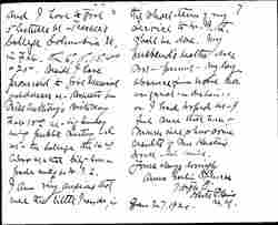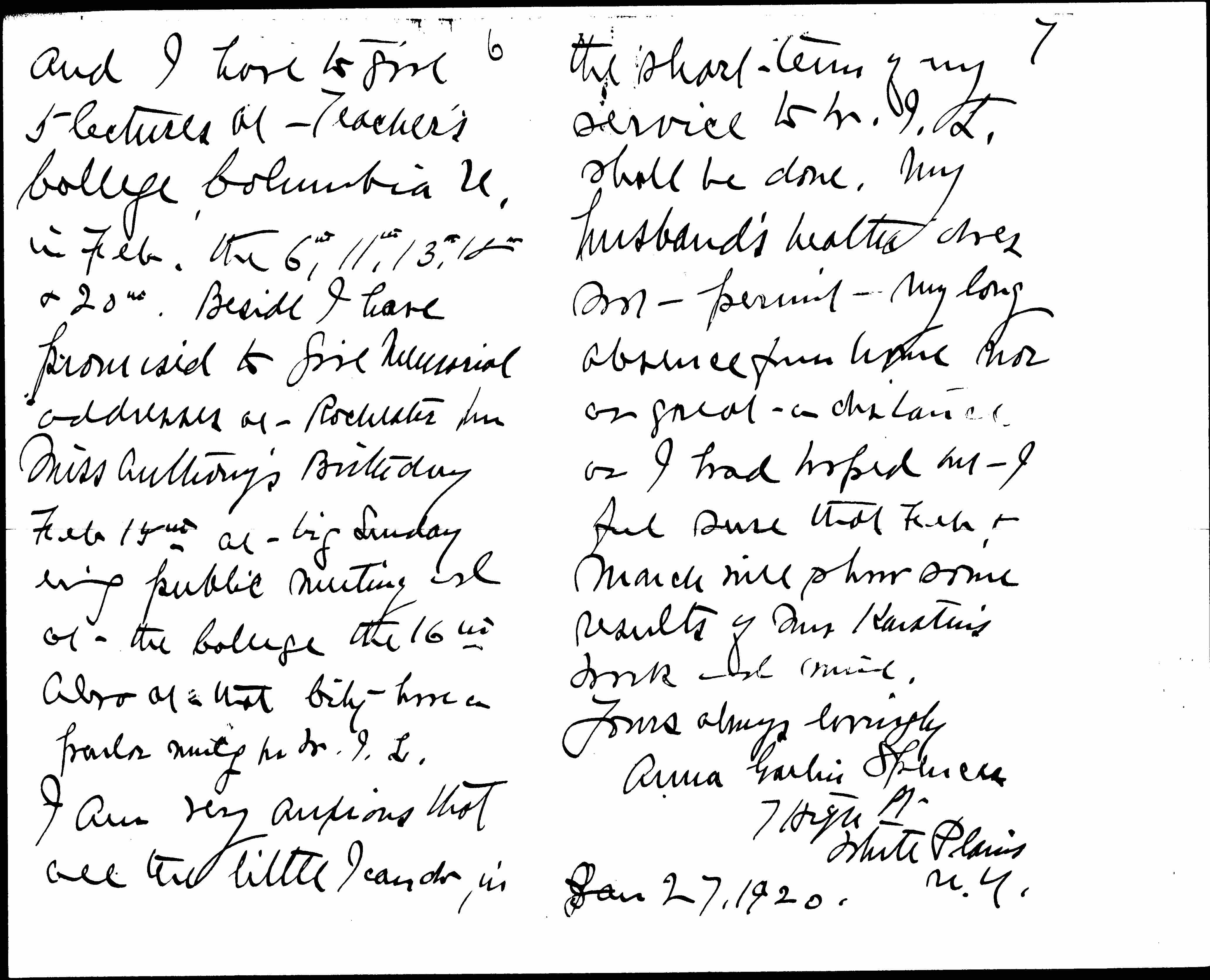 I have given up most of my paid work ↑this winter↓ for the sake of trying to aid W.I.L. but I could not afford to give up wholly my academic connections, [page 6] and I have to give 5 lectures at Teacher's College Columbia U. in Feb. the 6th, 11th, 13th, 18th & 20th. Beside I have promised to give Memorial addresses at Rochester for Miss Anthony's Birthday Feb 15th at big Sunday [evening] public meeting and at the College the 16th also at that City have a parlor meeting for W.I.L.