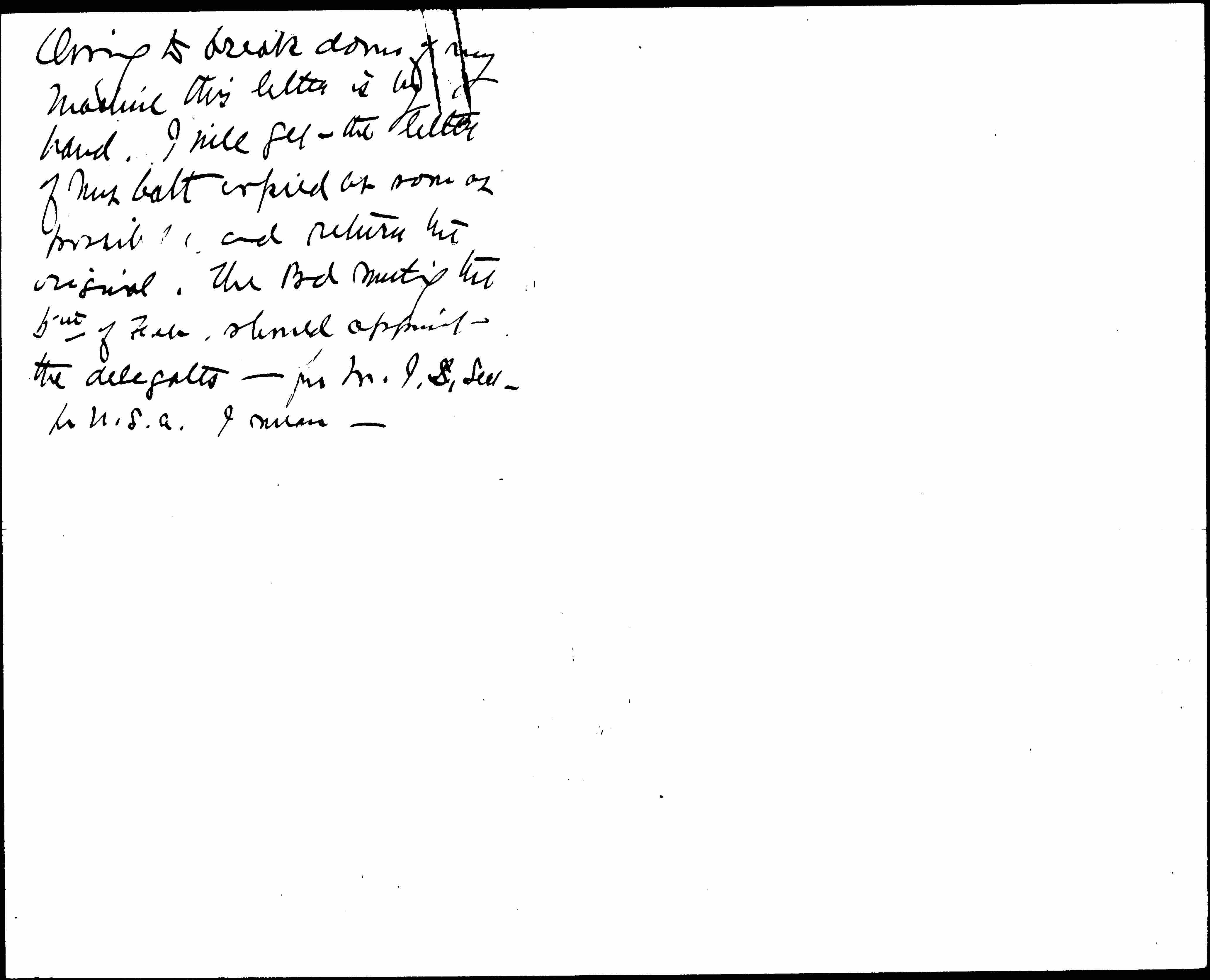 Owing to break down of my machine this letter is long hand. I will get the letter of Mrs Catt copied as soon as possible and return the original. The Bd meeting the 5th of Feb. should appoint the delegates -- for W.I.L. Sect -- for U.S.A. I mean.