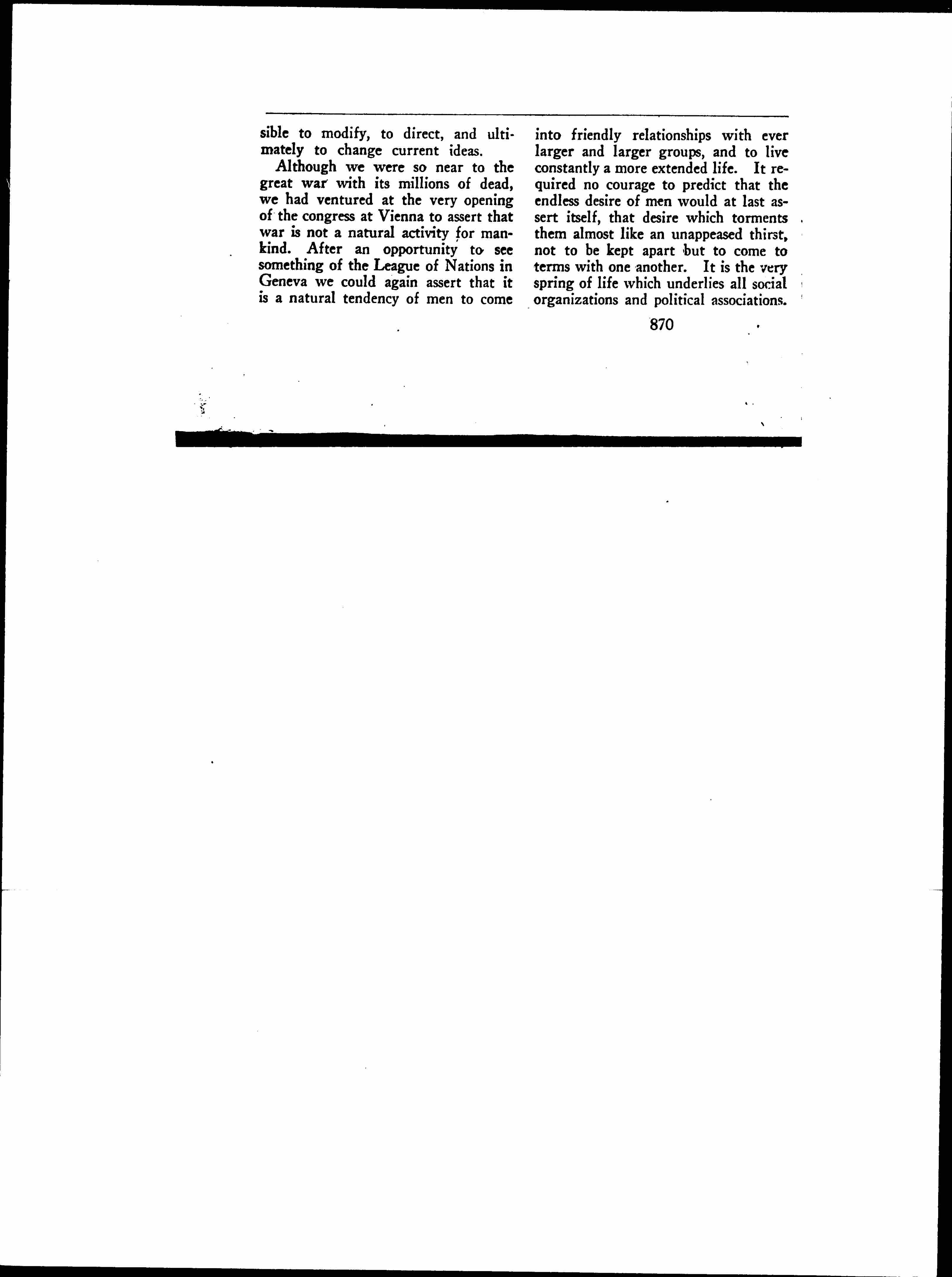 Although we were so near to the great war with its millions of dead, we had ventured at the very opening of the congress at Vienna to assert that war is not a natural activity for mankind. After an opportunity to see something of the League of Nations in Geneva we could again assert that it is a natural tendency of men to come into friendly relationships with ever larger and larger groups, and to live constantly a more extended life. It required no courage to predict that the endless desire of men would at last assert itself, that desire which torments them almost like an unappeased thirst, not to be kept apart but to come to terms with one another. It is the very spring of life which underlies all social organizations and political associations.