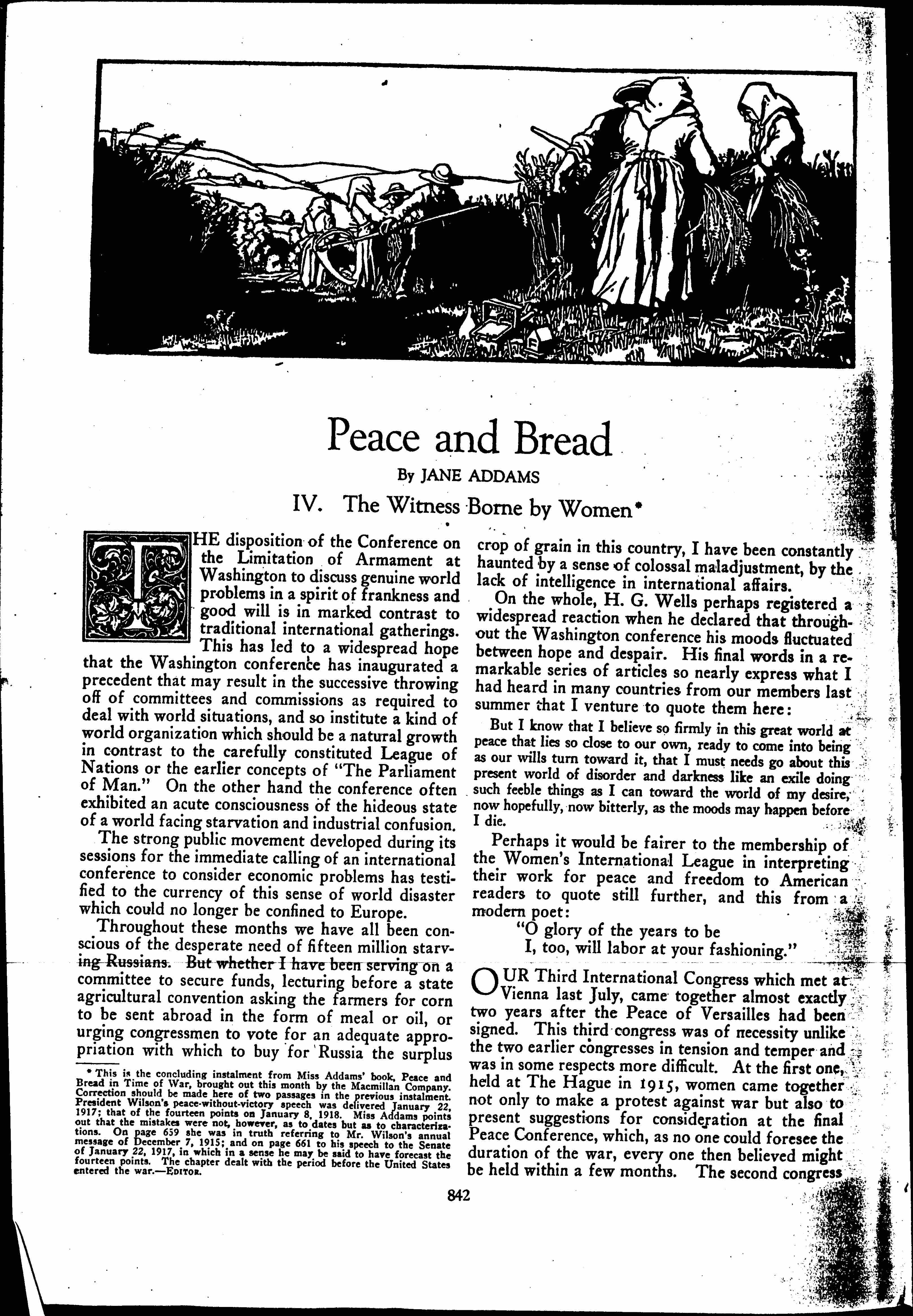 *This is the concluding [installment] from Miss Addams' book, Peace and Bread in Time of War, brought out this month by the Macmillan Company. Correction should be made here of two passages in the previous [installment]. President Wilson's peace-without-victory speech was delivered January 22, 1917; that of the fourteen points on January 8, 1918. Miss Addams points out that the mistakes were not, however, as to dates but as to characterizations. On page 659 she was in truth referring to Mr. Wilson's annual message of December 7, 1915; and on page 661 to his speech to the Senate of January 22, 1917, in which in a sense he may be said to have forecast the fourteen points. The chapter dealt with the period before the United States entered the war. -- EDITOR.