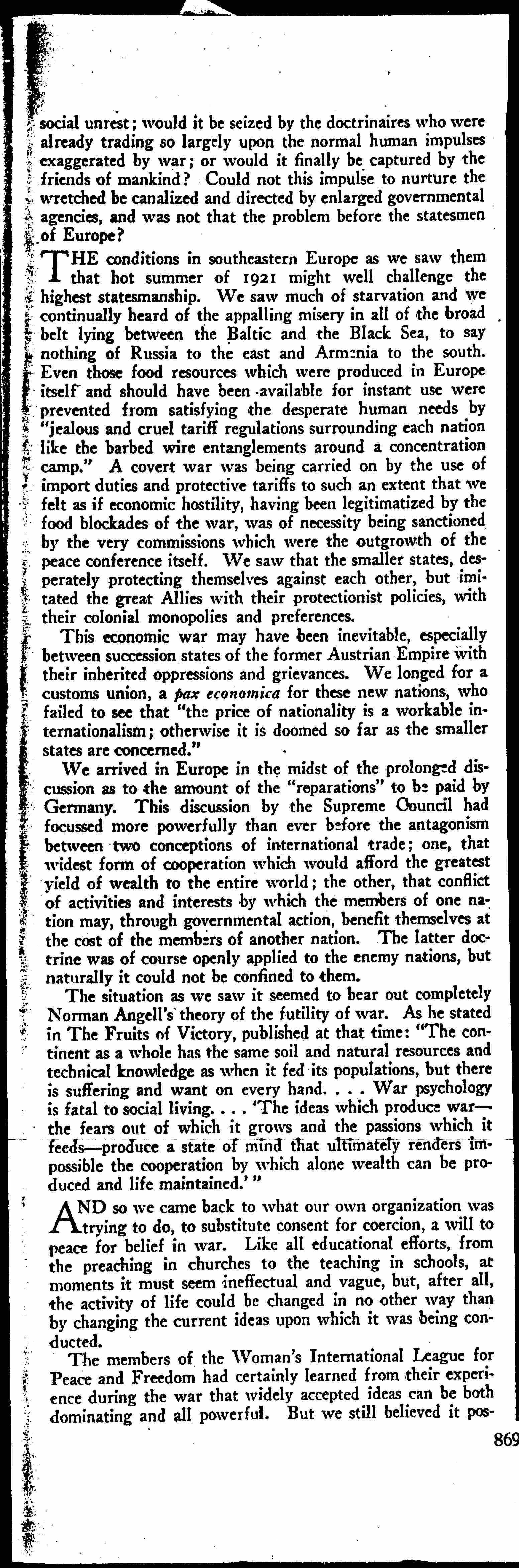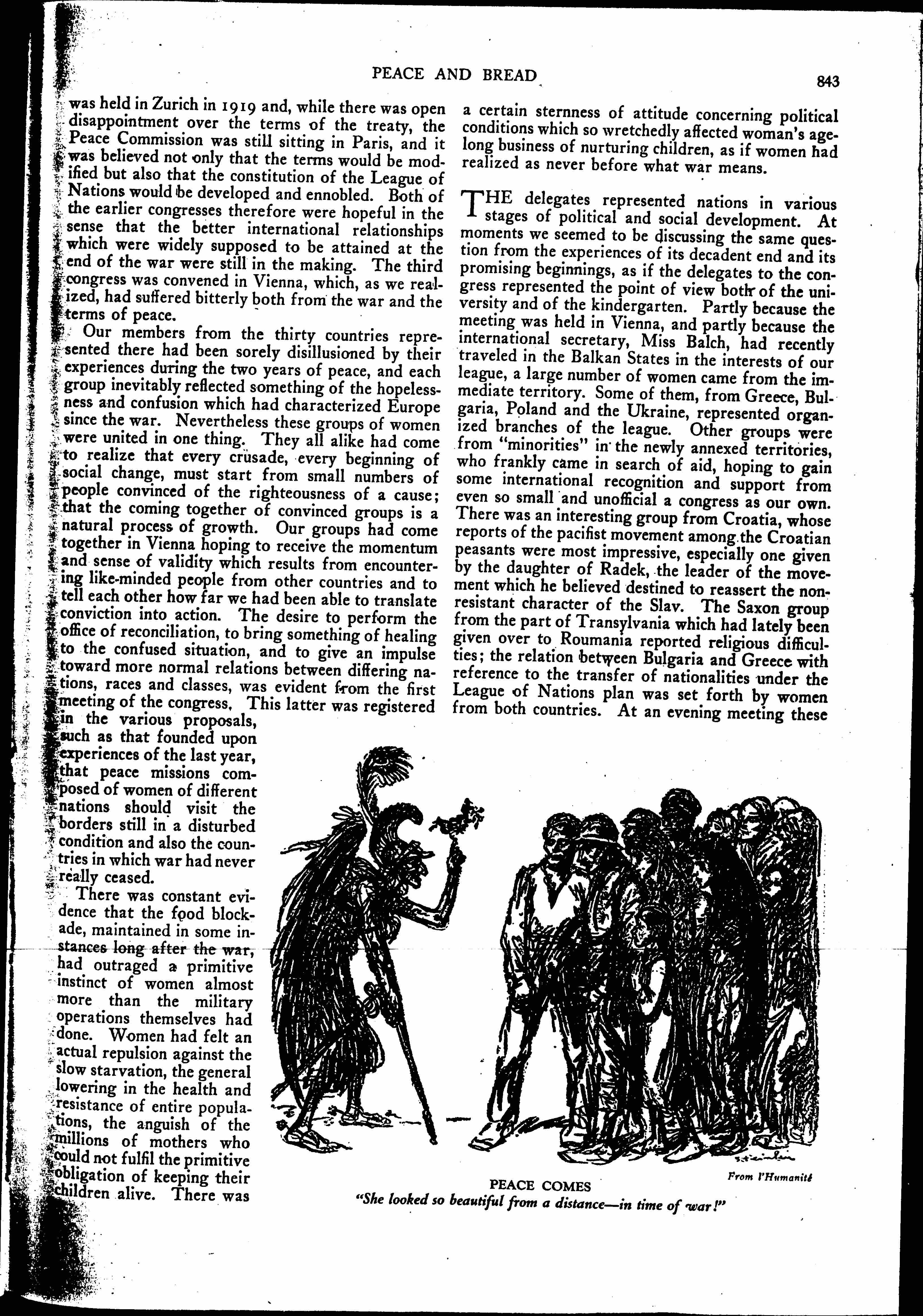 OUR Third International Congress which met at Vienna last July, came together almost exactly two years after the Peace of Versailles had been signed. This third congress was of necessity unlike the two earlier congresses in tension and temper and was in some respects more difficult. At the first one, held at The Hague in 1915, women came together not only to make a protest against war but also to present suggestions for consideration at the final Peace Conference, which, as no one could foresee the duration of the war, every one then believed might be held within a few months. The second congress [page 2] was held in Zurich in 1919 and, while there was open disappointment over the terms of the treaty, the Peace Commission was still sitting in Paris, and it was believed not only that the terms would be modified but also that the constitution of the League of Nations would be developed and ennobled. Both of the earlier congresses therefore were hopeful in the sense that the better international relationships which were widely supposed to be attained at the end of the war were still in the making. The third congress was convened in Vienna, which, as we realized, had suffered bitterly both from the war and the terms of peace.