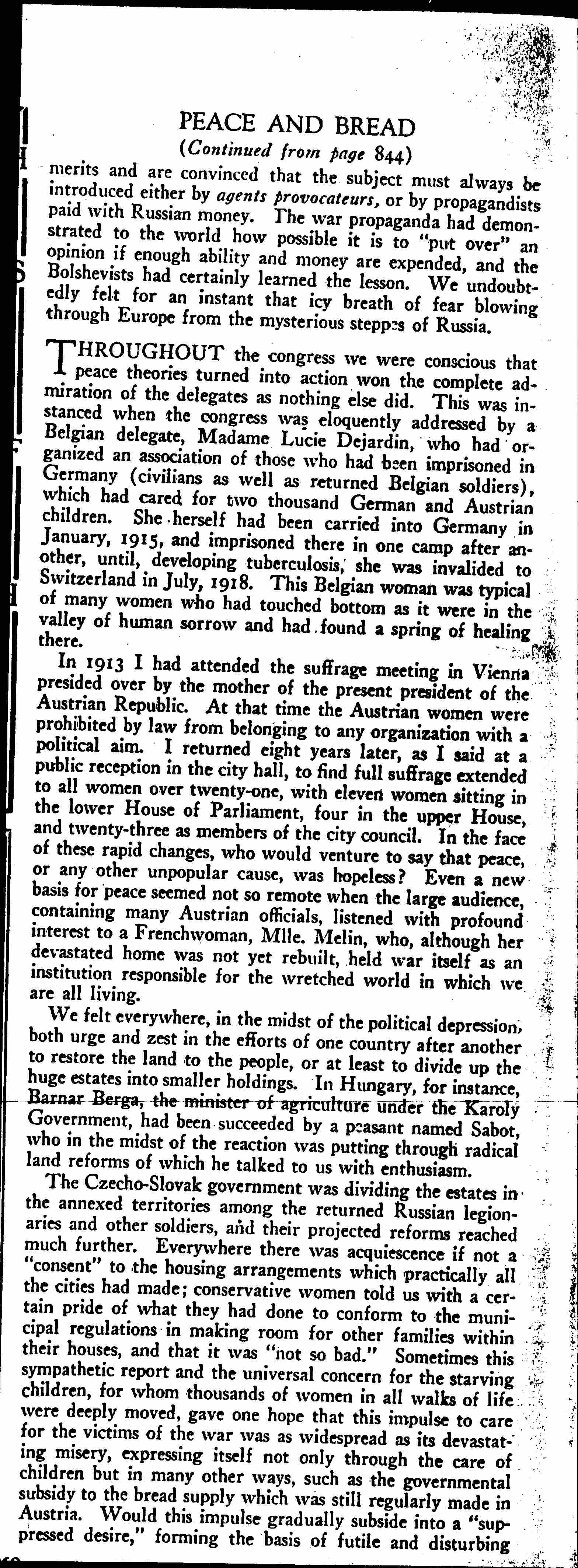 THROUGHOUT the congress we were conscious that peace theories turned into action won the complete admiration of the delegates as nothing else did. This was instanced when the congress was eloquently addressed by a Belgian delegate, Madame Lucie Dejardin, who had organized an association of those who had been imprisoned in Germany (civilians as well as returned Belgian soldiers), which had cared for two thousand German and Austrian children. She herself had been carried into Germany in January, 1915, and imprisoned there in one camp after another, until, developing tuberculosis, she was invalided to Switzerland in July, 1918. This Belgian woman was typical of many women who had touched bottom as it were in the valley of human sorrow and had found a spring of healing there.