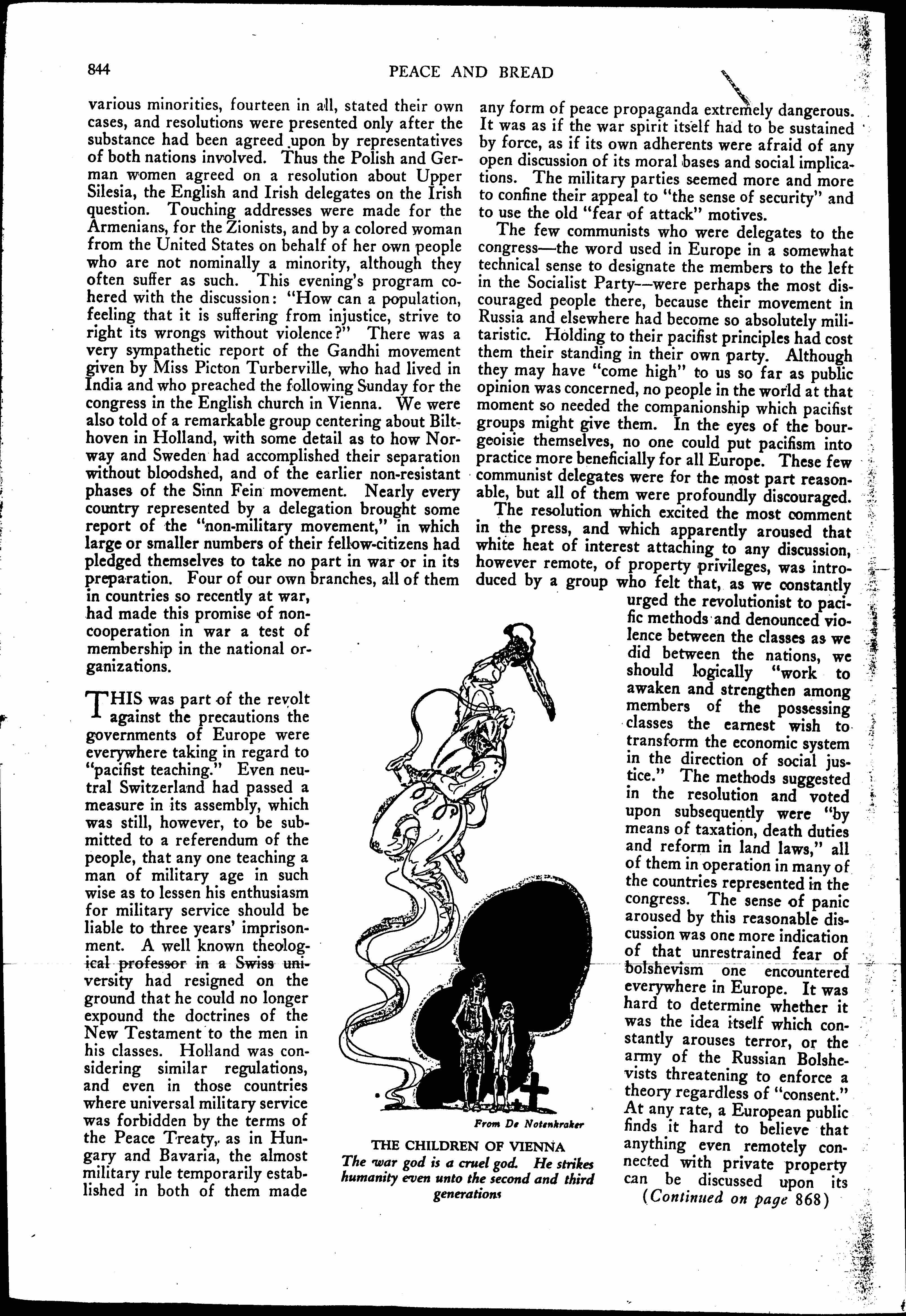 THE delegates represented nations in various stages of political and social development. At moments we seemed to be discussing the same question from the experiences of its decadent end and its promising beginnings, as if the delegates to the congress represented the point of view both of the university and of the kindergarten. Partly because the meeting was held in Vienna, and partly because the international secretary, Miss Balch, had recently traveled in the Balkan States in the interests of our league, a large number of women came from the immediate territory. Some of them, from Greece, Bulgaria, Poland and the Ukraine, represented organized branches of the league. Other groups were from “minorities” in the newly annexed territories, who frankly came in search of aid, hoping to gain some international recognition and support from even so small and unofficial a congress as our own. There was an interesting group from Croatia, whose reports of the pacifist movement among the Croatian peasants were most impressive, especially one given by the daughter of [Radić], the leader of the movement which he believed destined to reassert the non-resistant character of the Slav. The Saxon group from the part of Transylvania which had lately been given over to [Romania] reported religious difficulties; the relation between Bulgaria and Greece with reference to the transfer of nationalities under the League of Nations plan was set forth by women from both countries. At an evening meeting these [page 3] various minorities, fourteen in all, stated their own cases, and resolutions were presented only after the substance had been agreed upon by representatives of both nations involved. Thus the Polish and German women agreed on a resolution about Upper Silesia, the English and Irish delegates on the Irish question. Touching addresses were made for the Armenians, for the Zionists, and by a colored woman from the United States on behalf of her own people who are not nominally a minority, although they often suffer as such. This evening’s program cohered with the discussion: “How can a population, feeling that it is suffering from injustice, strive to right its wrongs without violence?” There was a very sympathetic report of the Gandhi movement given by Miss Picton [Turbervill], who had lived in India and who preached the following Sunday for the congress in the English church in Vienna. We were also told of a remarkable group centering about Bilthoven in Holland, with some detail as to how Norway and Sweden had accomplished their separation without bloodshed, and of the earlier non-resistant phases of the Sinn Féin movement. Nearly every country represented by a delegation brought some report of the “non-military movement,” in which large or smaller numbers of their fellow-citizens had pledged themselves to take no part in war or in its preparation. Four of our own branches, all of them in countries so recently at war, had made this promise of noncooperation in war a test of membership in the national organizations.