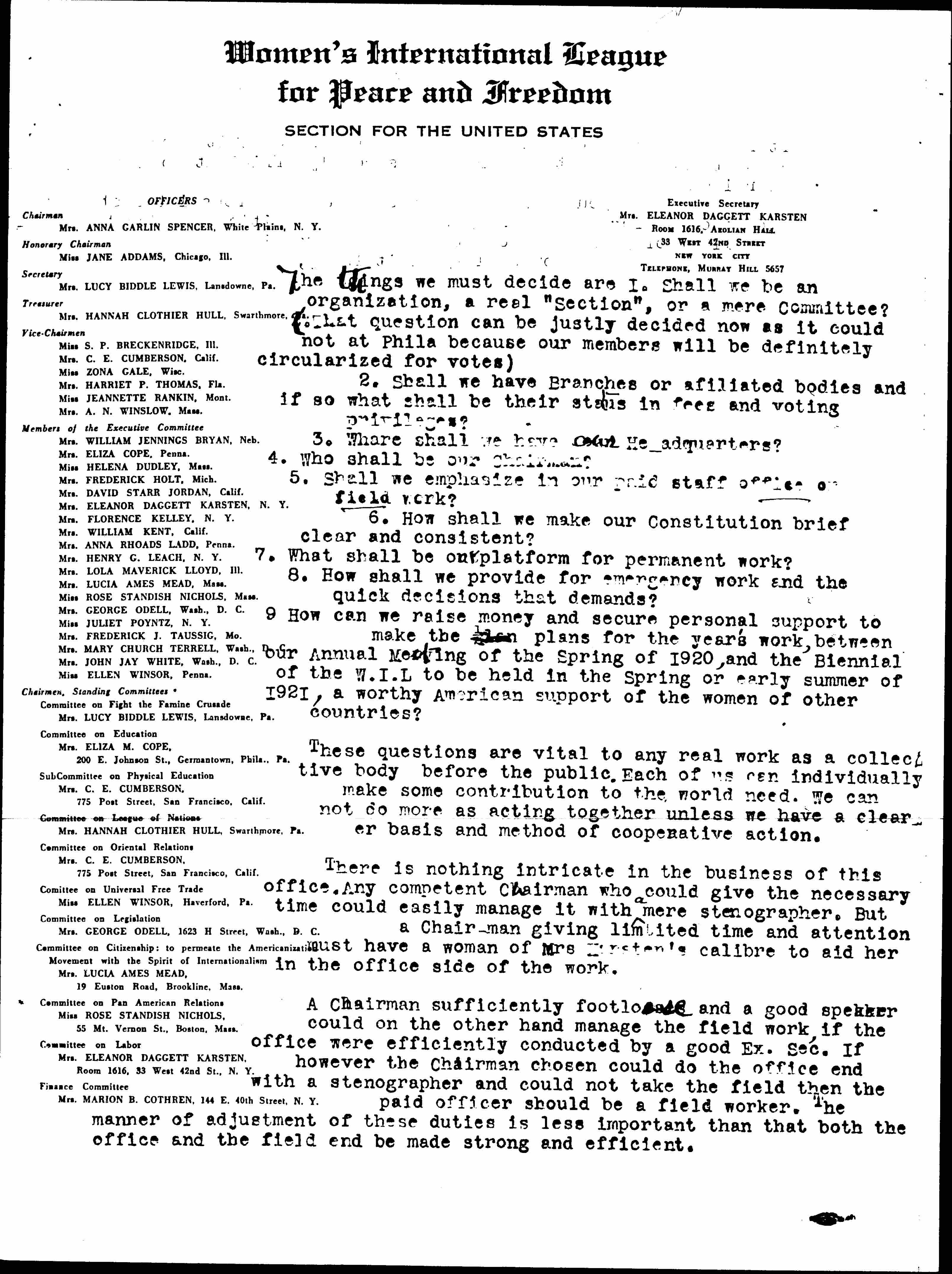 9. How can we raise money and secure personal support to make the plan plans for the year's work, between our Annual Meeting of the Spring of 1920, and the Biennial of the W.I.L. to be held in the Spring or early summer of 1921, a worthy American support of the women of other countries?