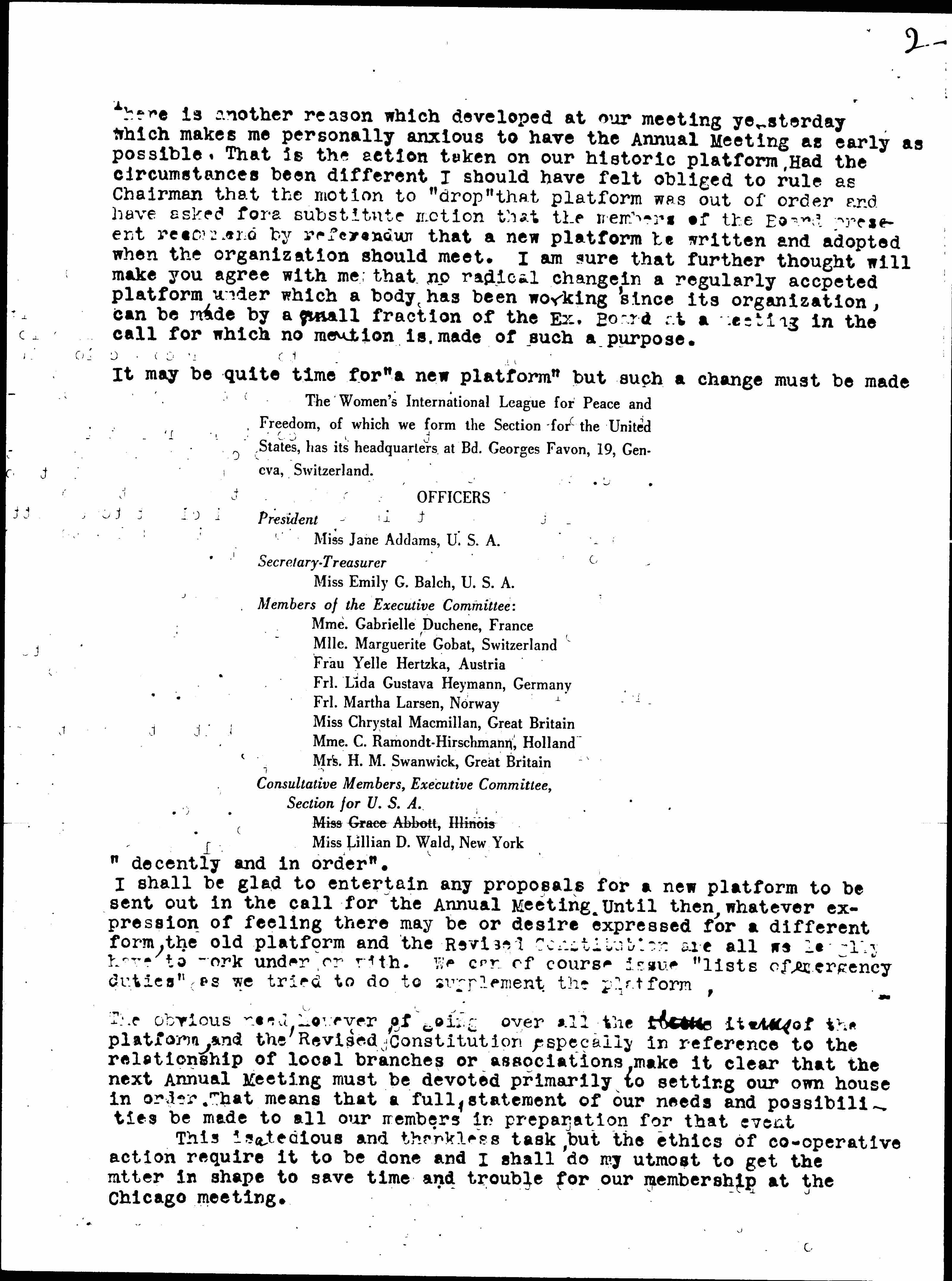 There is another reason which developed at our meeting yesterday which makes me personally anxious to have the Annual Meeting as early as possible. That is the action taken on our historic platform. Had the circumstances been different I should have felt obliged to rule as Chairman that the motion to "drop" that platform was out of order and have asked for a substitute motion that the members of the Board present [recommend] by referendum that a new platform be written and adopted when the organization should meet. I am sure that further thought will make you agree with me that no radical change in a regularly accepted platform under which a body has been working since its organization, can be made by a small fraction of the Ex. Board at a meeting in the call for which no mention is made of such a purpose.