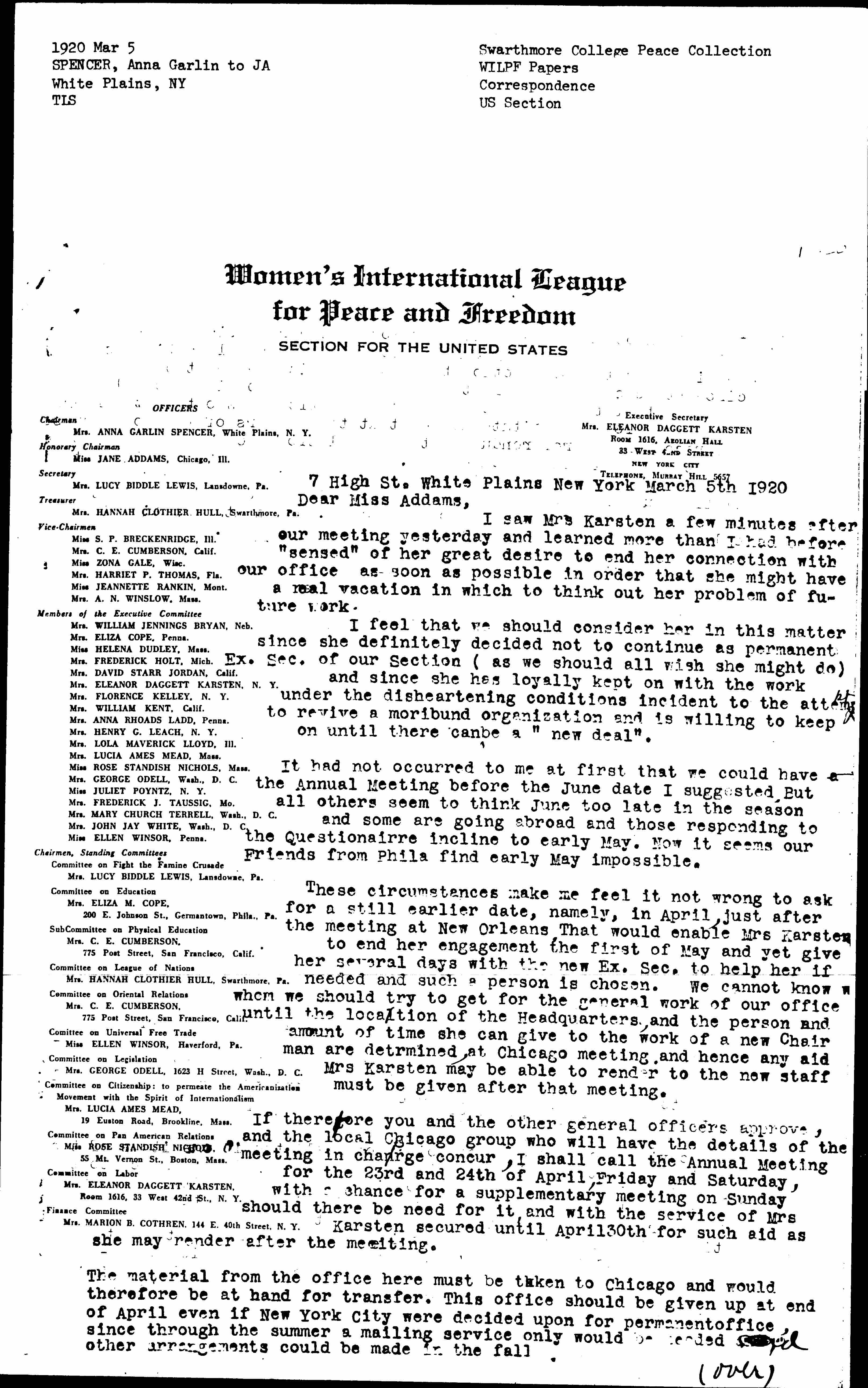 These circumstances make me feel it not wrong to ask for a still earlier date, namely, in April, just after the meeting at New Orleans. That would enable Mrs Karsten to end her engagement the first of May and yet give her several days with the new Ex. Sec. to help her if needed and such a person is chosen. We cannot know whom we should try to get for the general work of our office until the location of the Headquarters and the person and amount of time she can give to the work of a new Chairman are determined, at Chicago meeting, and hence any aid Mrs. Karsten may be able to render to the new staff must be given after that meeting.