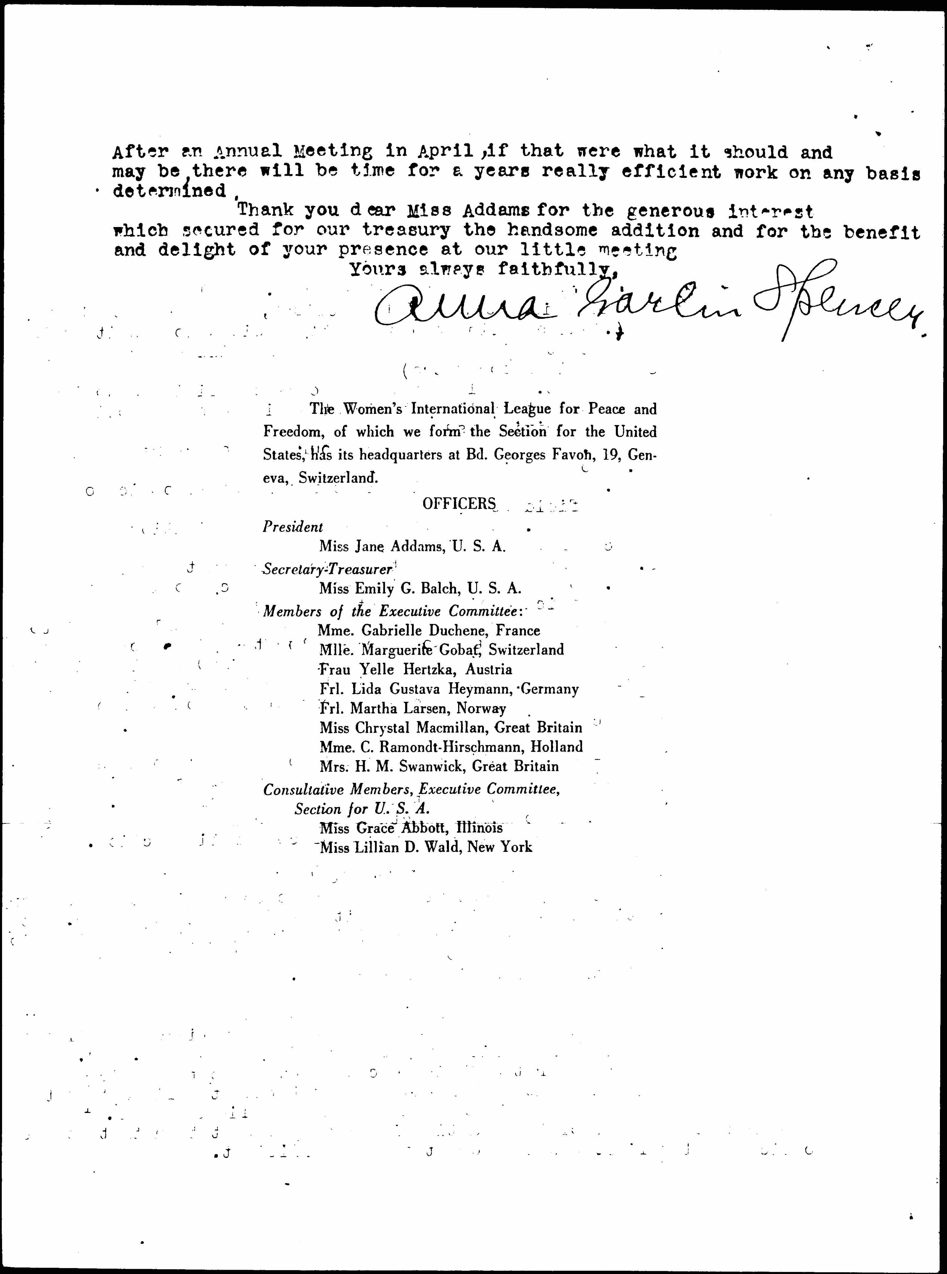 Thank you dear Miss Addams for the generous interest which secured for our treasury the handsome addition and for the benefit and delight of your presence at our little meeting.