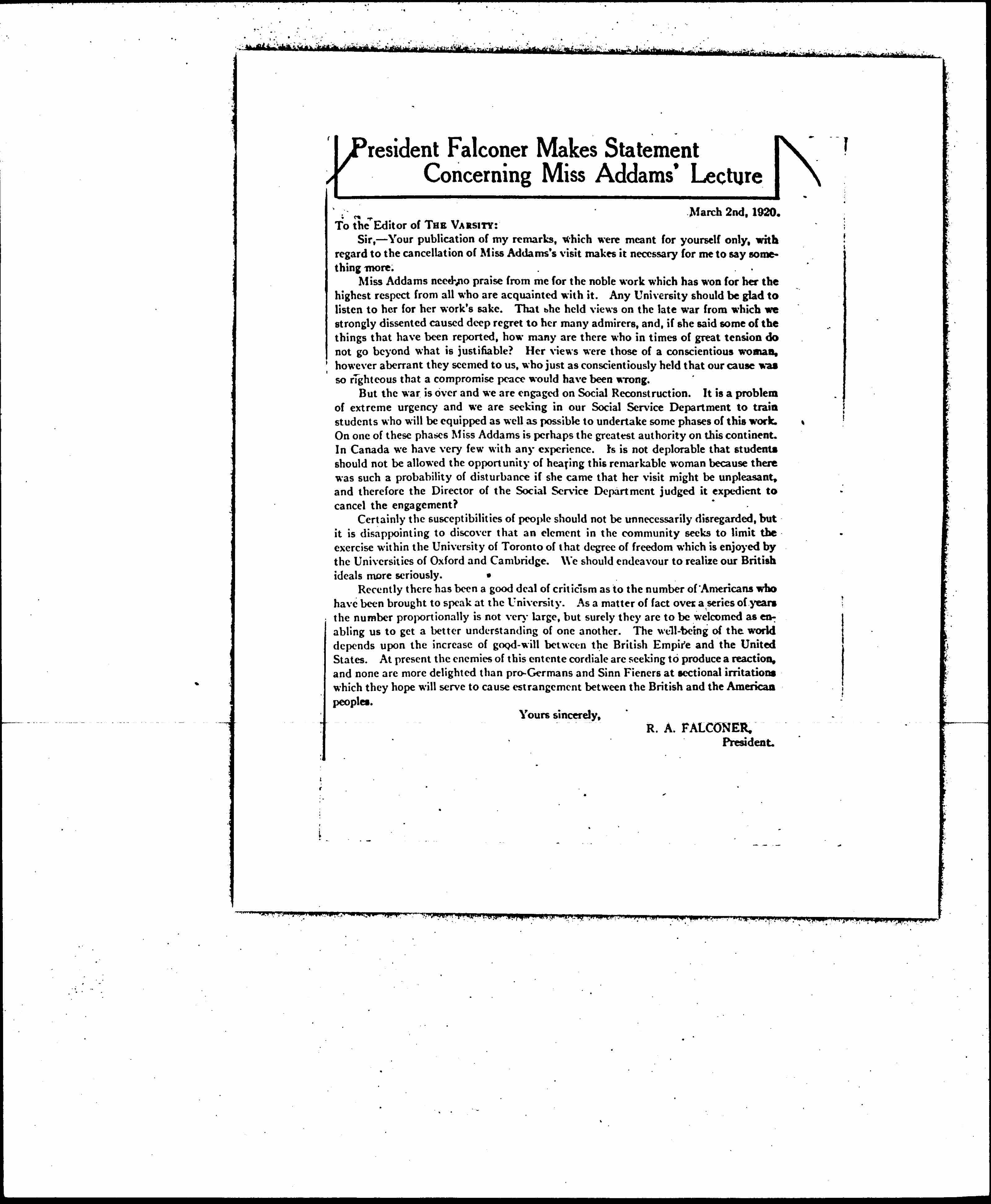 But the war is over and we are engaged on Social Reconstruction. It is a problem of extreme urgency and we are seeking in our Social Service Department to train students who will be equipped as well as possible to undertake some phases of this work. On one of these phases Miss Addams is perhaps the greatest authority on this continent. In Canada we have very few with any experience. Is [it] not deplorable that students should not be allowed the opportunity of hearing this remarkable woman because there was such a probability of disturbance if she came that her visit might be unpleasant, and therefore the Director of the Social Service Department judged it expedient to cancel the engagement?
