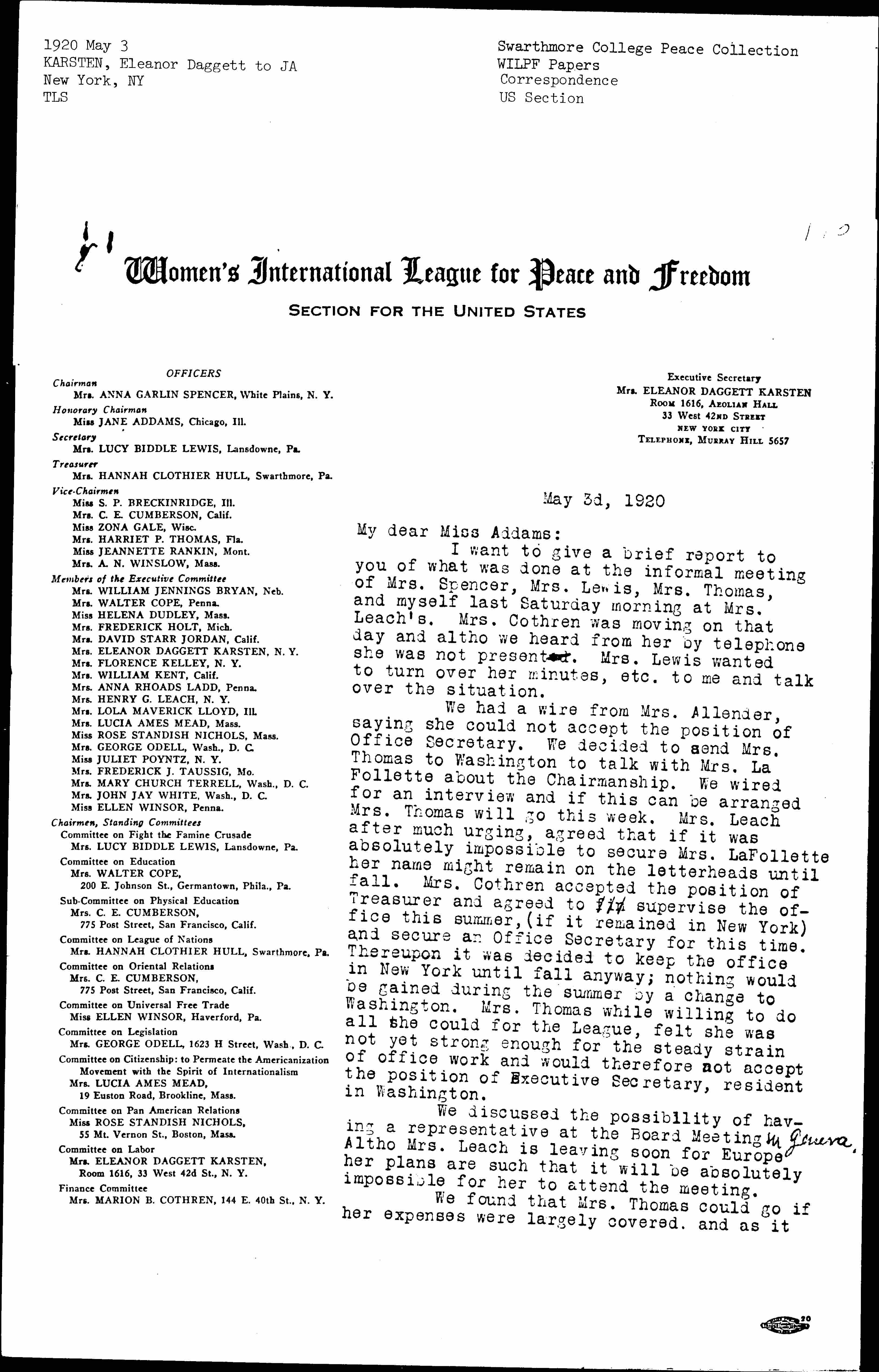 We found that Mrs. Thomas could go if her expenses were largely covered. And as is it [page 2] seemed imperative that we have a representative, especially in view of the fact that we had heard that Mrs. Villard was sending a representative, we decided to try to secure her expenses. If she goes she will have to secure passage at once; we therefore wired Mrs. Johnson of California, asking if she and Mrs. Dummer would be willing to guarantee one thousand dollars, with the understanding that we would do our best to raise a large part of the money elsewhere. I have not yet received an answer. I hope this will meet with your hearty approval. If Mrs. Thomas goes, she will want to have credentials from you and I suppose if possible a letter stating your position in reference to Mrs. Villard's group having direct affiliation with the International as a group, or forming another International.