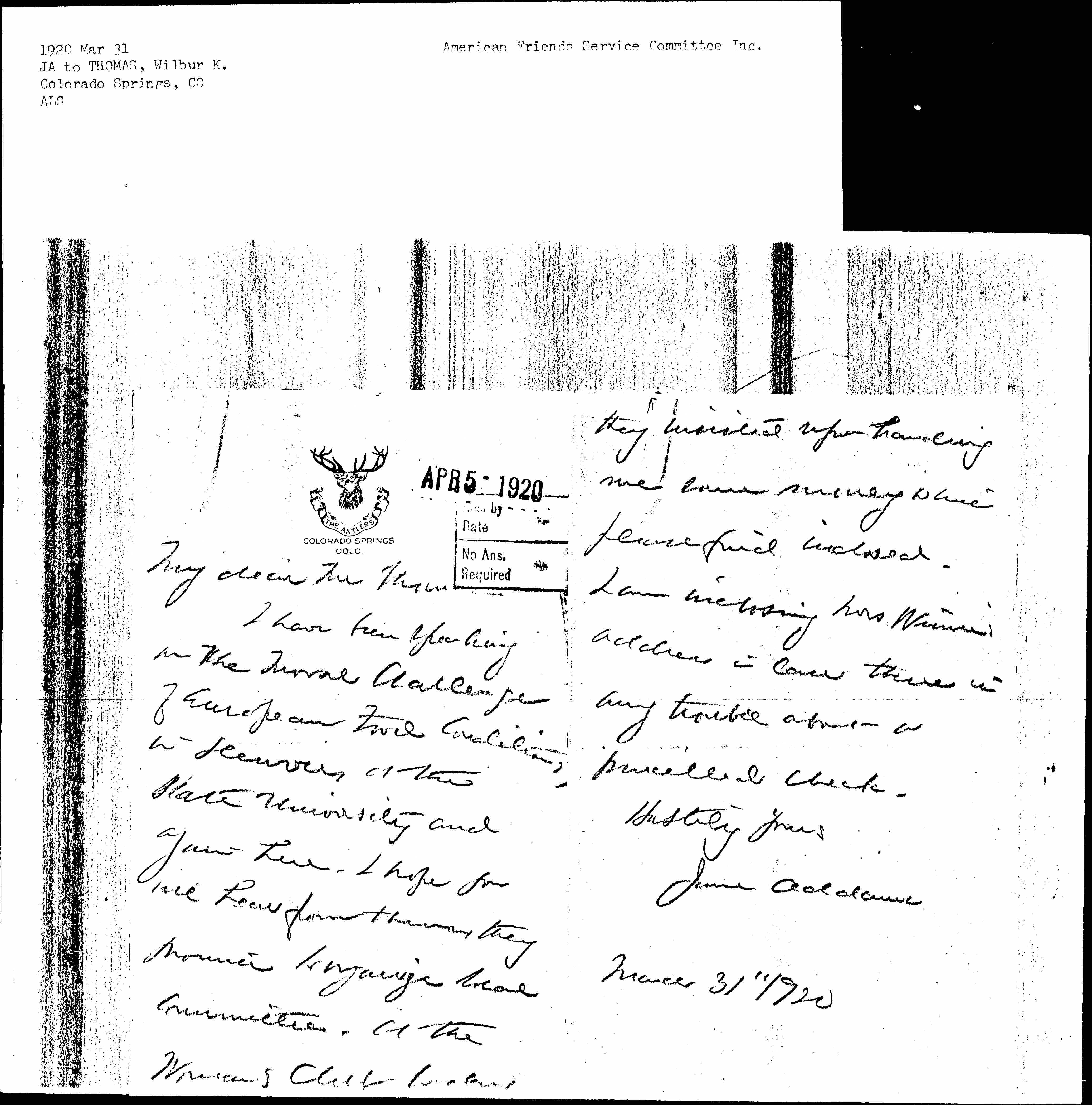 I have been speaking on the Moral Challenge of European Food Conditions, in Denver at the State University and again here. I hope you will hear from [them], they promise to organize local Committee. At the Women's Club lecture [page 2] they insisted upon handing me some money which please find [enclosed]. I am [enclosing] Mrs. Winsor's address in case there is any trouble about a [penciled] check.