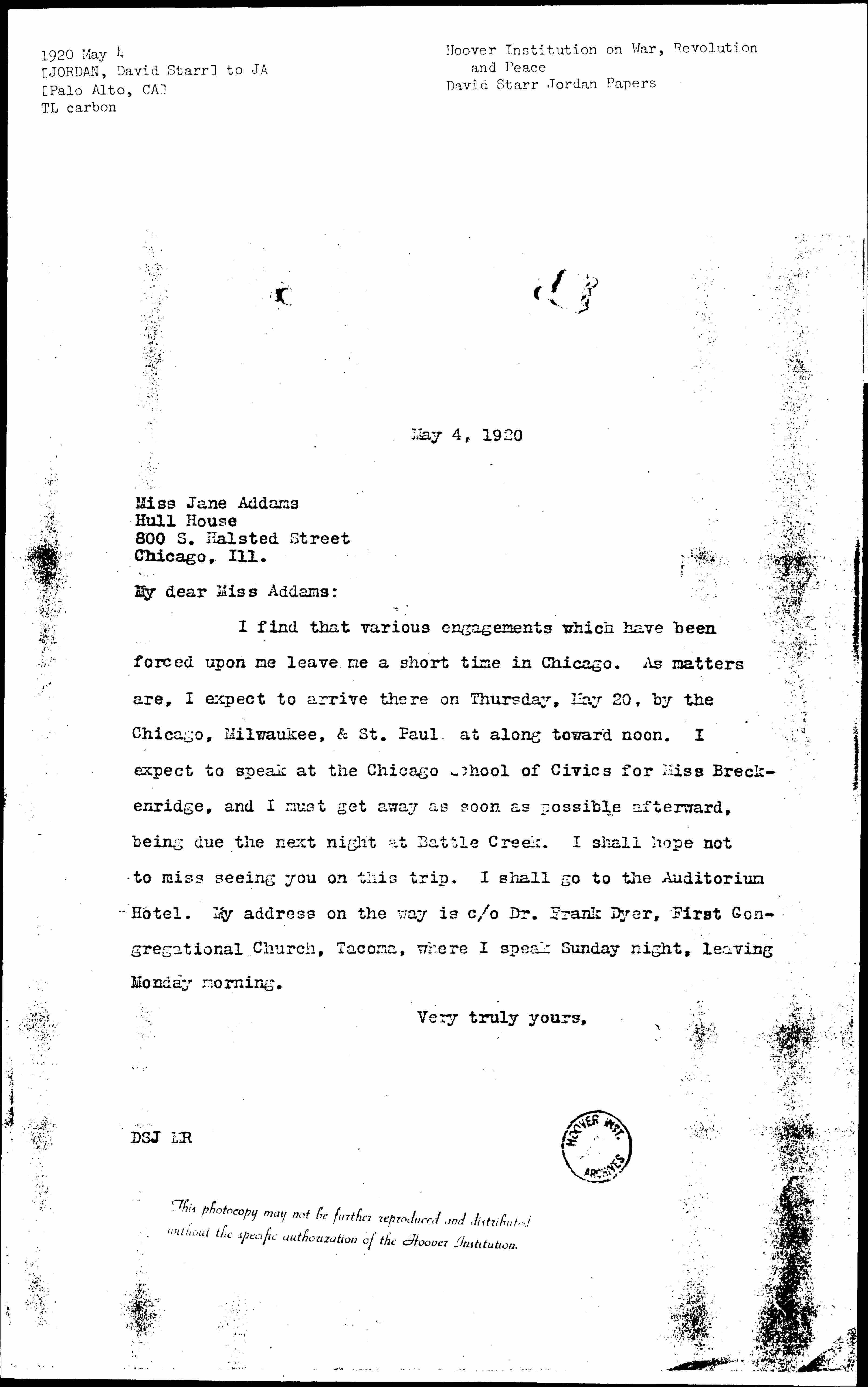 I find that various engagements which have been forced upon me leave me a short time in Chicago. As matters are, I expect to arrive there on Thursday, May 20, by the Chicago, Milwaukee, & St. Paul at along toward noon. I expect to speak at the Chicago School of Civics for Miss [Breckinridge], and I must get away as soon as possible afterward, being due the next night at Battle Creek. I shall hope not to miss seeing you on this trip. I shall go to the Auditorium Hotel. My address on the way is c/o Dr. Frank Dyer, First Congregational Church, Tacoma, where I speak Sunday night, leaving Monday morning.