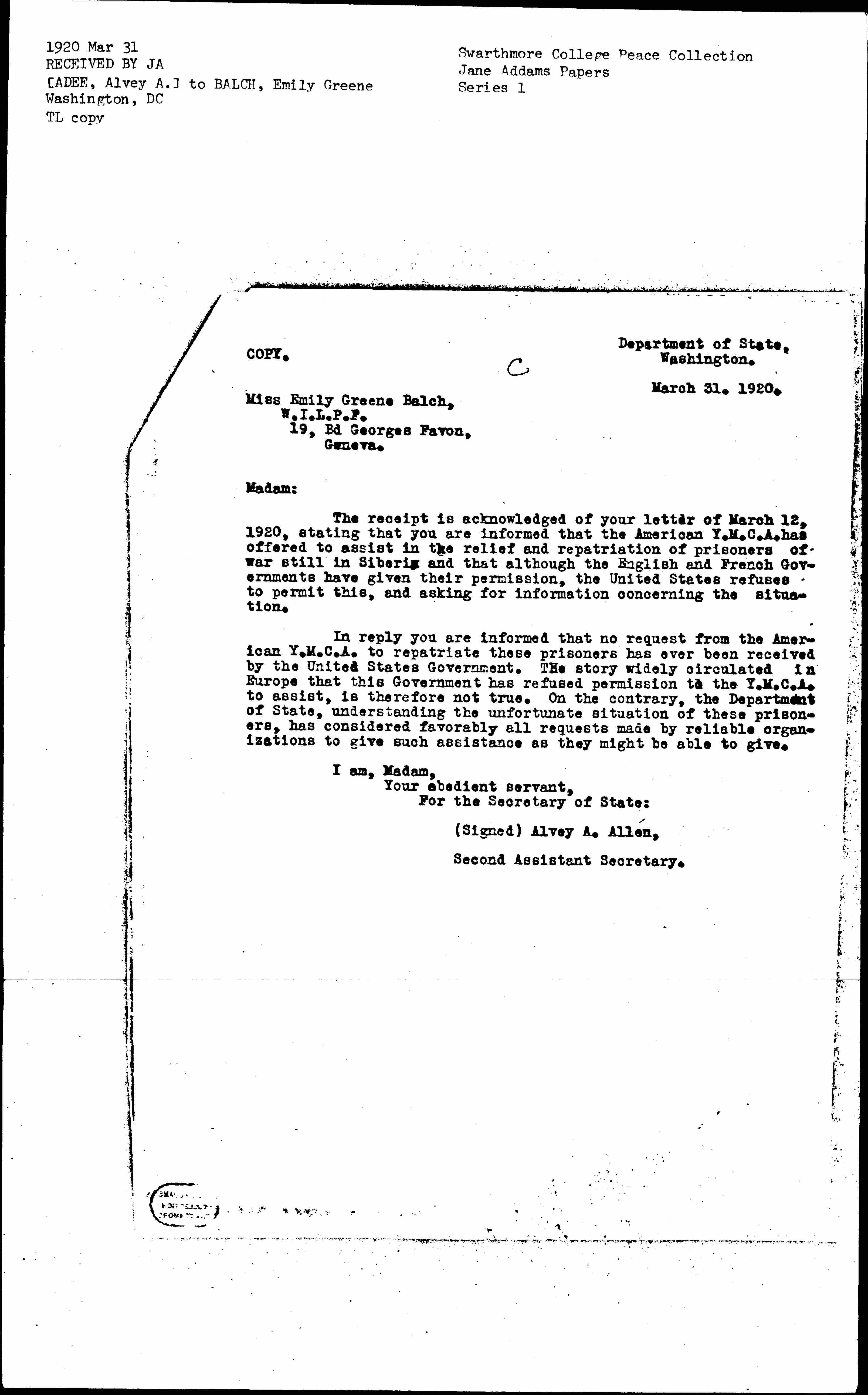 The receipt is acknowledged of your letter of March 12, 1920, stating that you are informed that the American Y.M.C.A. has offered to assist in the relief and repatriation of prisoners of war still in Siberia and that although the English and French Governments have given their permission, the United States refuses to permit this, and asking for information concerning the situation.