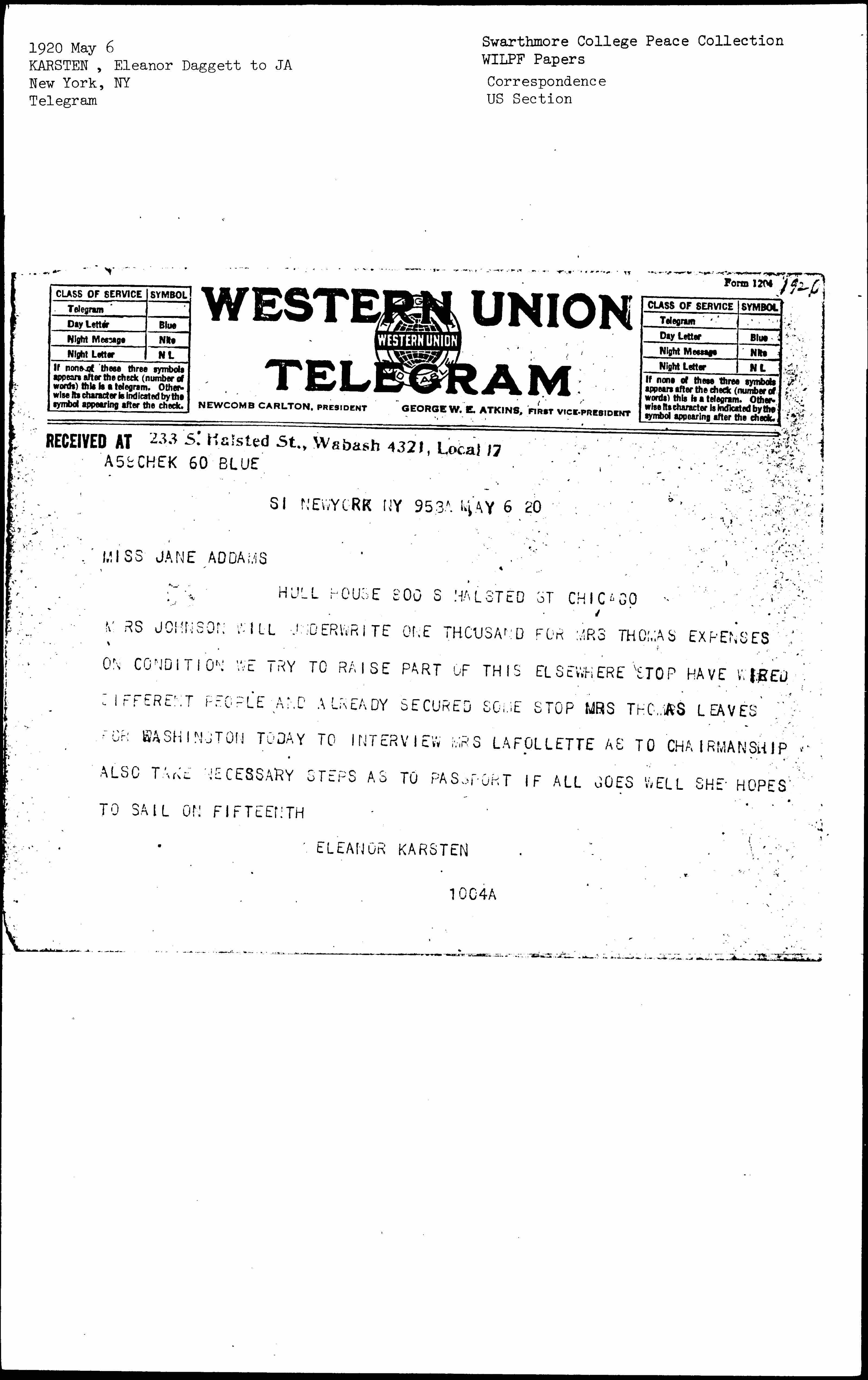 MRS JOHNSON WILL UNDERWRITE ONE THOUSAND FOR MRS THOMAS EXPENSES ON CONDITION WE TRY TO RAISE PART OF THIS ELSEWHERE. HAVE WIRED DIFFERENT PEOPLE AND ALREADY SECURED SOME. MRS THOMAS LEAVES FOR WASHINGTON TODAY TO INTERVIEW MRS LA FOLLETTE AS TO CHAIRMANSHIP ALSO TAKE NECESSARY STEPS AS TO PASSPORT IF ALL GOES WELL SHE HOPES TO SAIL ON FIFTEENTH