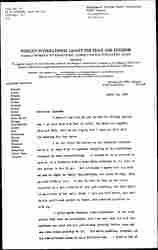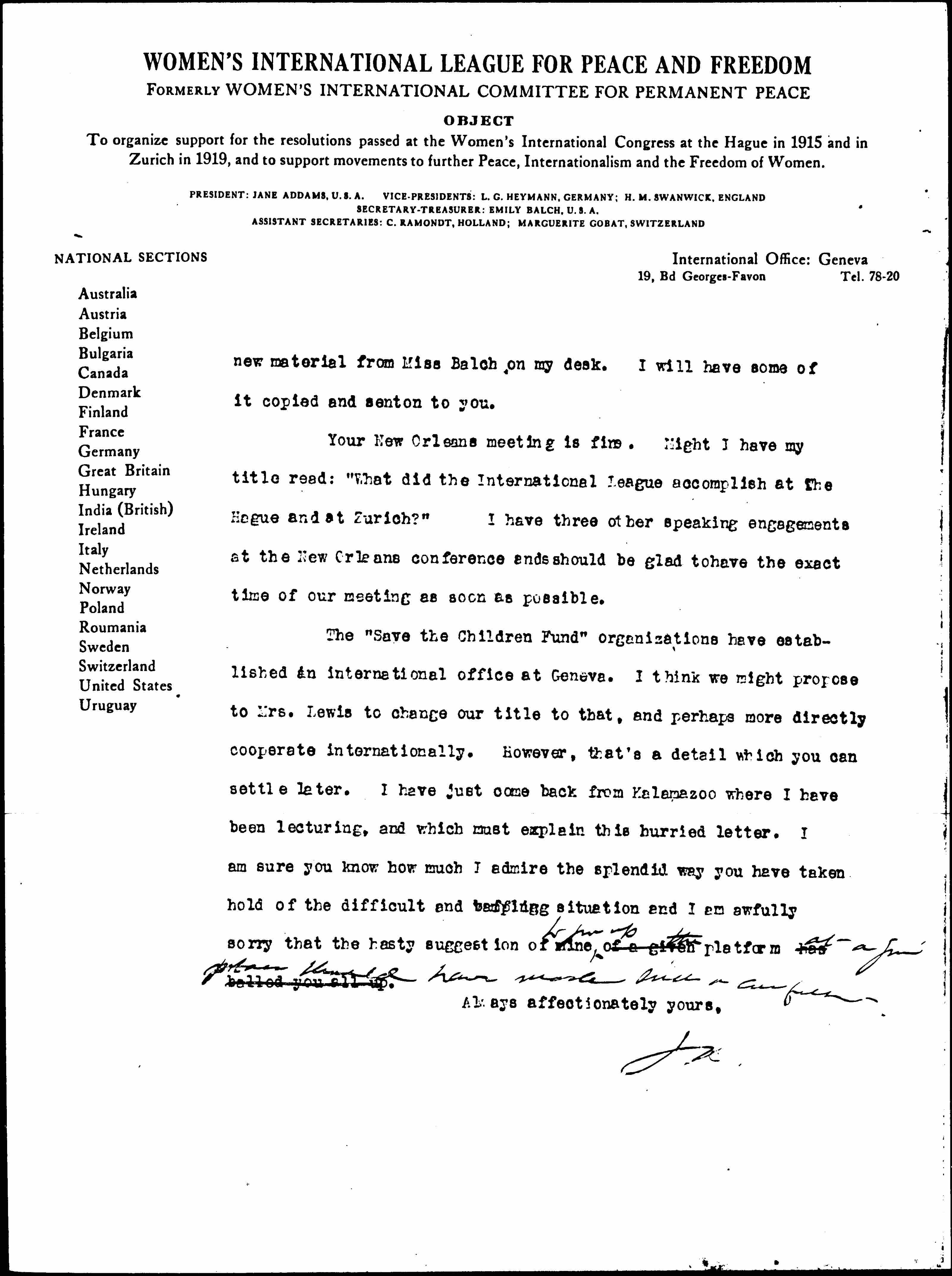 The "Save the Children Fund" organizations have established an international office at Geneva. I think we might propose to Mrs. Lewis to change our title to that, and perhaps more directly cooperate internationally. However, that's a detail which you can settle later. I have just come back from Kalamazoo where I have been lecturing, and which must explain this hurried letter. I am sure you know how much I admire the splendid way you have taken hold of the difficult and baffling situation and I am awfully sorry that the hasty suggestion of mine of a given ↑to give up the↓ platform has balled you all up ↑at [a given plan?] should have made such a confusion↓.
