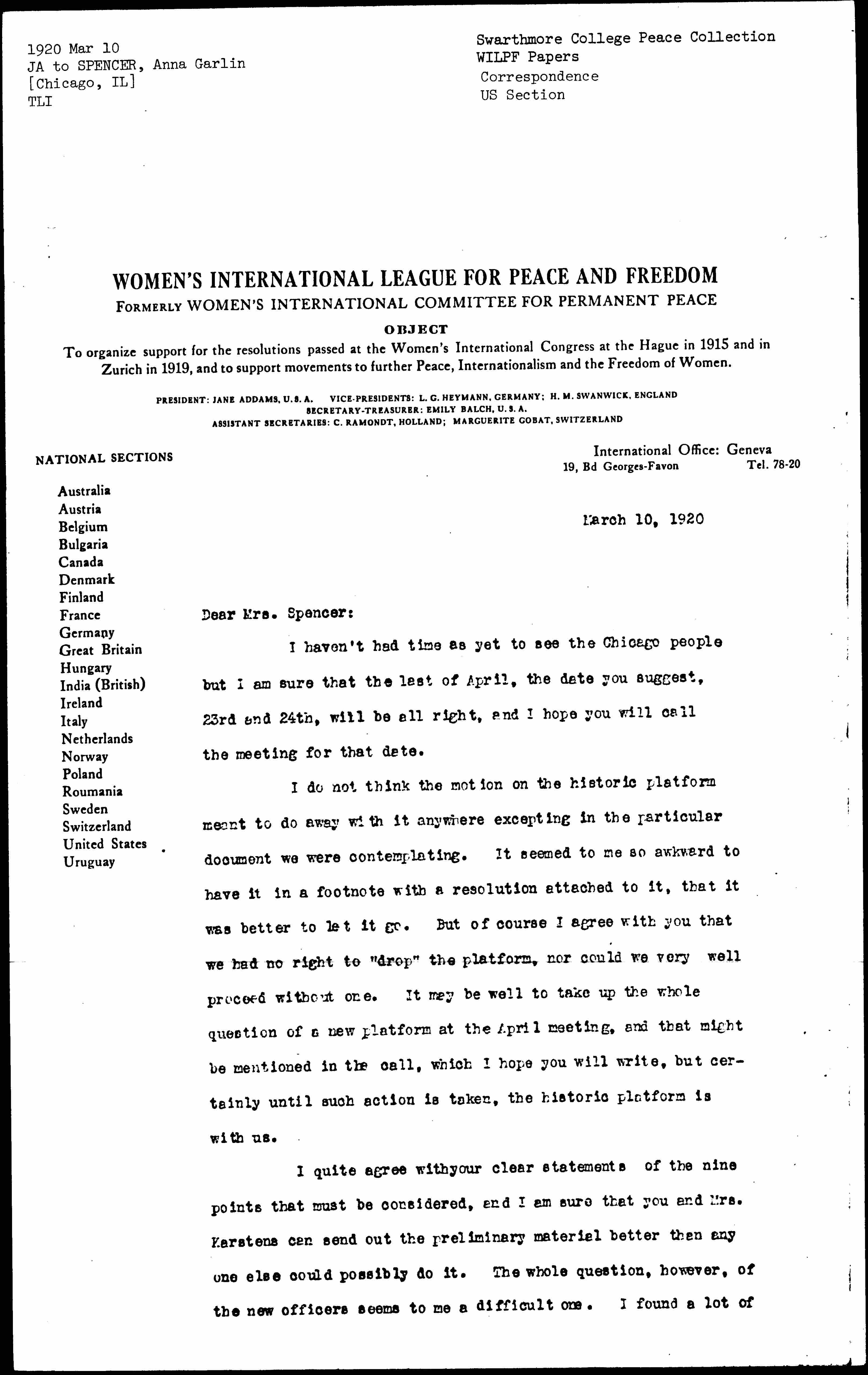 I quite agree with your clear statements of the nine points that must be considered, and I am sure that you and Mrs. [Karsten] can send out the preliminary material better than [anyone] else could possibly do it. The whole question, however, of the new officers seems to me a difficult one. I found a lot of [page 2] new material from Miss Balch on my desk. I will have some of it copied and sent on to you.