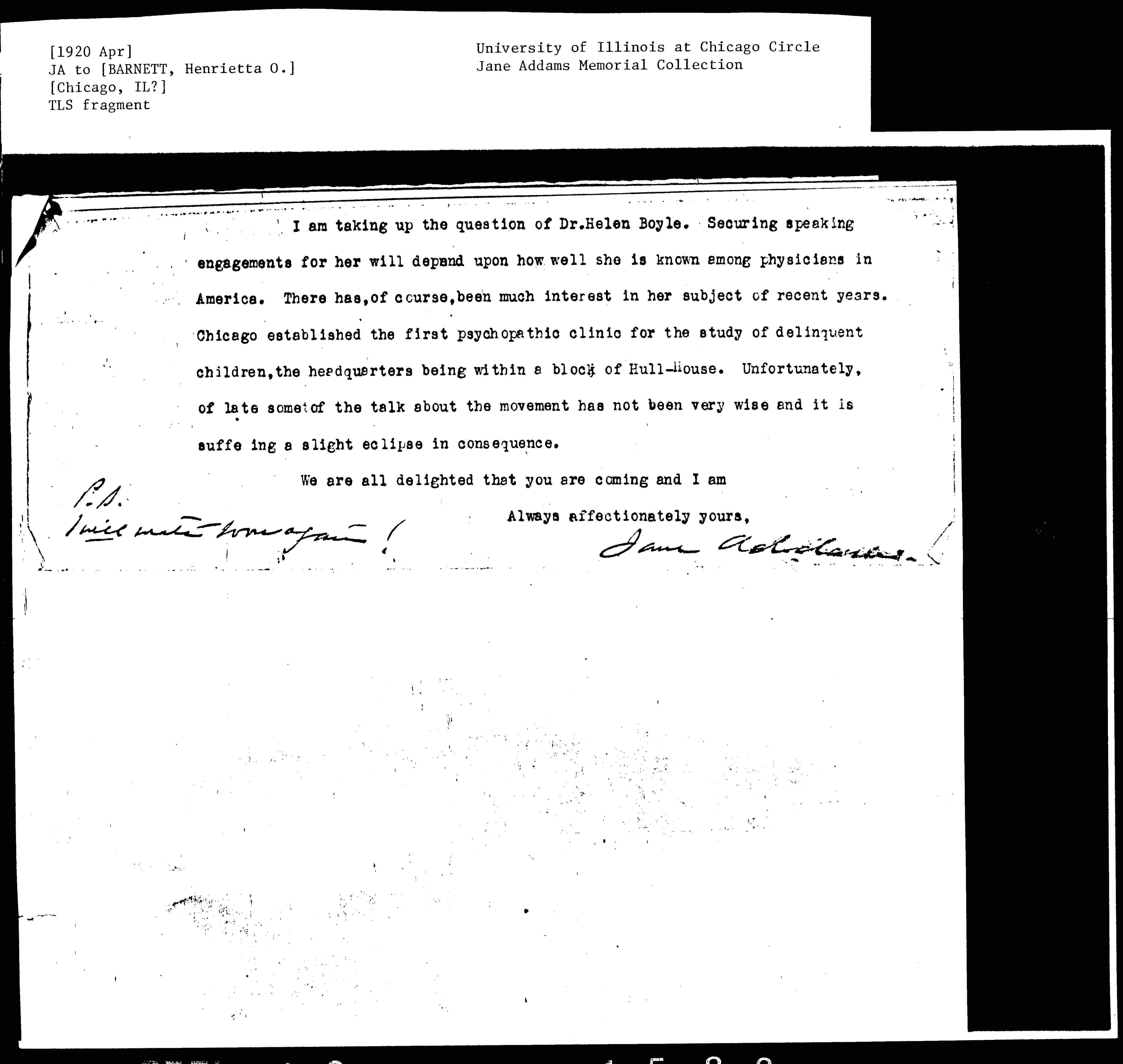 [page(s) missing] I am taking up the question of Dr. Helen Boyle. Securing speaking engagements for her will depend upon how well she is known among physicians in America. There has, of course, been much interest in her subject of recent years. Chicago established the first psychopathic clinic for the study of delinquent children, the headquarters being within a block of Hull-House. Unfortunately, of late some of the talk about the movement has not been very wise and it is suffering a slight eclipse in consequence.