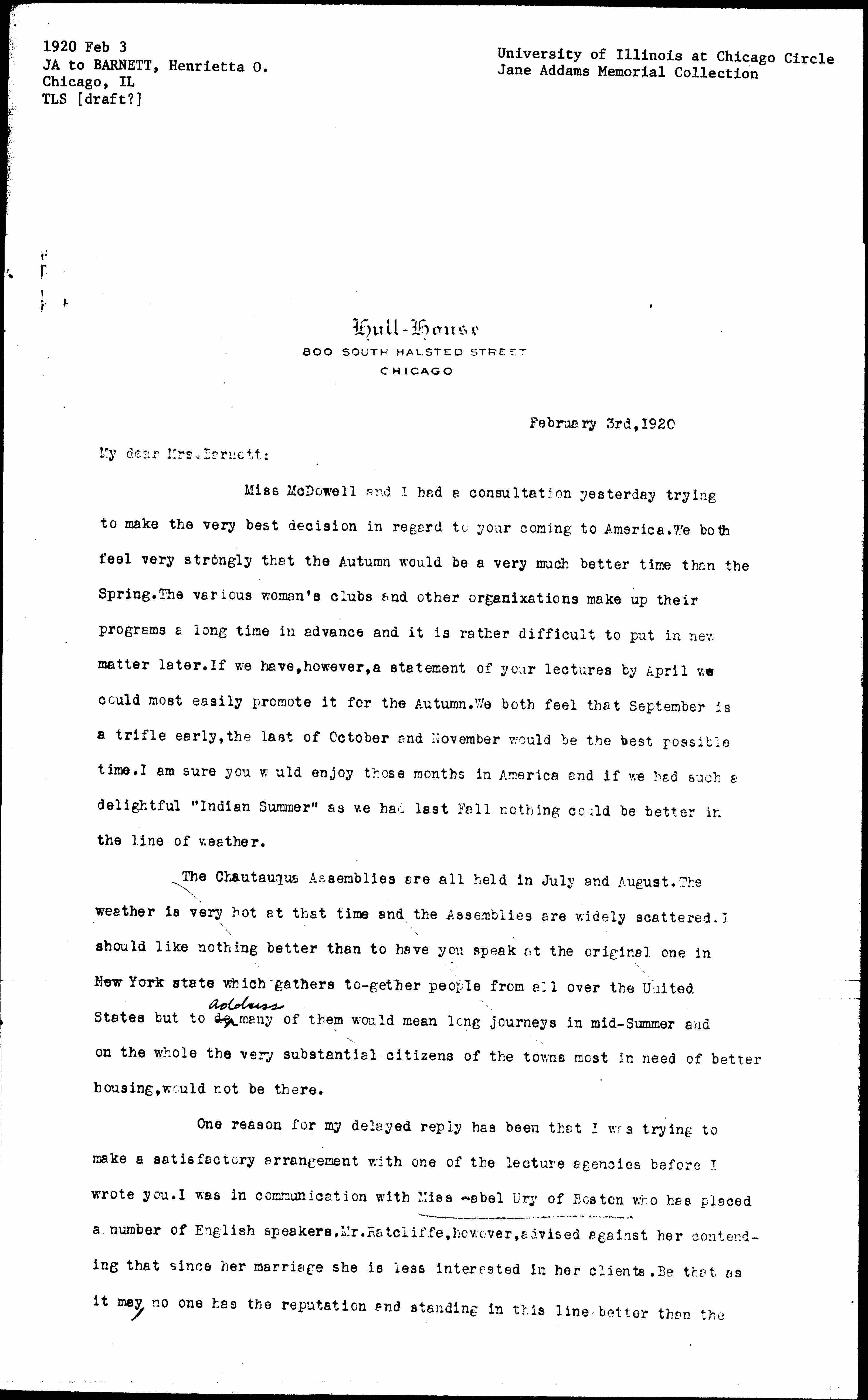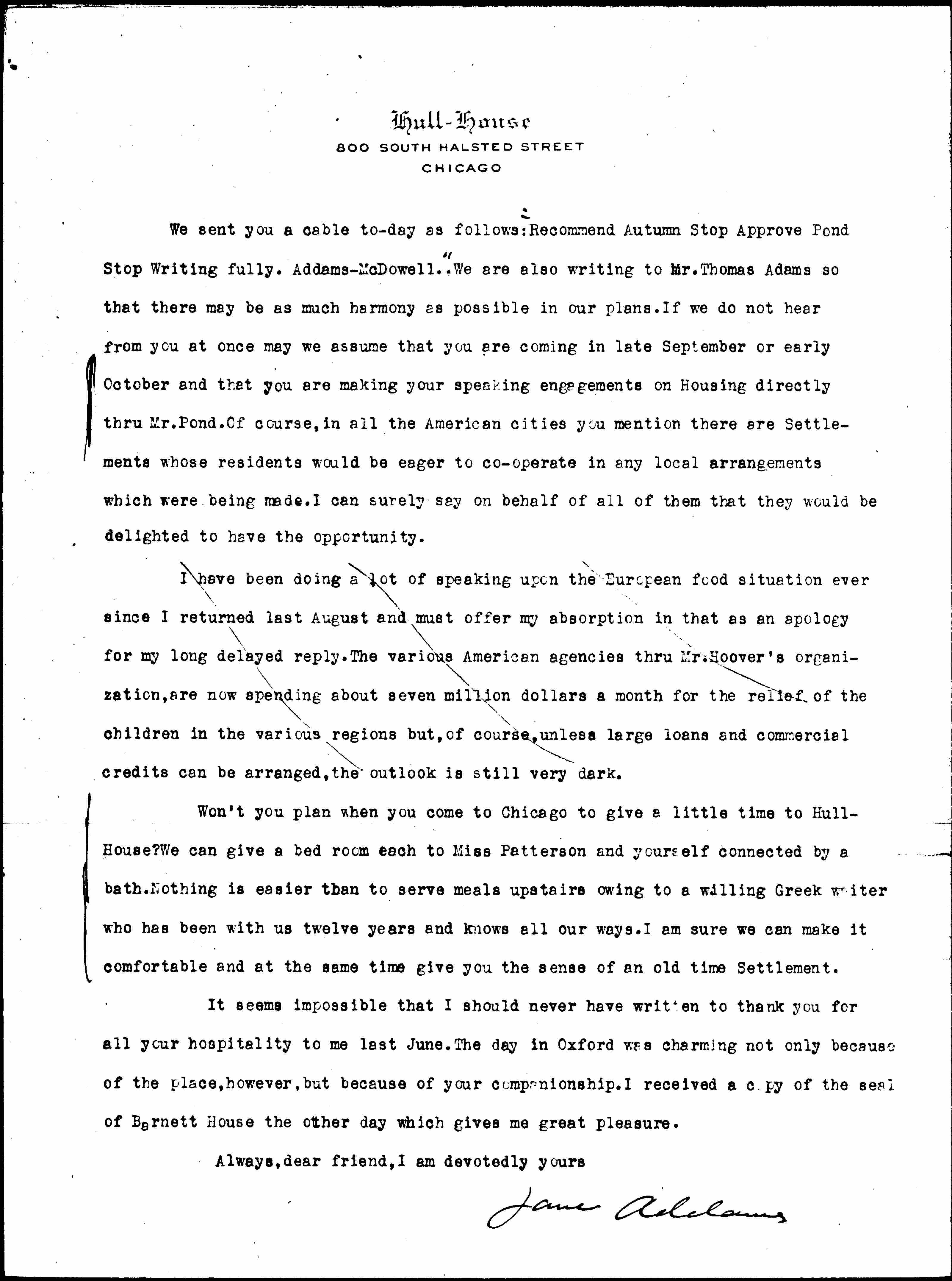 We sent you a cable [today] as follows: "Recommend Autumn. Approve Pond. Writing fully. Addams-McDowell." We are also writing to Mr. Thomas Adams so that there may be as much harmony as possible in our plans. If we do not hear from you at once may we assume that you are coming in late September or early October and that you are making your speaking engagements on Housing directly [through] Mr. Pond. Of course, in all the American cities you mention there are Settlements whose residents would be eager to [cooperate] in any local arrangements which are being made. I can surely say on behalf of all of them that they would be delighted to have the opportunity.